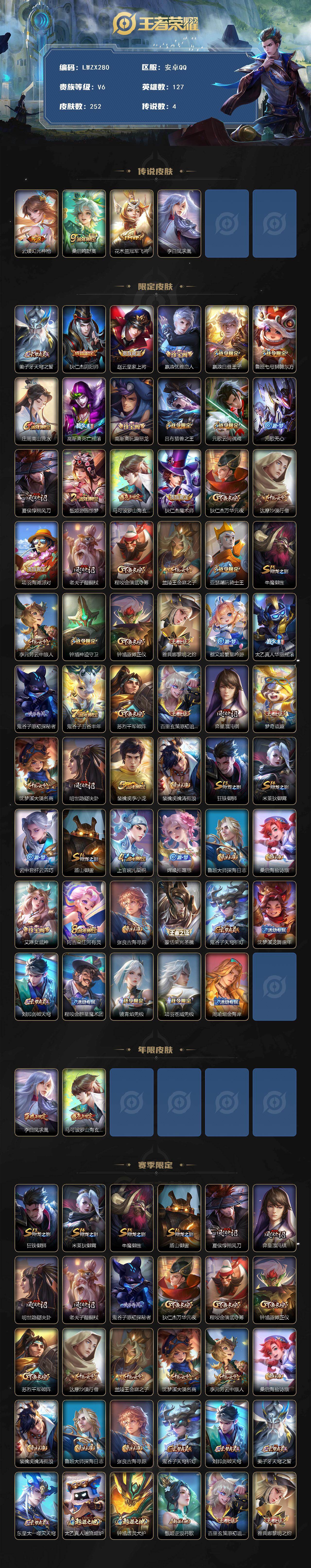 【特价出售/店主推荐】安卓Q-V6-至尊星耀V段位-127英雄-252皮肤-4传说-54史诗