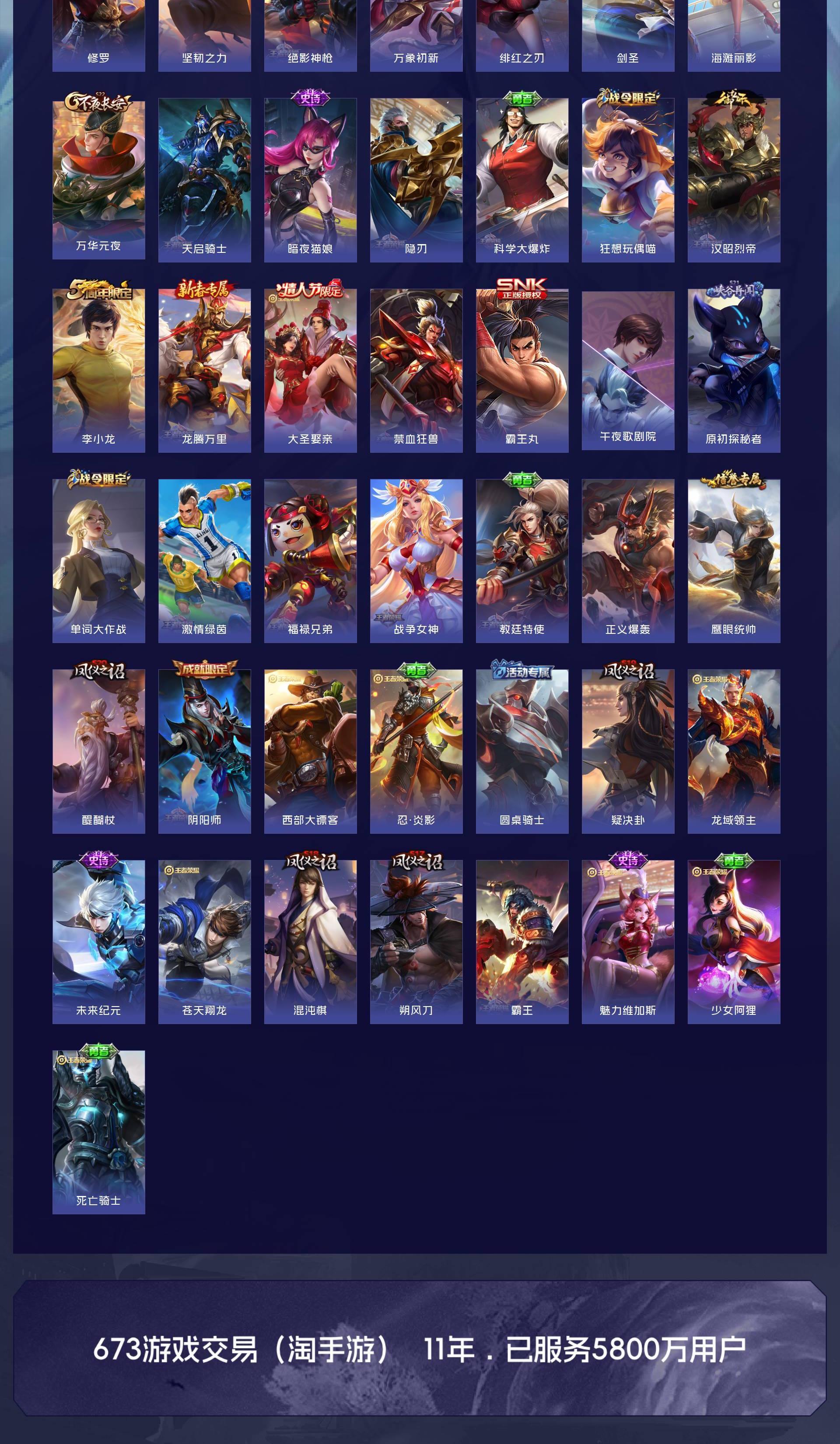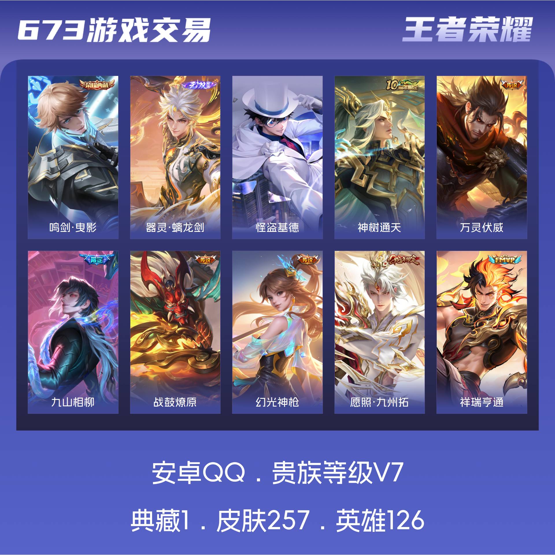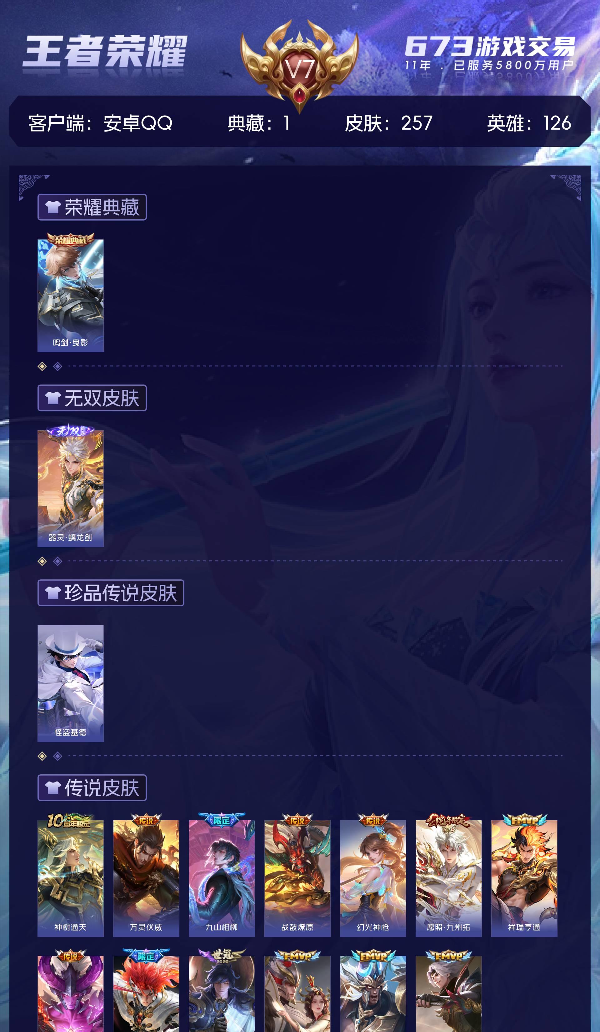 安卓QQ/至尊星耀/257皮肤/126英雄/1典藏/0珍品无双/1无双/1珍品传说/13传说/73史