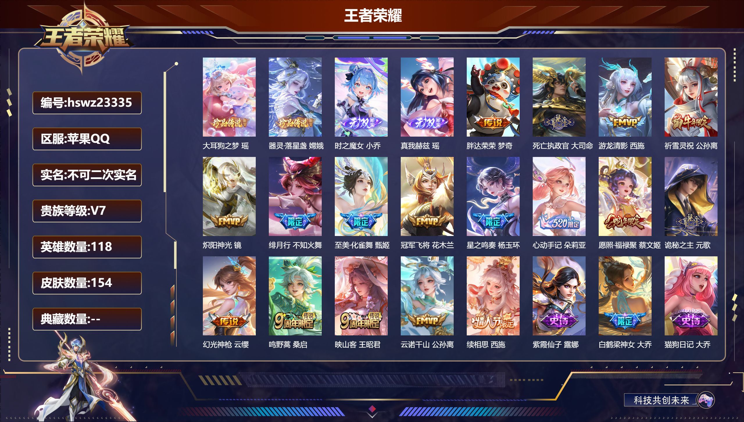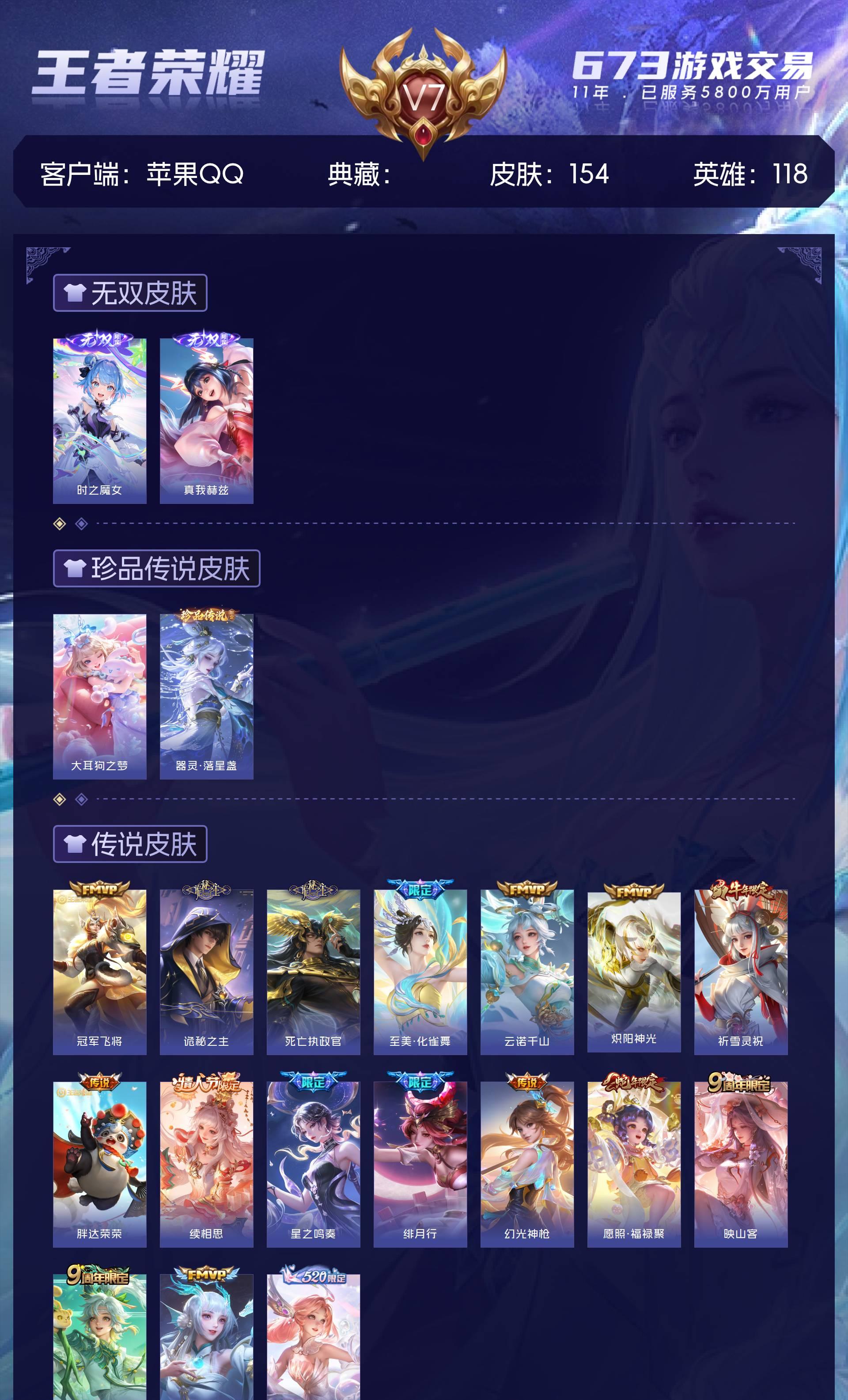 苹果QQ/永恒钻石/154皮肤/118英雄/0典藏/0珍品无双/2无双/2珍品传说/17传说/46史