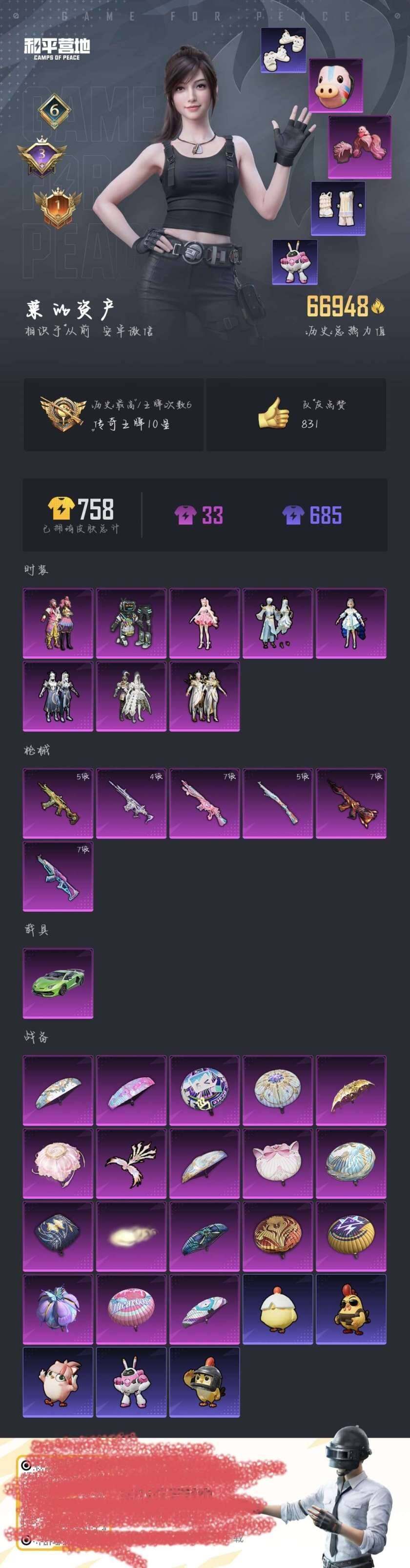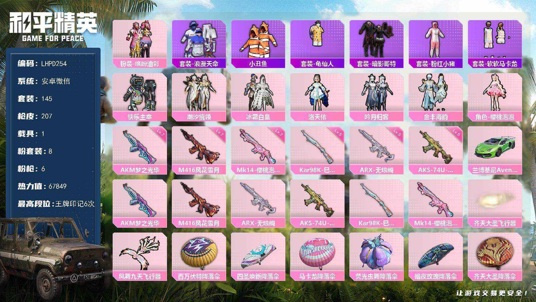 【特价出售/店主推荐】安卓 微信-8粉装-6特效枪-1载具-2粉色飞行器-67849热力值-6王牌印记-145套装-207枪皮【热门品类】:粉装-缤纷油彩,套装-浪漫天命,套装-小丑鱼,套装-龟仙人,套装-暗影哥特,套装-粉红小猪,套装-软软马卡龙【粉色套装】:粉装-快乐主宰,粉装-缤纷油彩,粉装-潮汐统领,粉装-冰霜白皇,角色-洛天依,粉装-吟月归客,粉装-金丰海韵,角色-樱桃泡泡【粉色枪皮等