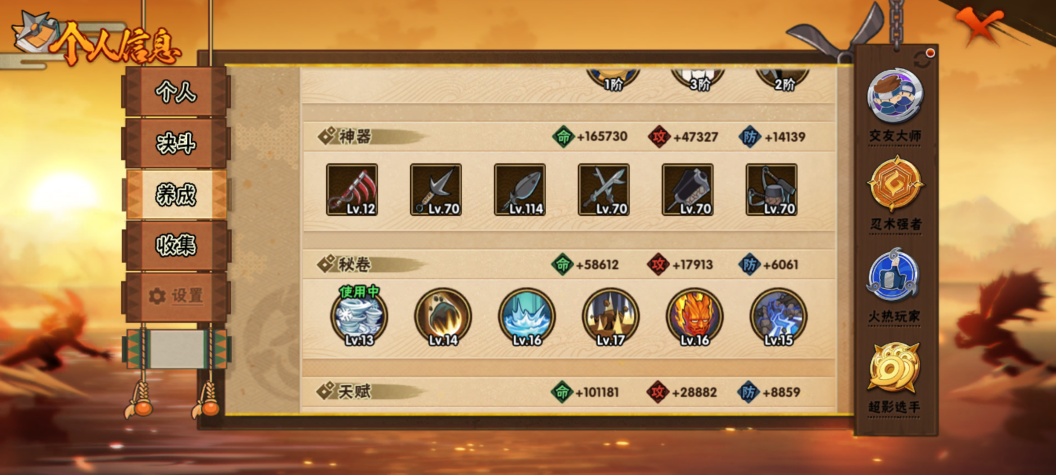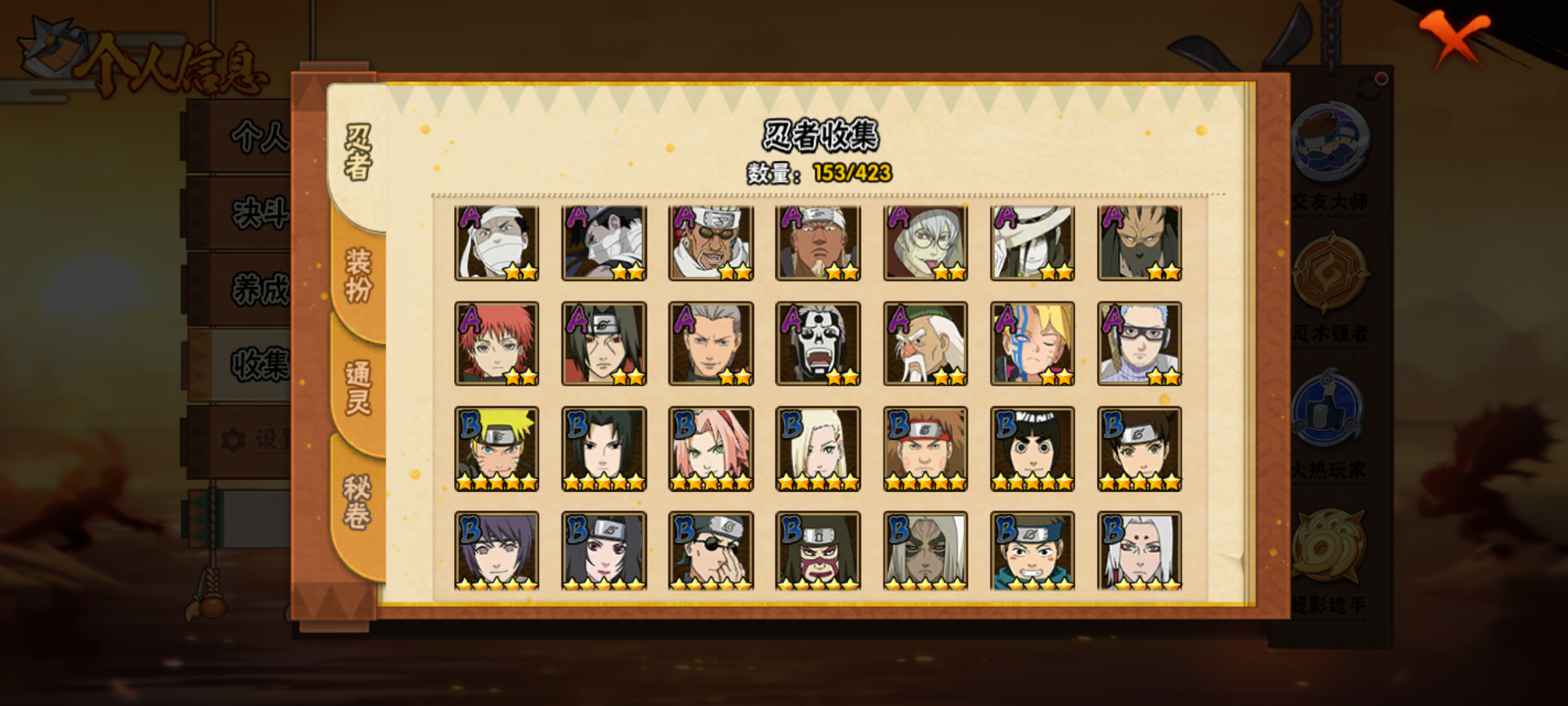 WLHY528【区服】2790【等级】147【S级数量】11【A级数量】31【B级数量】61【C级数量】50【S级】大蛇丸 波风水门 漩涡鸣人·宇智波佐助 宇智波鼬「须佐能乎」 宇智波斑「秽土转生·解」 宇智波佐助「永恒万花筒」 旗木卡卡西「须佐能乎」 自来也「舞之豪杰」 艾「忍界大战」 佩恩「天道」 漩涡鸣人「九喇嘛连结」【A级】蝎 奇拉比 宇智波鼬 宇智波佐助「须佐能乎」 宇智波佐助「万花筒写轮眼」 秋道丁次「忍界大战」 桃地再不斩 宇智波佐助「疾风传咒印」 宇智波止水 日向宁次「忍界大战」