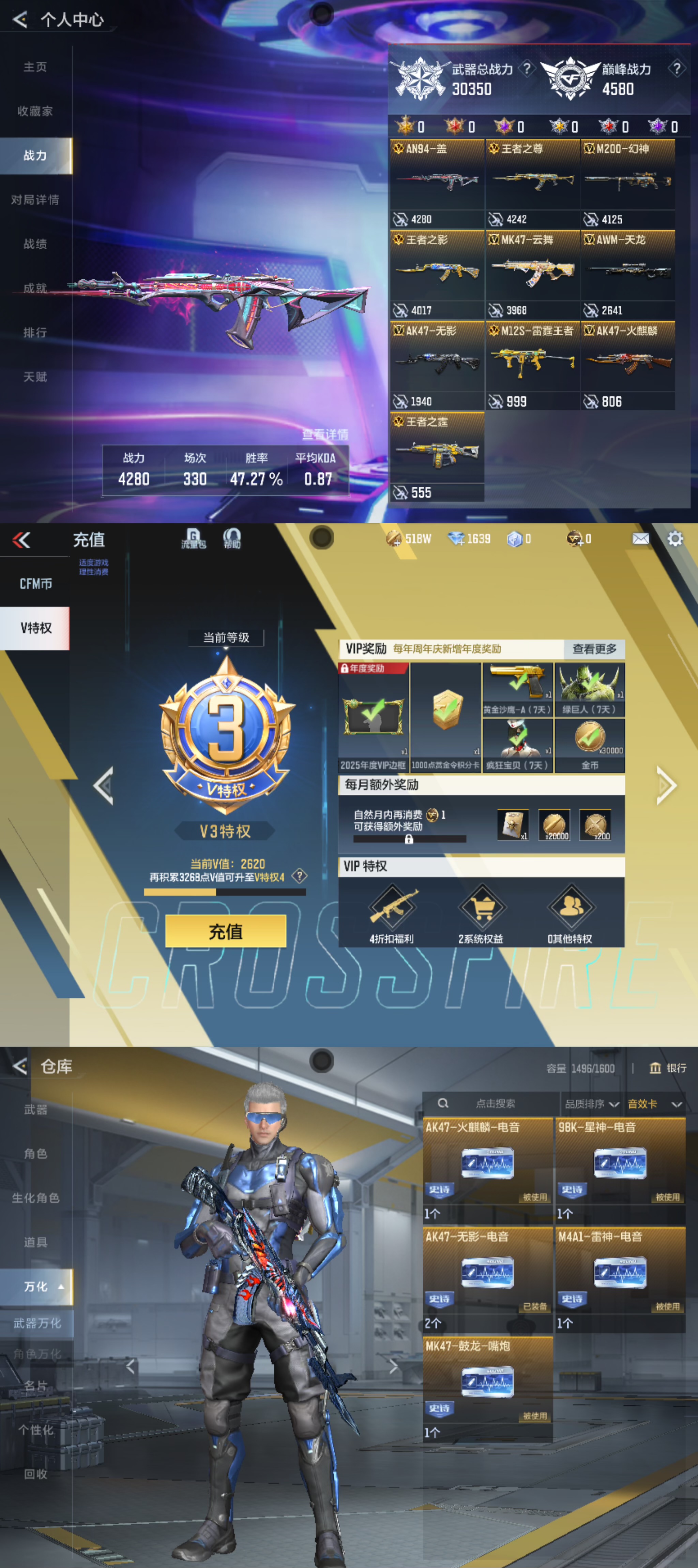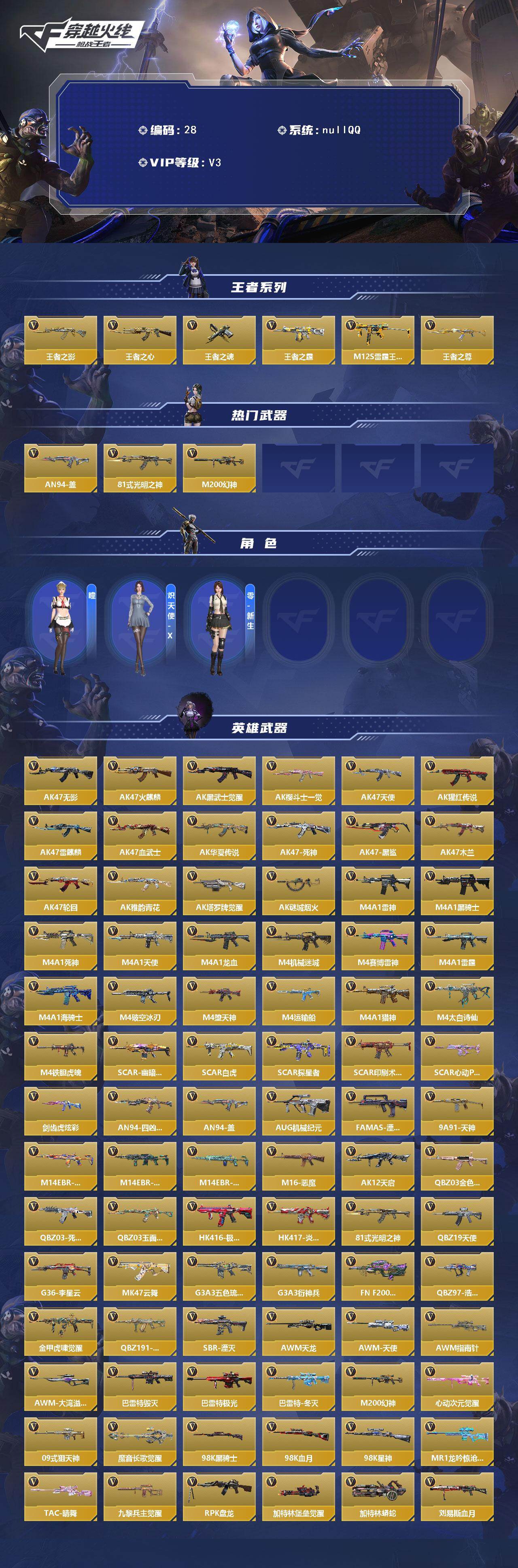 XXQZ61【V3 329V 王者之影/心/魂/霆/尊 雷霆王者 盖 幻神 光明神 炫彩剑齿虎】【等级】98【区服】手Q-苹果【金角色数】2【金武器数】270【金V角色】零 关小雨【金V武器】AK47-木兰 唐刀-大唐荣耀 神罚战斧 神罚战斧 AWM-天使 改装GLOCK-木兰 M4A1-海骑士 加特林-堡垒 M4A1-猎神 KSG-极光 SCAR-心动PICK SCAR Light-白虎 M4A1-死神 加特林-堡垒 HK416-极光 AK47-华夏传说 剑齿虎-炫彩 尼泊尔-铜头铁臂 USP
