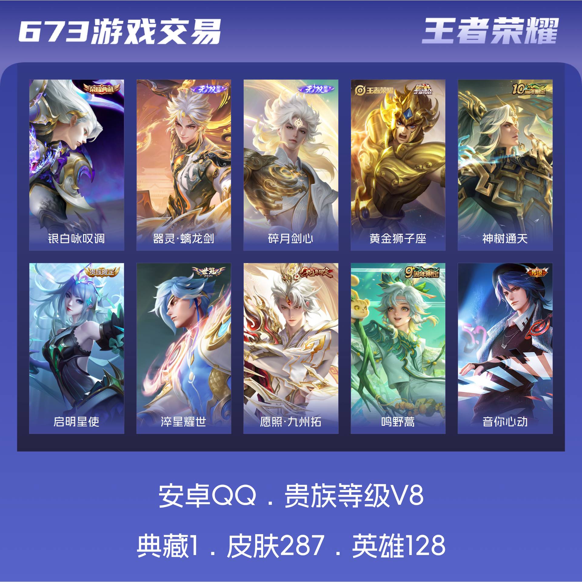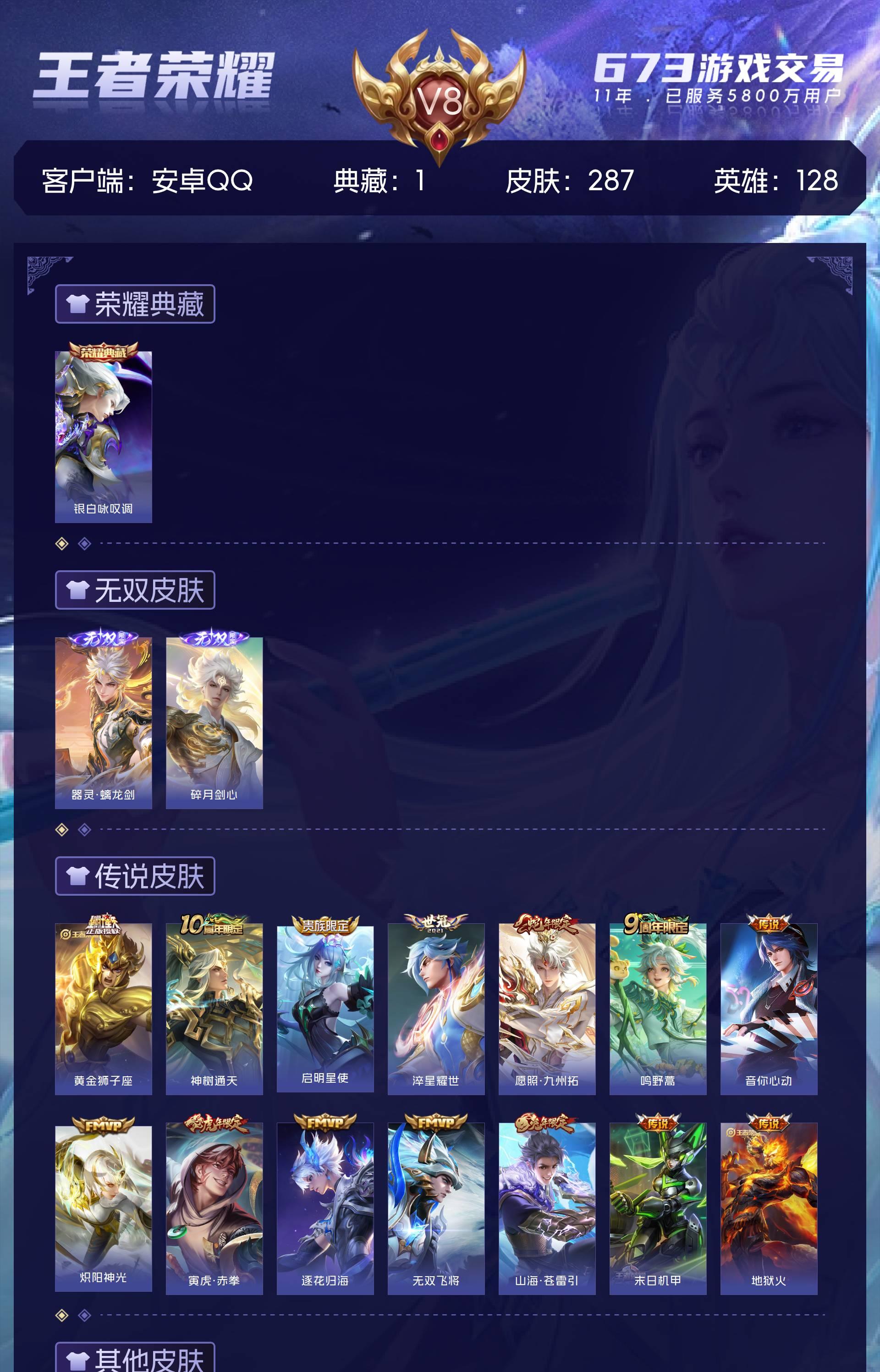安卓QQ/最强王者/287皮肤/128英雄/1典藏/0珍品无双/2无双/0珍品传说/14传说/66史