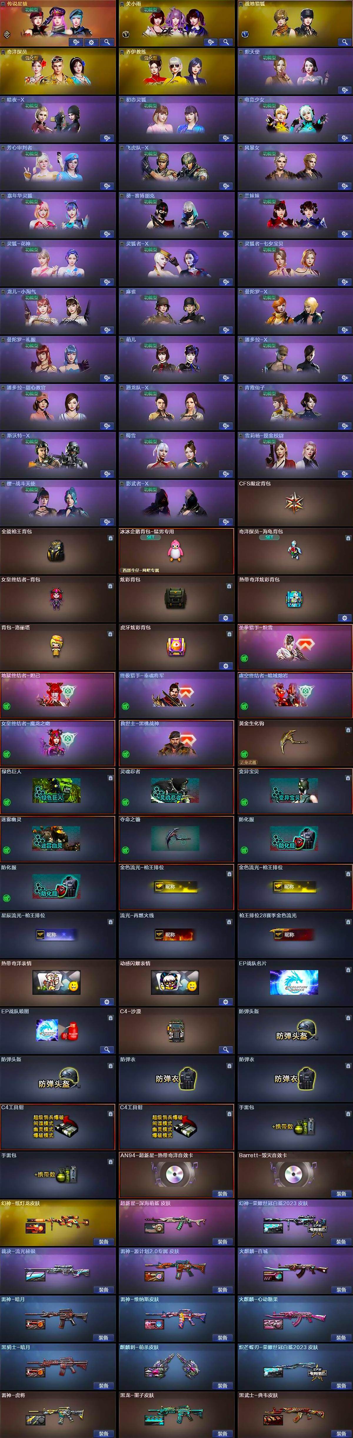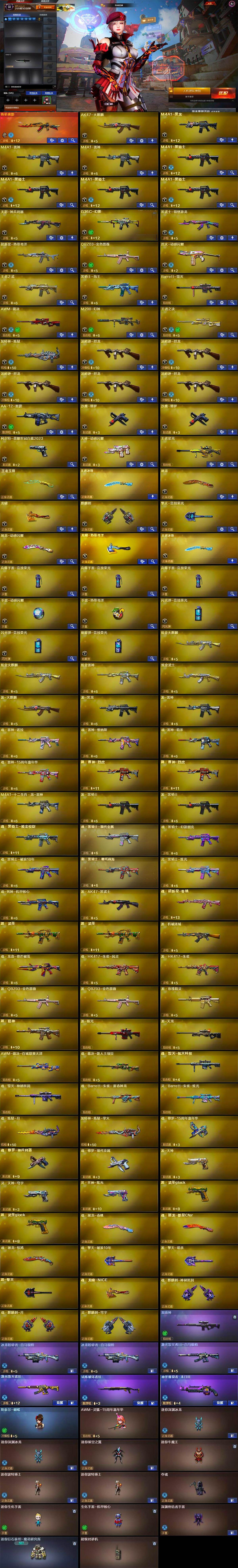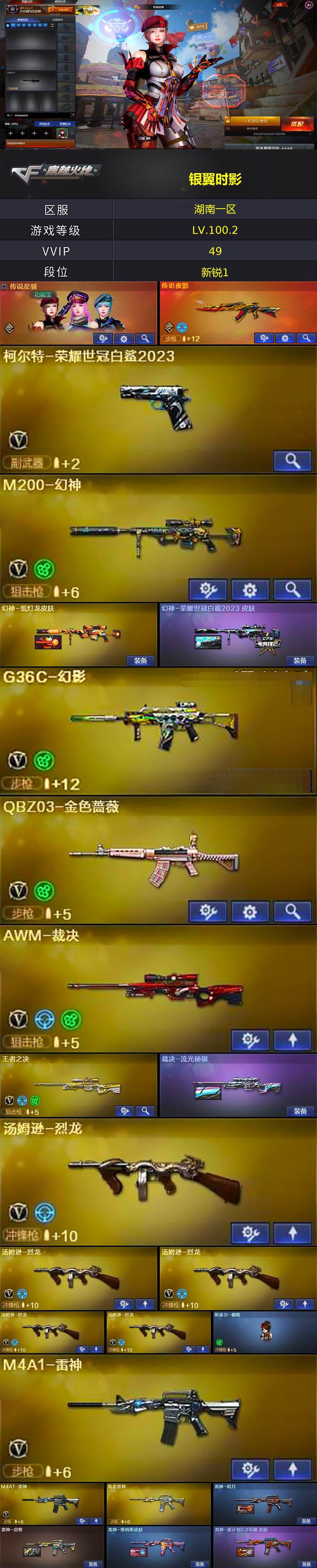 【热门武器】:传说夜影,G36C-幻影,QBZ03-金色蔷薇,M200-幻神,柯尔特-荣耀世冠白鲨2023,M4A1-黑骑士*4,汤姆逊-烈龙*5,加特林-炼狱,斯泰尔-蝴蝶,羊驼玩偶,沙鹰-修罗*2,炽芒蝶刃-荣耀世冠白鲨2023 皮肤