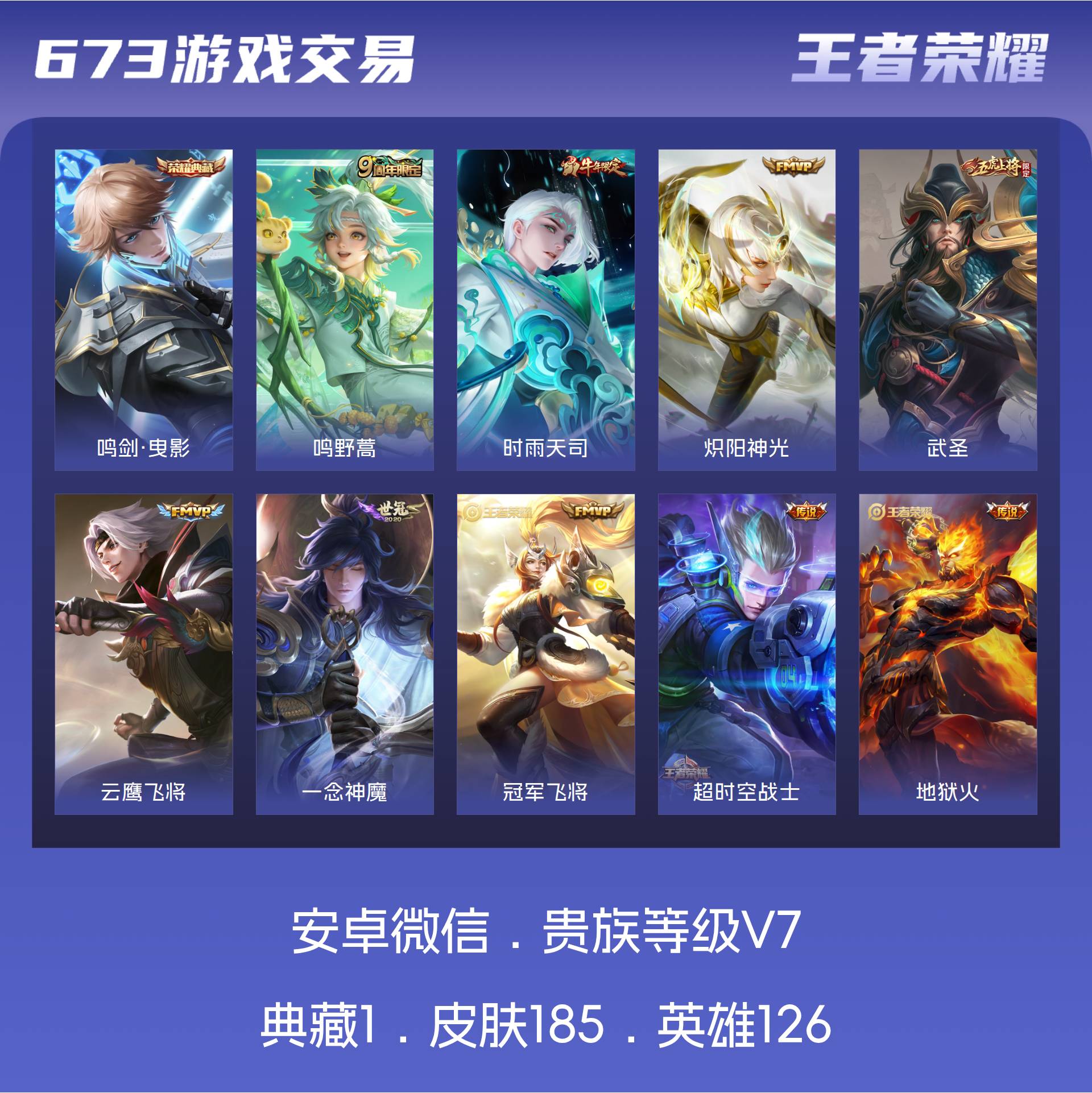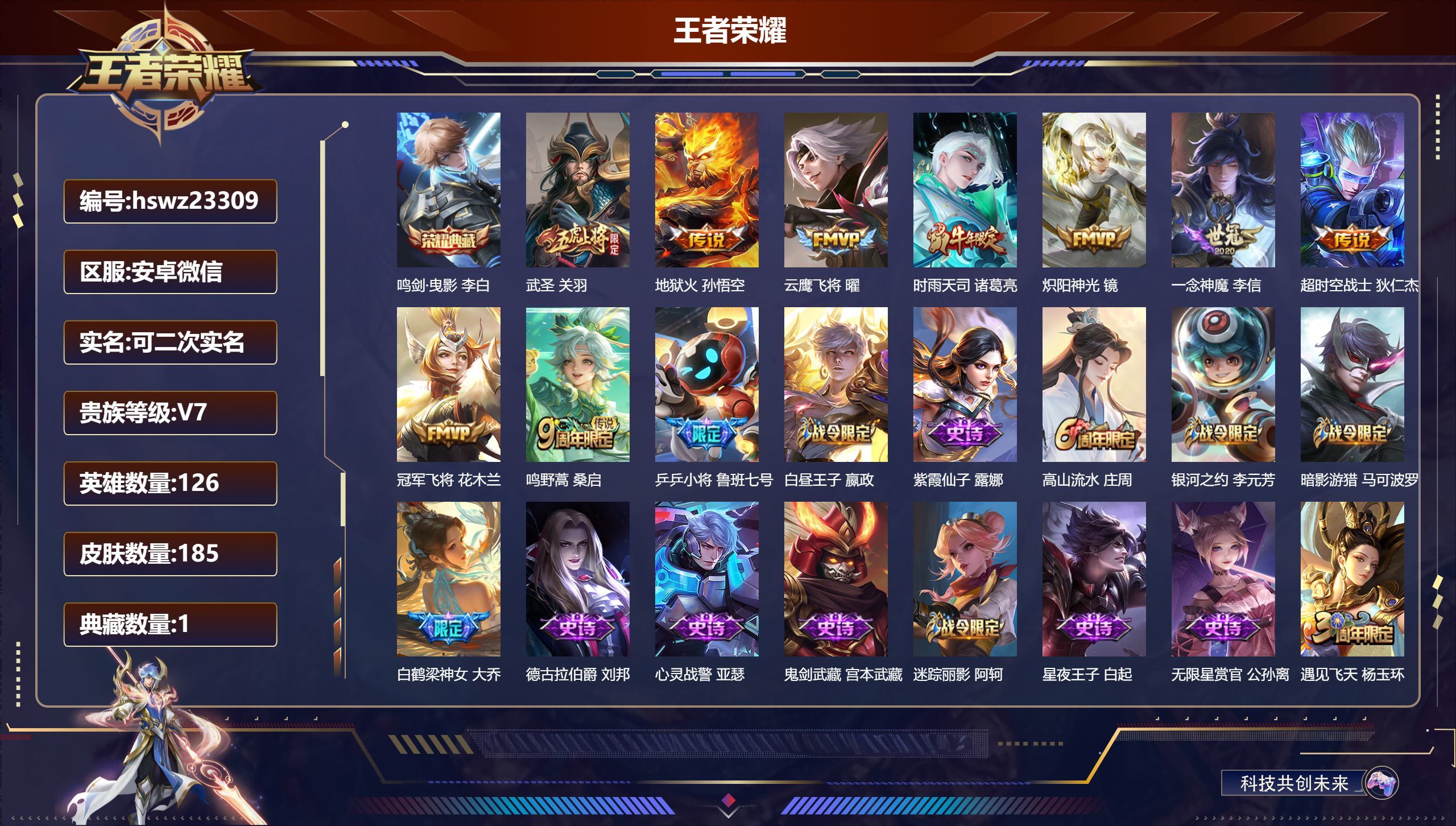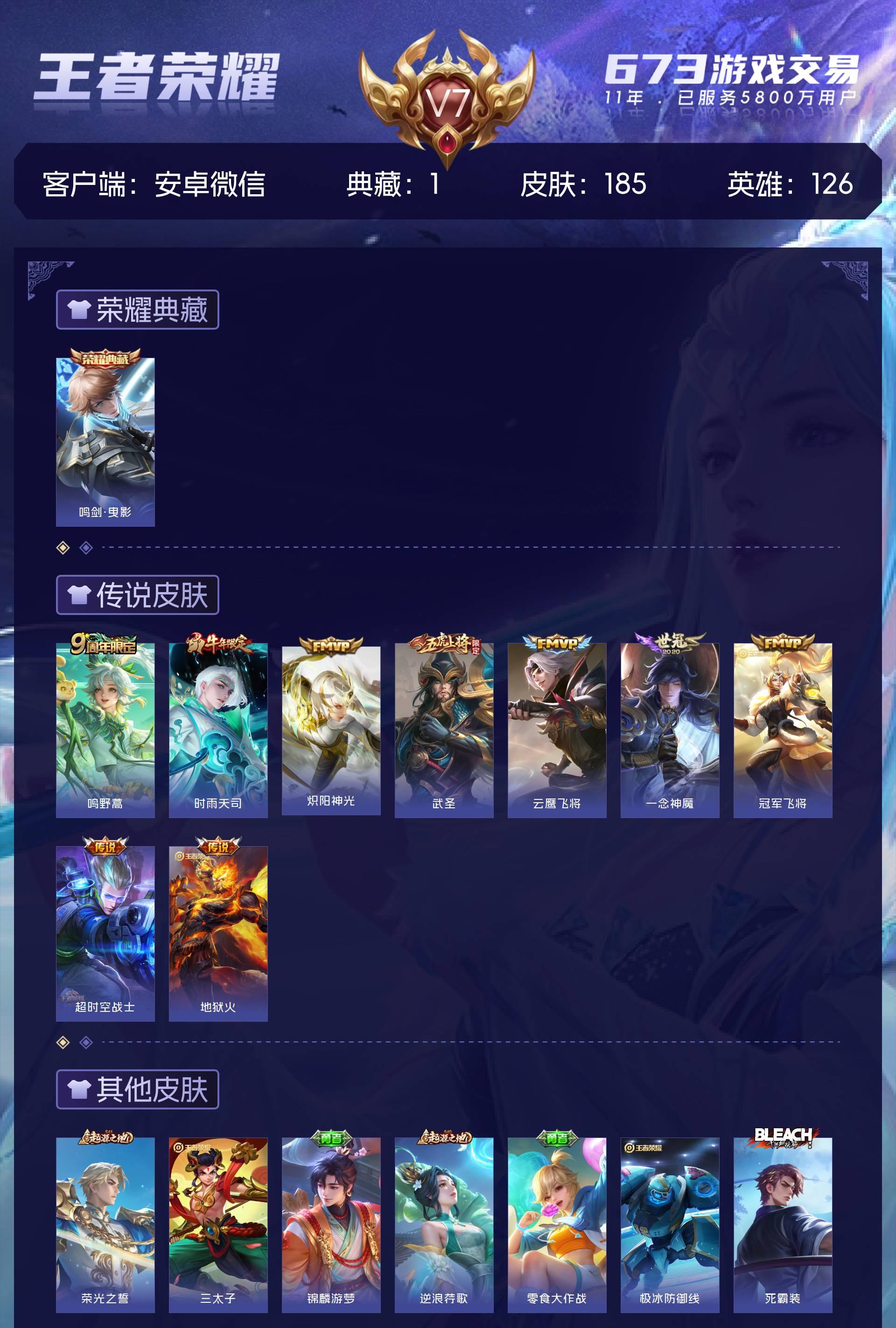 安卓微/尊贵铂金/185皮肤/126英雄/1典藏/0珍品无双/0无双/0珍品传说/9传说/59史诗