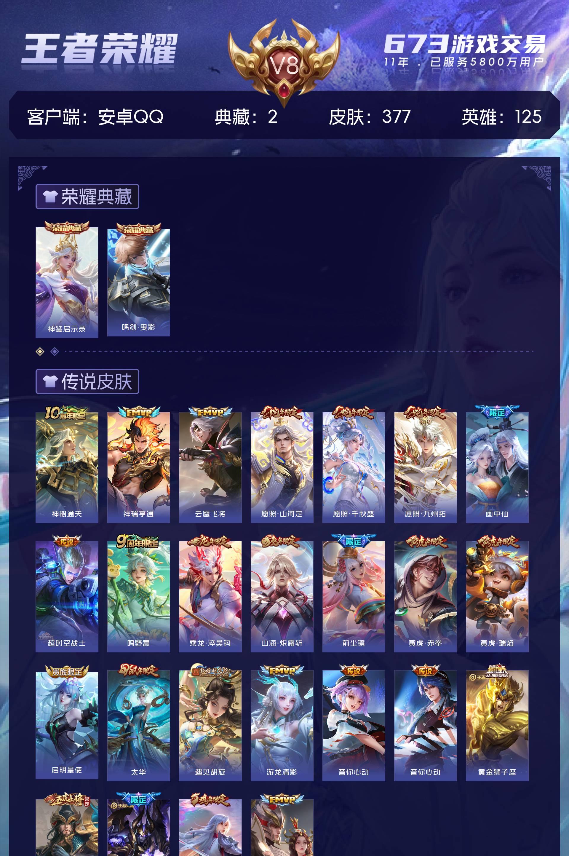安卓QQ/至尊星耀/377皮肤/125英雄/2典藏/0珍品无双/0无双/0珍品传说/26传说/114