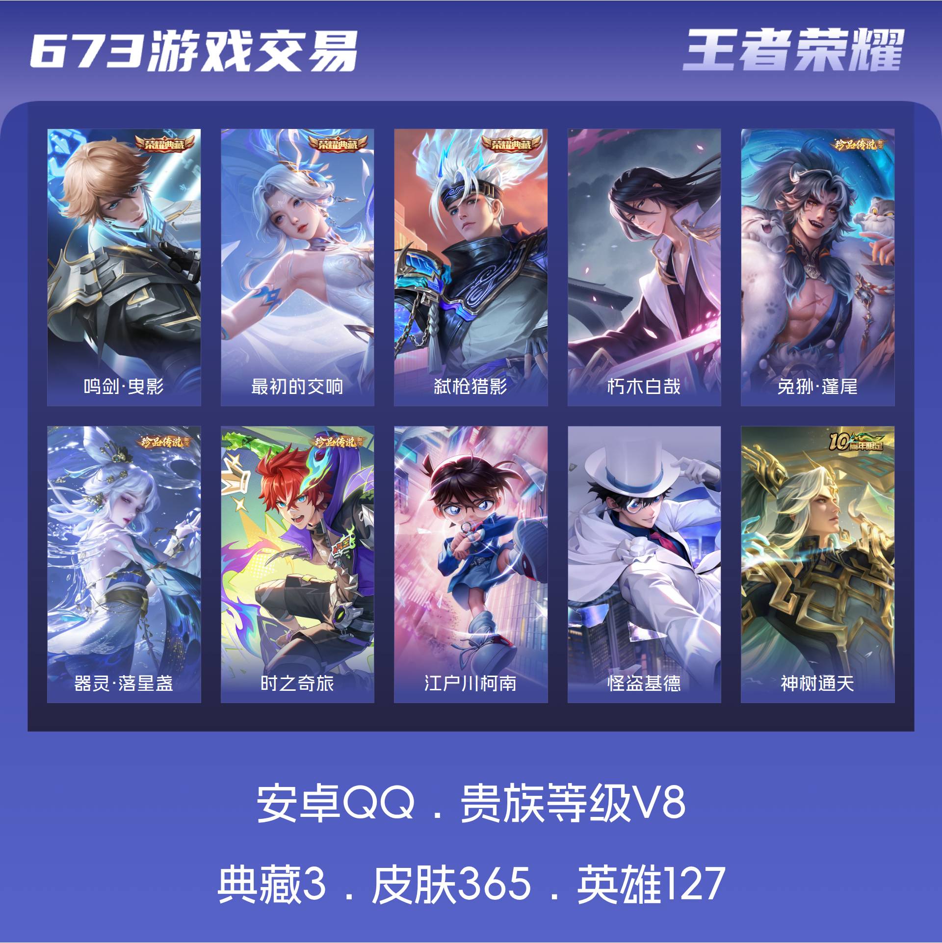 安卓QQ/至尊星耀/365皮肤/127英雄/3典藏/0珍品无双/0无双/6珍品传说/18传说/123