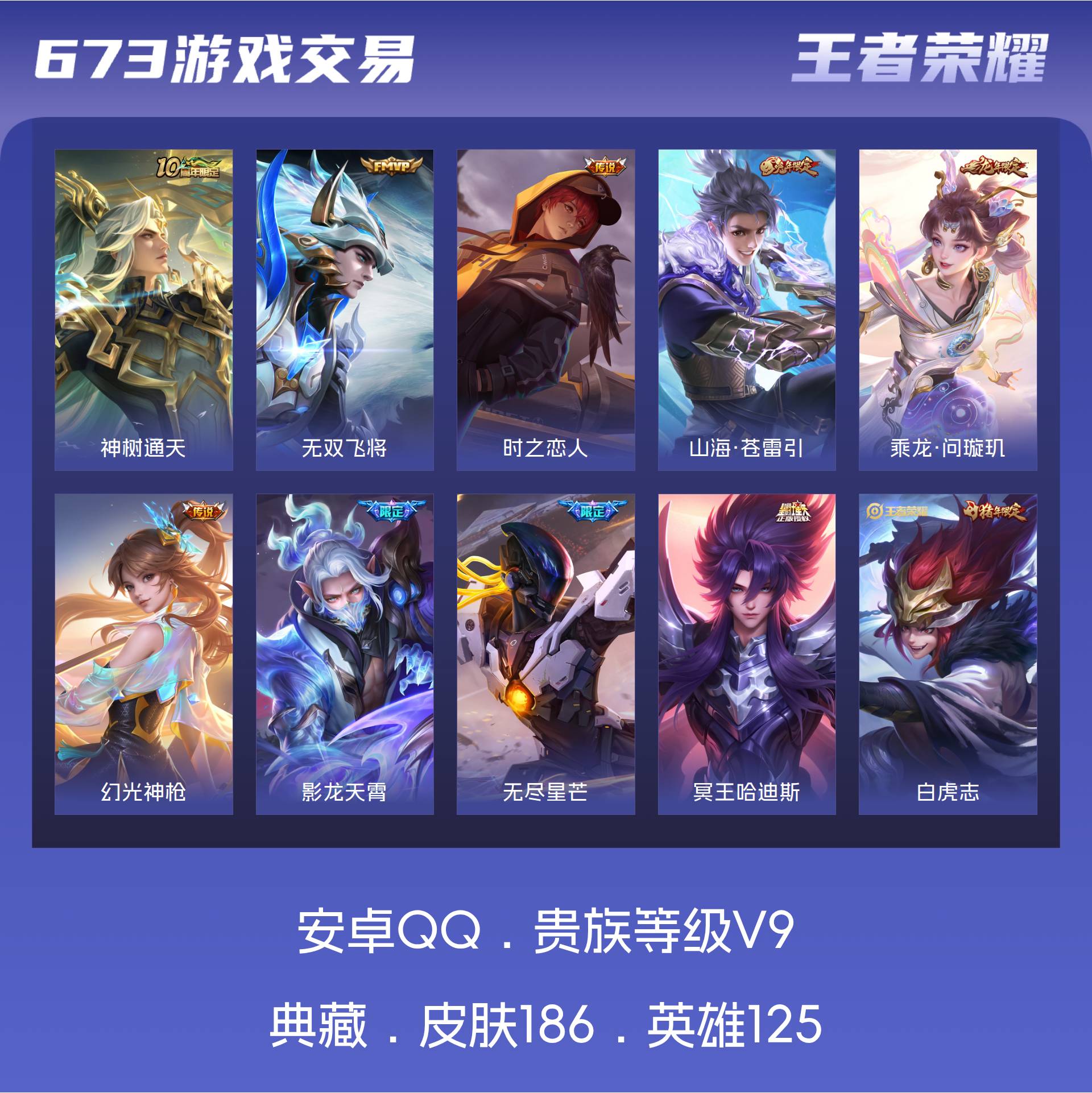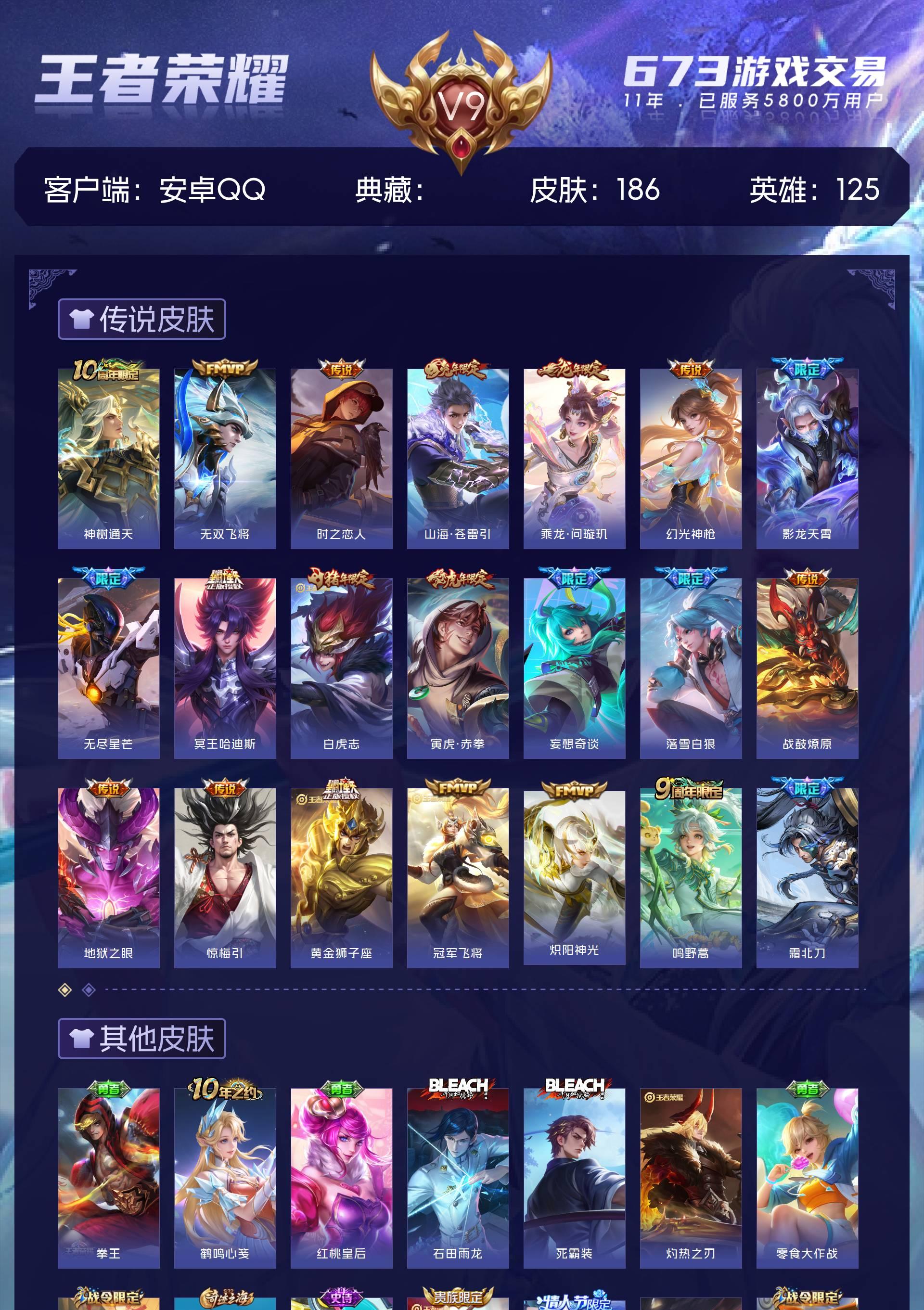 V9 皮肤186 英雄125 尊贵铂金 传说21 其他皮肤170