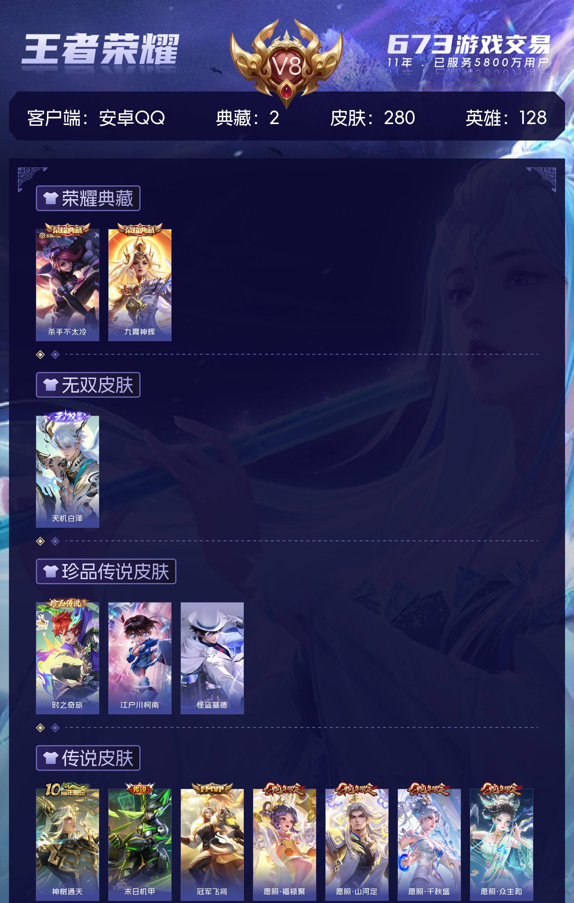 安卓QQ/永恒钻石/280皮肤/128英雄/2典藏/0珍品无双/1无双/3珍品传说/23传说/71史