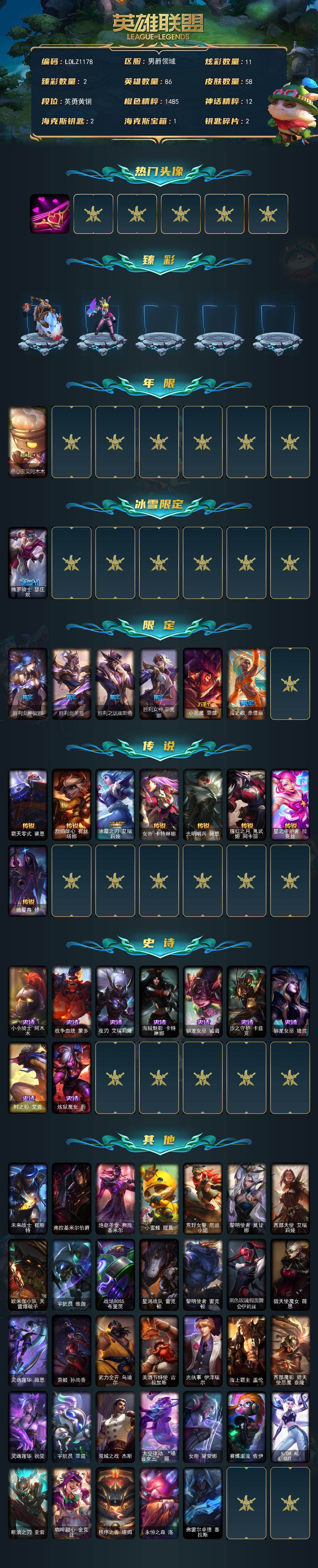 86英雄/58皮肤/8限定/2臻彩/11炫彩/8传说/9史诗/青铜/