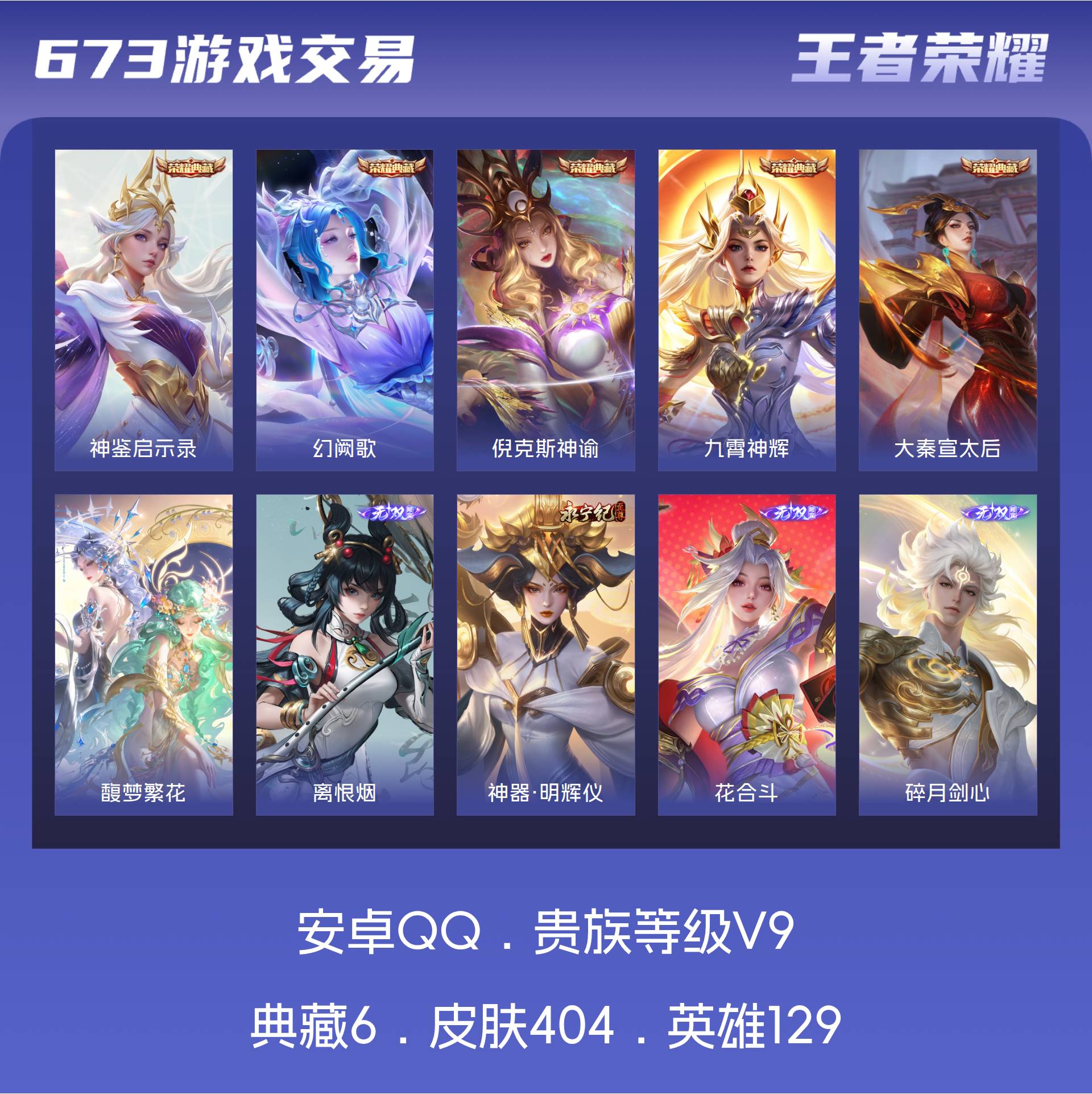 V9 皮肤404 英雄129 永恒钻石 荣耀典藏6 珍品无双1 无双皮肤4 传说29 其他皮肤372