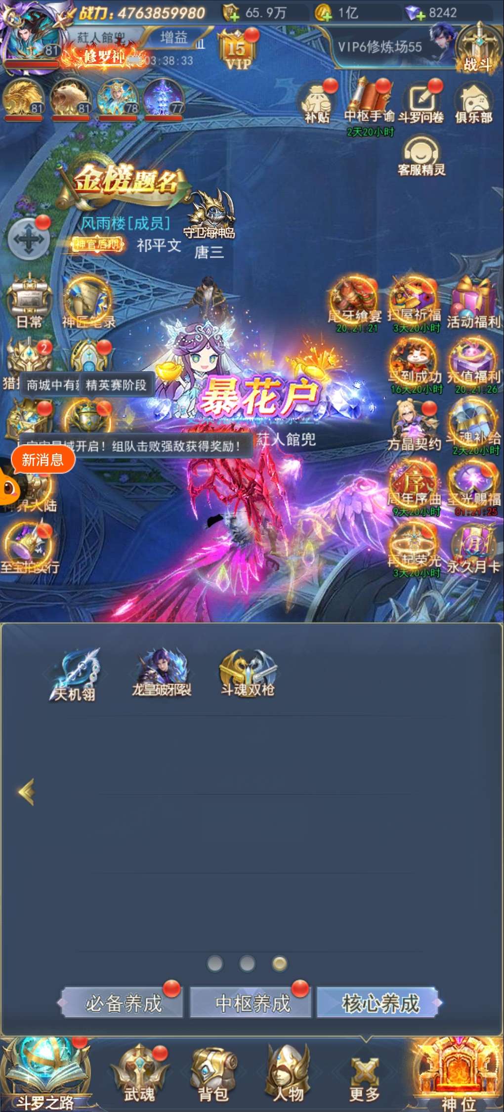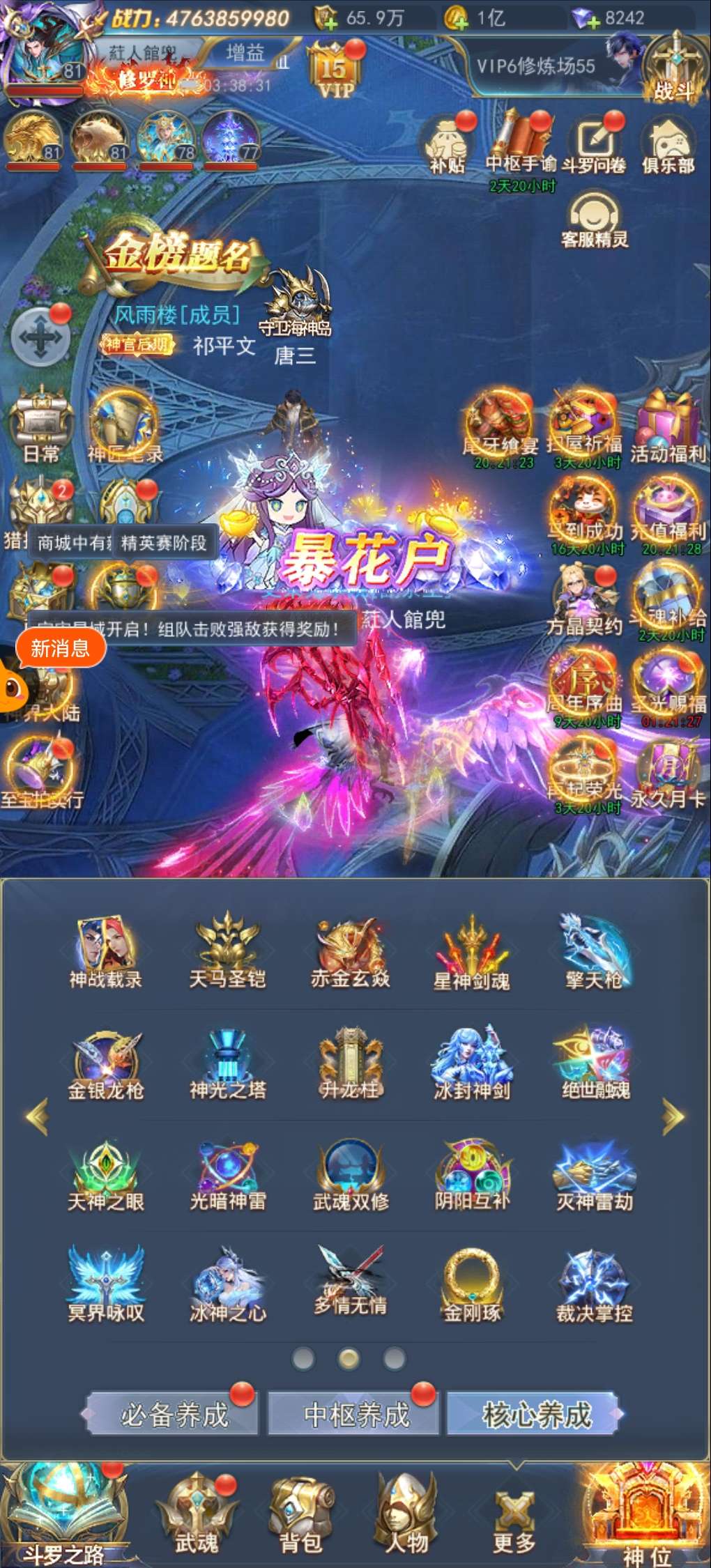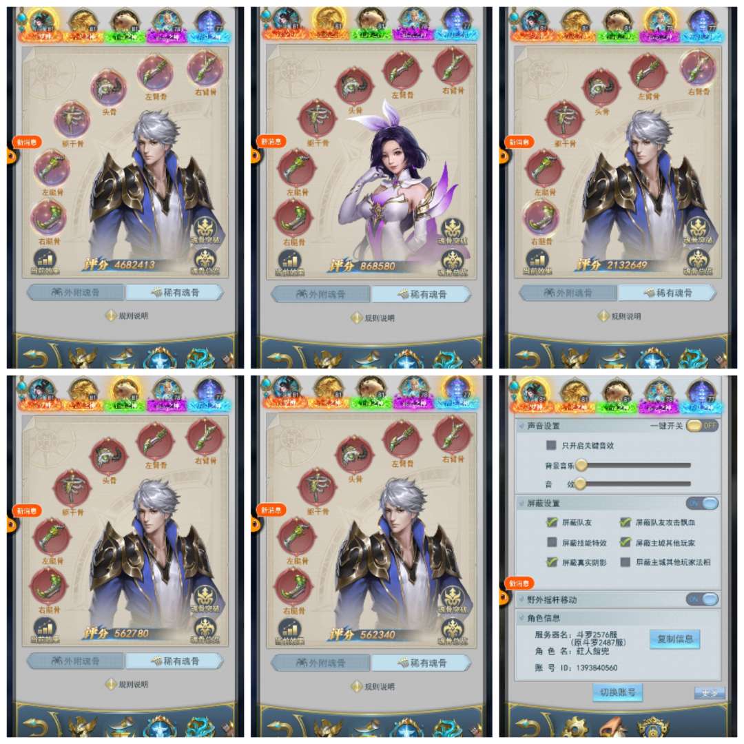 出斗罗服2576区,48亿战力彩,三神套,1彩4红魂骨,三套草皇,一套绝魂导器,满真身龙魂圣纹