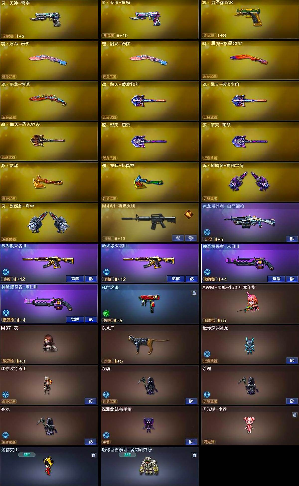 【热门武器】:QBZ03-金色蔷薇,HK417-朱雀,M200-幻神,金色蔷薇-古蛇迷踪,修罗-古蛇迷踪,死亡之眼,荣耀世冠-雷神,白虎-电玩蓝兔,金色小号,C.A.T,M4A1-黑骑士*2,汤姆逊-烈龙*3,加特林-炼狱*2,沙鹰-修罗*3