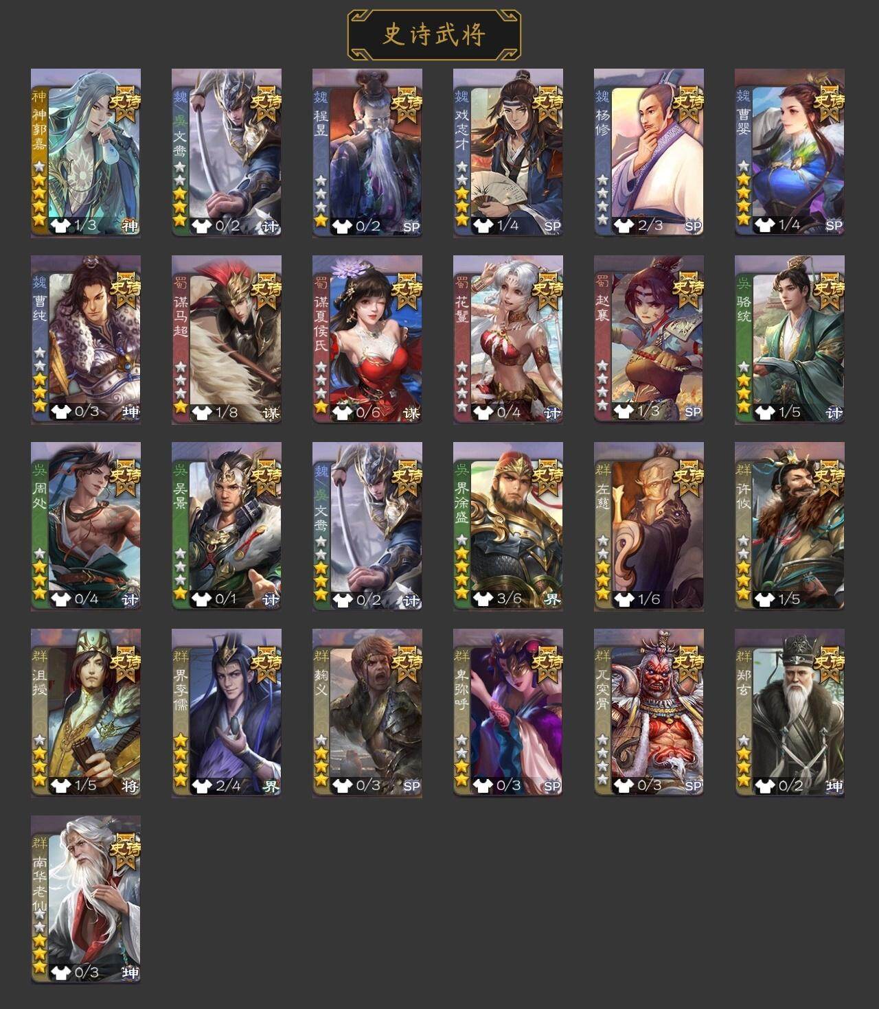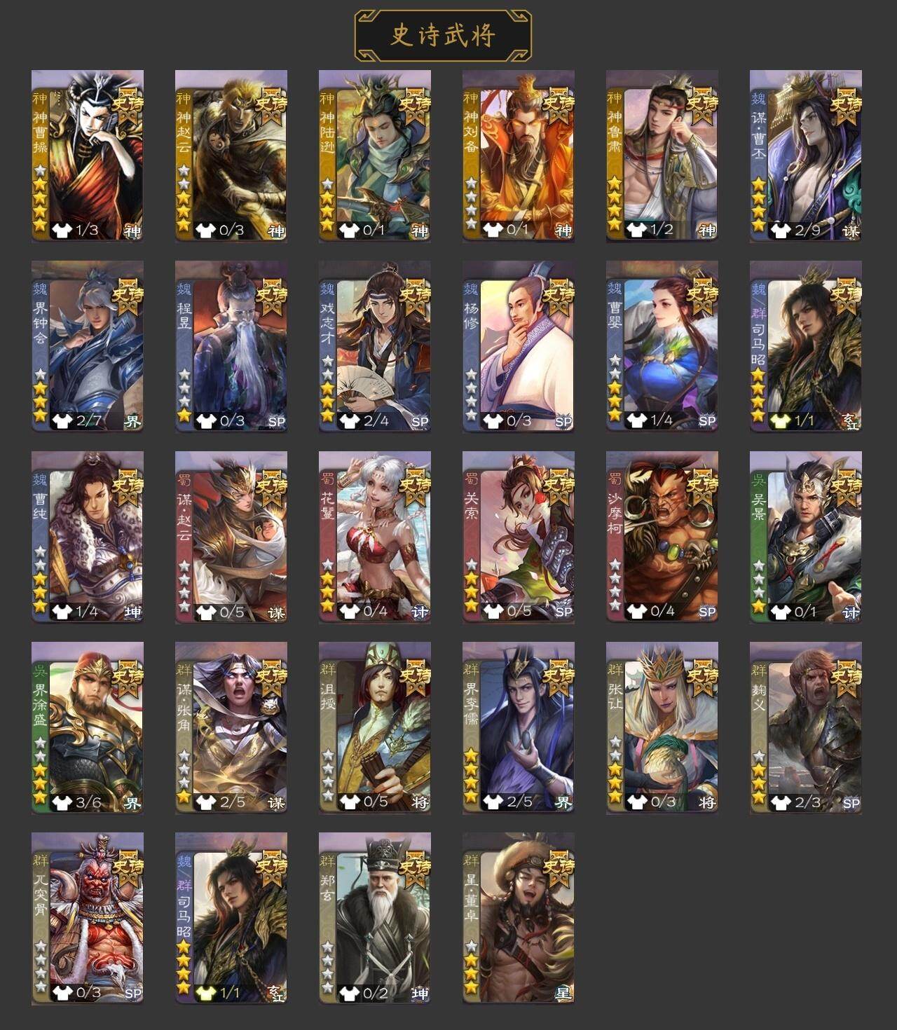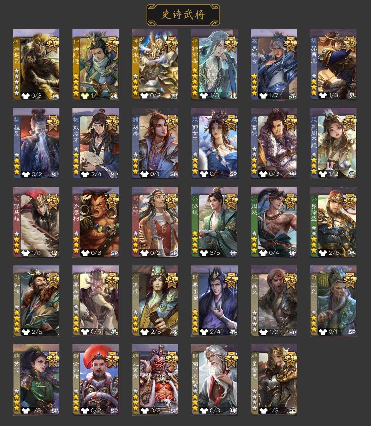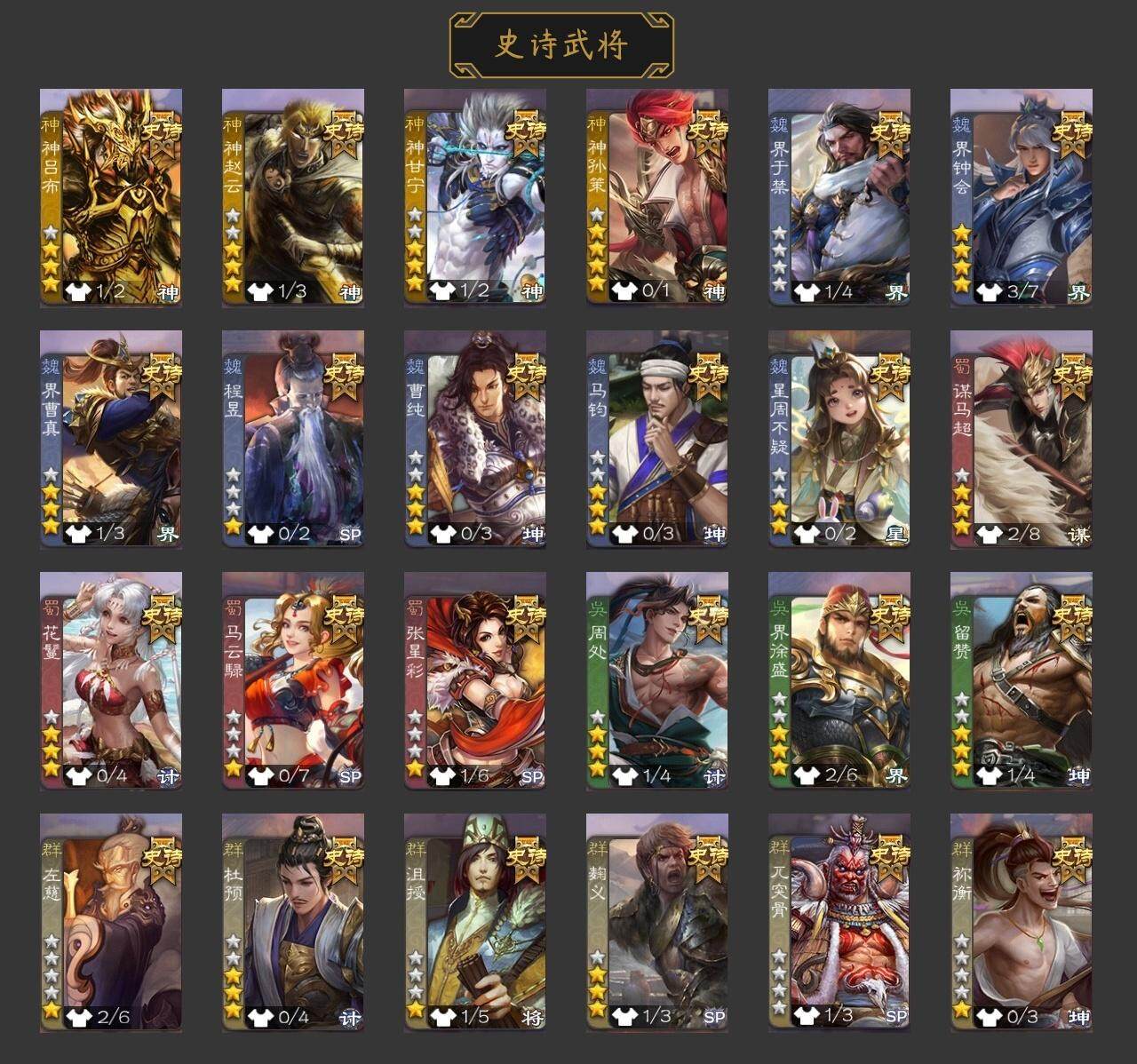神曹操,神赵云,神陆逊,神刘备,神鲁肃,杨修,界钟会,曹婴,曹纯,戏志才,谋曹丕,程昱,关索,谋赵云,沙摩柯,花鬘,吴景,界徐盛,郑玄,张让,麹义,沮授,界李儒,谋张角,星董卓,
