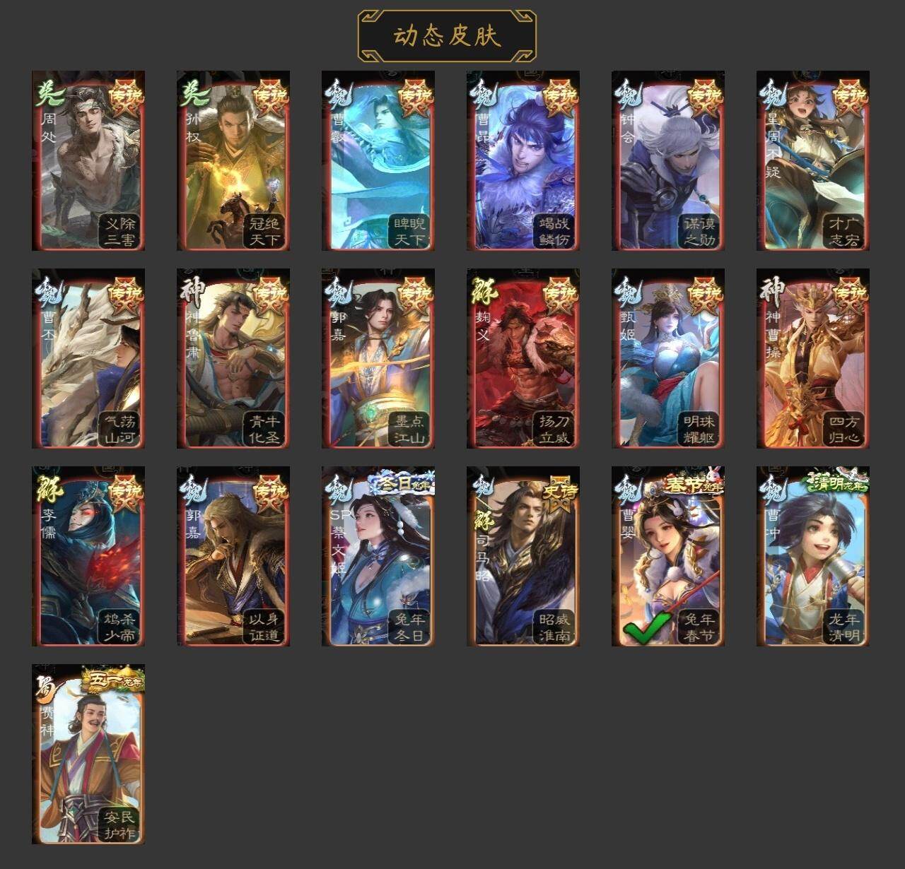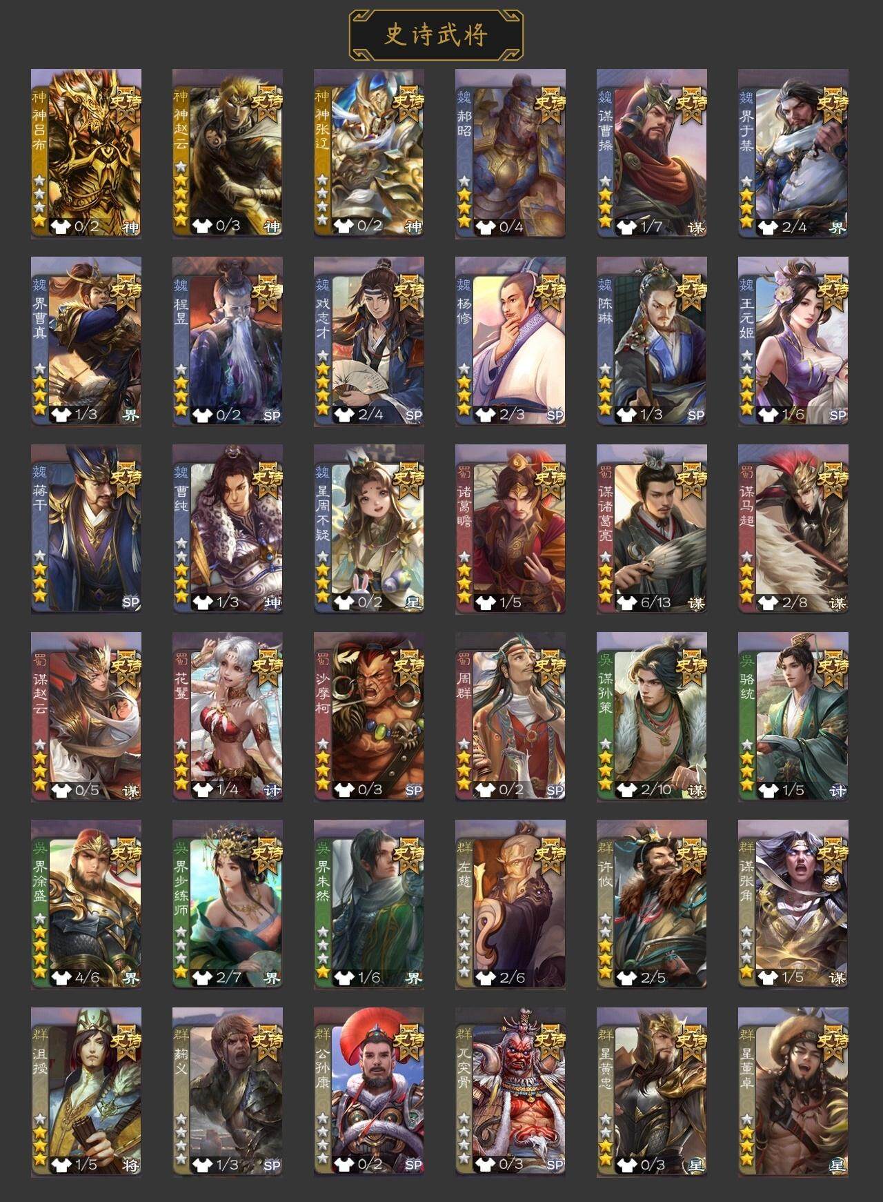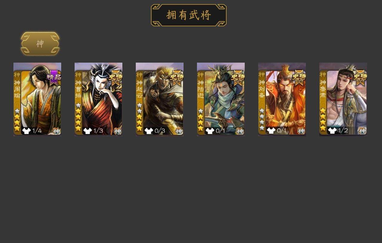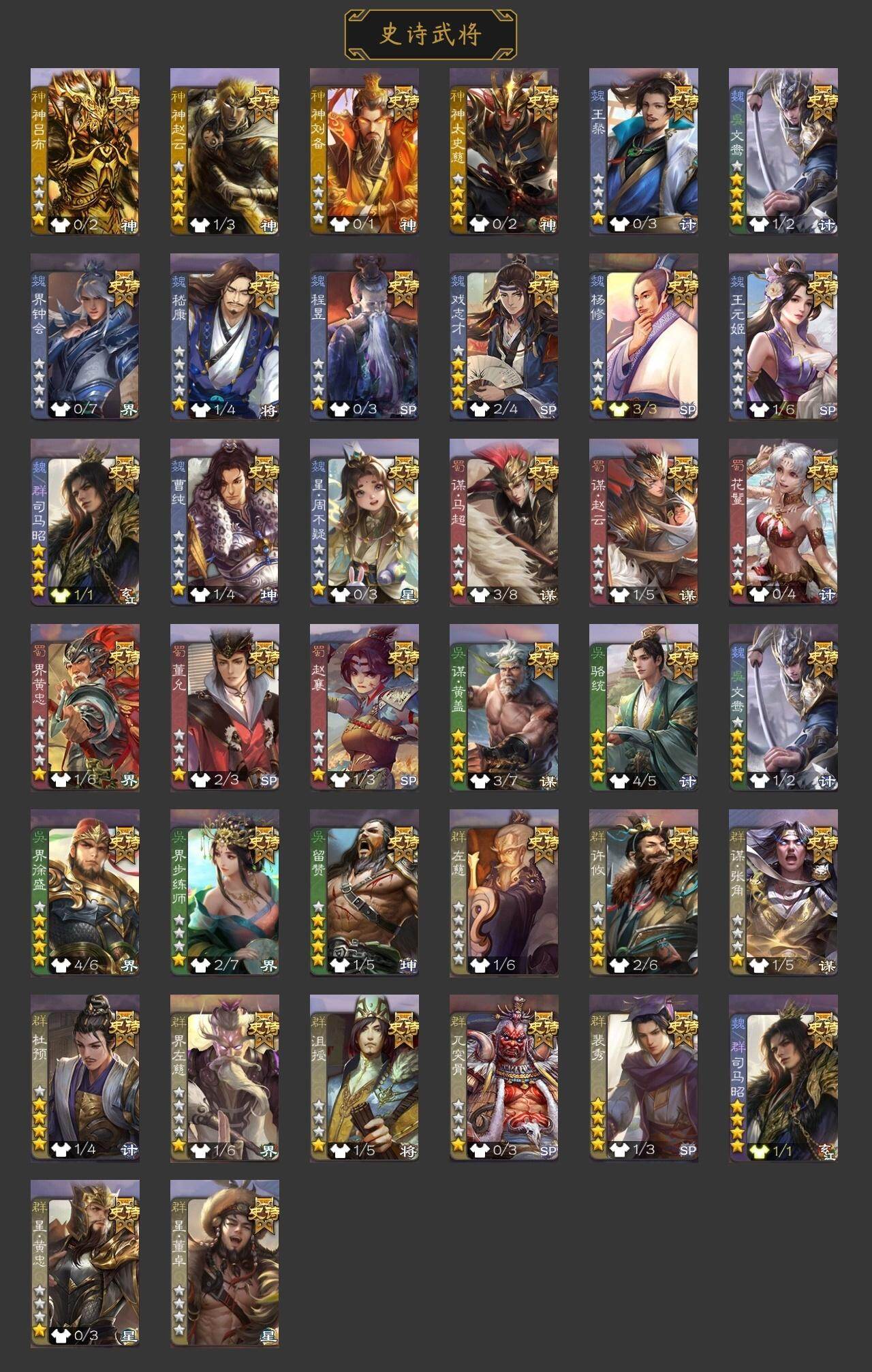 神曹操,神赵云,神陆逊,神刘备,神鲁肃,杨修,界钟会,曹婴,曹纯,戏志才,谋曹丕,程昱,关索,谋赵云,沙摩柯,花鬘,吴景,界徐盛,郑玄,张让,麹义,沮授,界李儒,谋张角,星董卓,