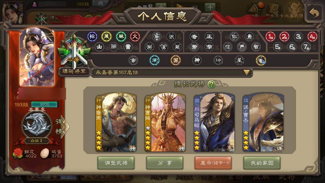 官阶:骠骑将军;VIP等级:VIP8;史诗武将数量:27;动态皮肤数量:19;