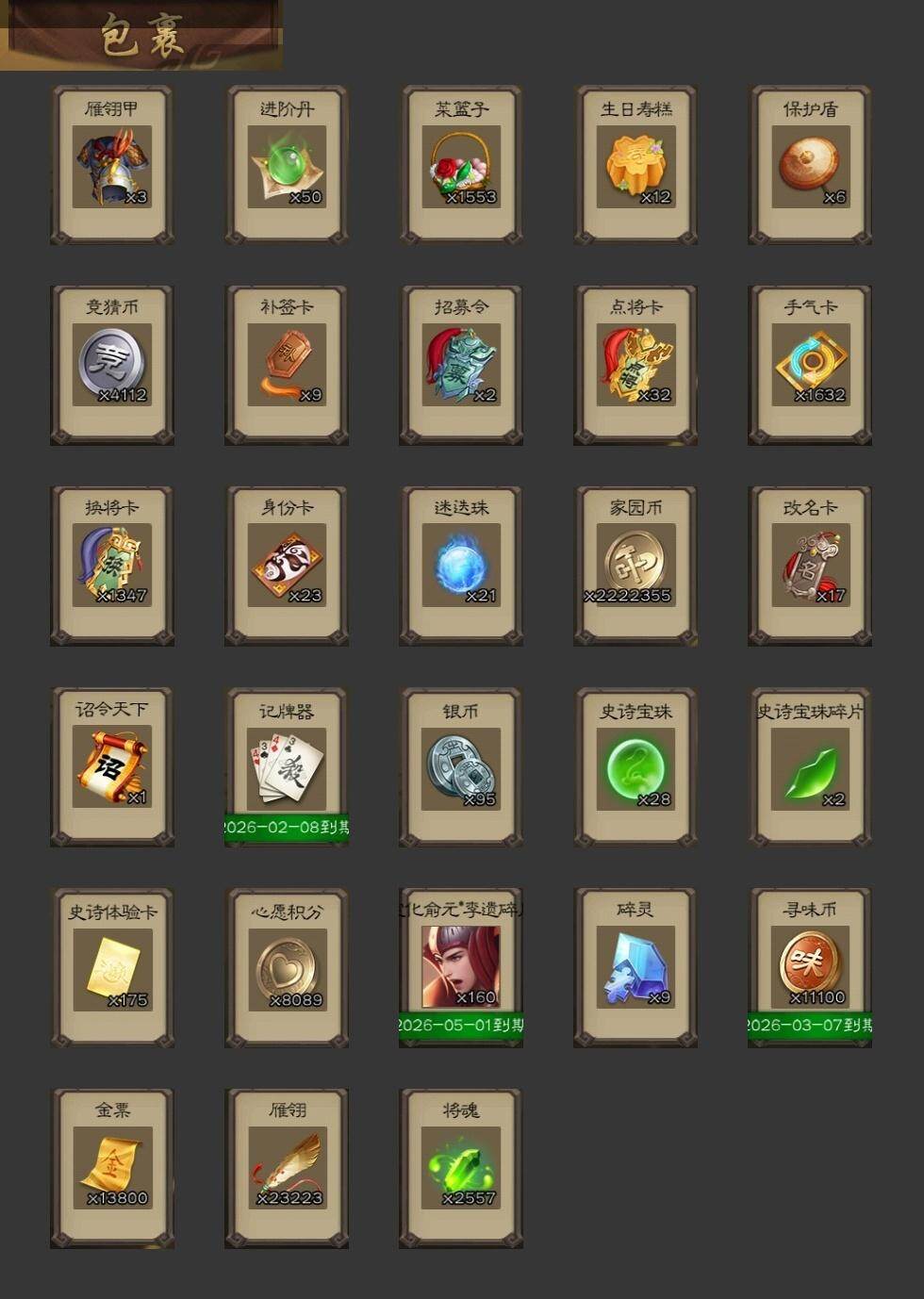 官阶:骠骑将军;VIP等级:VIP8;史诗武将数量:27;动态皮肤数量:19;武将总数:305;史诗宝珠数量:28;将魂数量:2557;神将:5;魏国史诗武将:22;蜀国史诗武将:4;吴国史诗武将:2;群史诗武将:10
