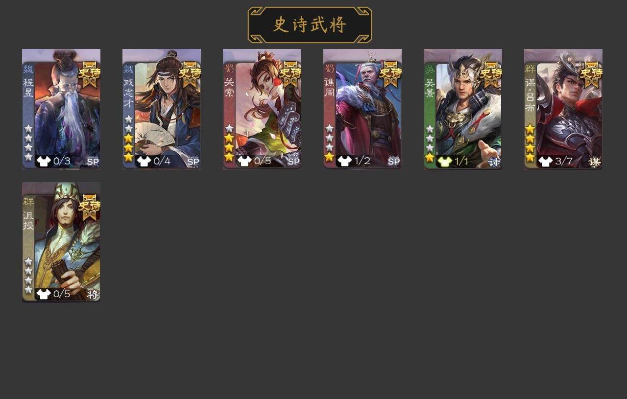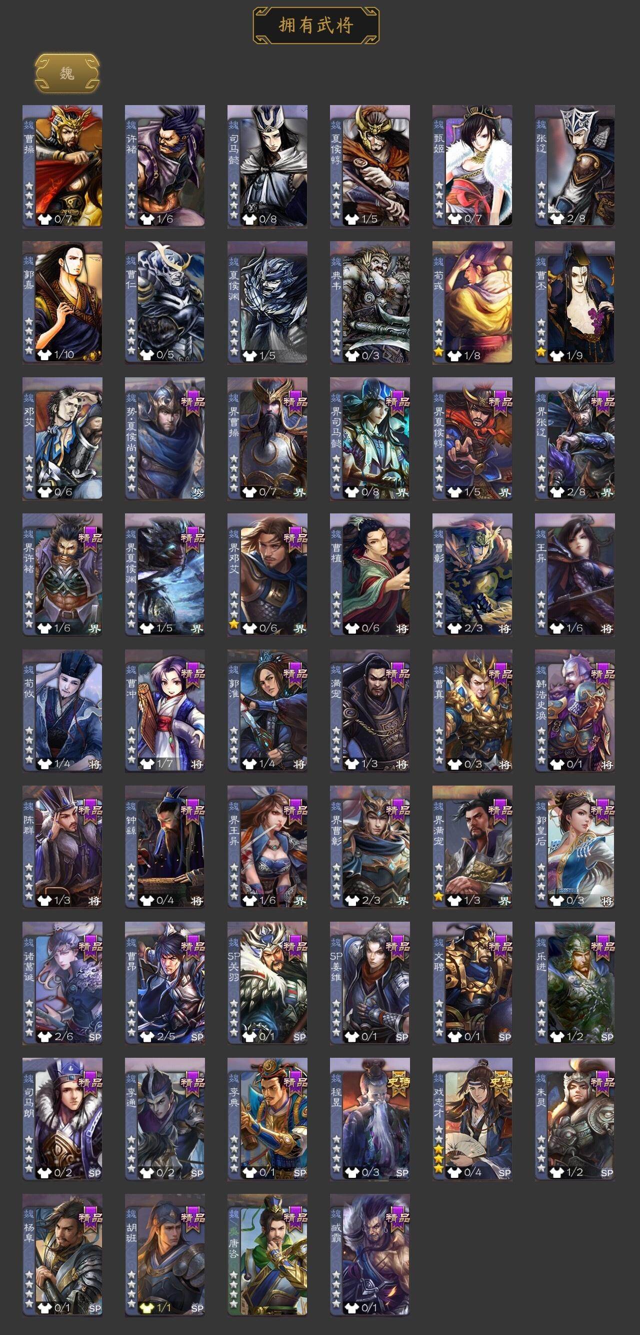 戏志才,程昱,关索,谯周,吴景,沮授,谋吕布,势夏侯尚,SP关羽,乐进,曹昂,诸葛诞,朱灵,文聘,SP姜维,曹冲,郭淮,满宠,界王异,界曹操,界司马懿,界夏侯惇,界张辽,界许褚,李典,曹真