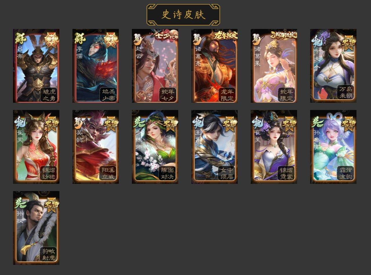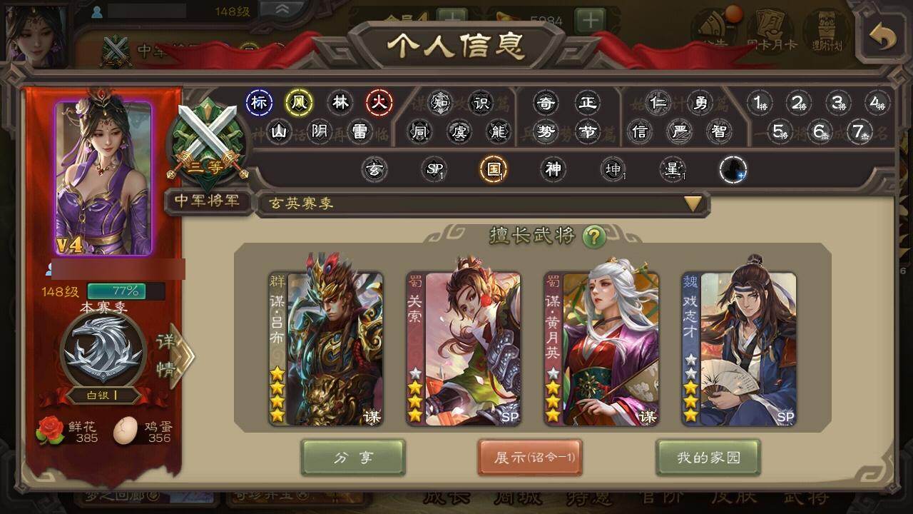 官阶:中军将军;VIP等级:VIP4;史诗武将数量:7;动态皮肤数量:5;武将