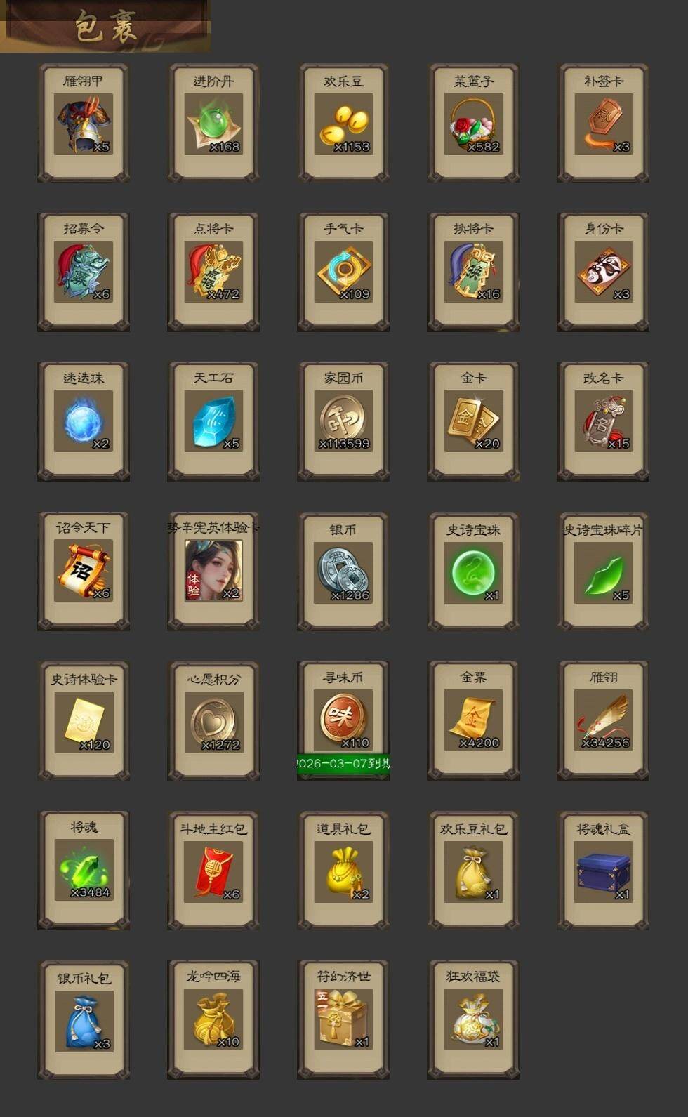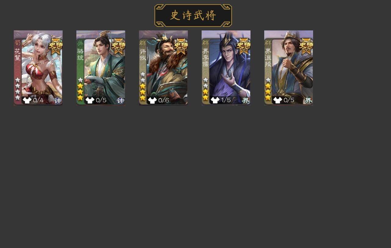 官阶:先锋将军;VIP等级:VIP4;史诗武将数量:5;动态皮肤数量:2;武将总数:142;史诗宝珠数量:1;将魂数量:3484;神将:0;魏国史诗武将:2;蜀国史诗武将:1;吴国史诗武将:1;群史诗武将:3