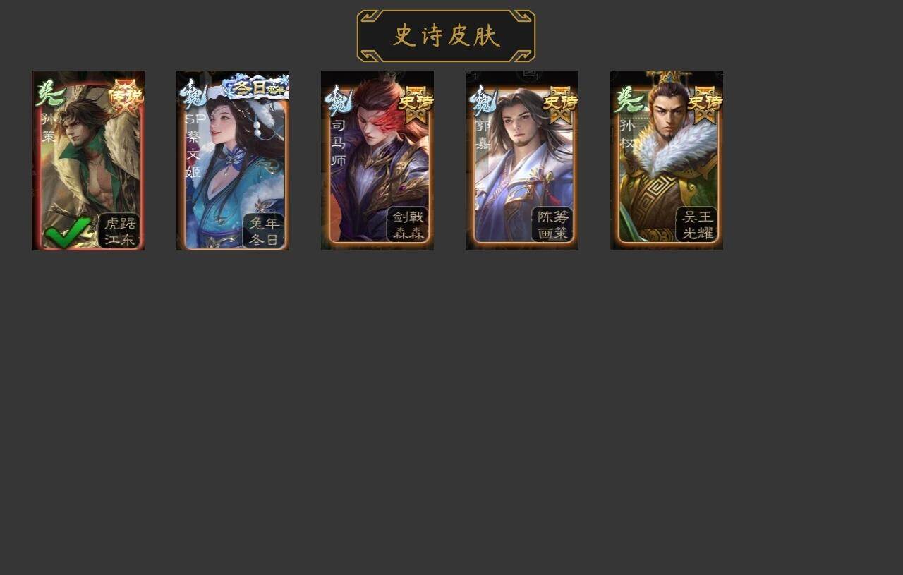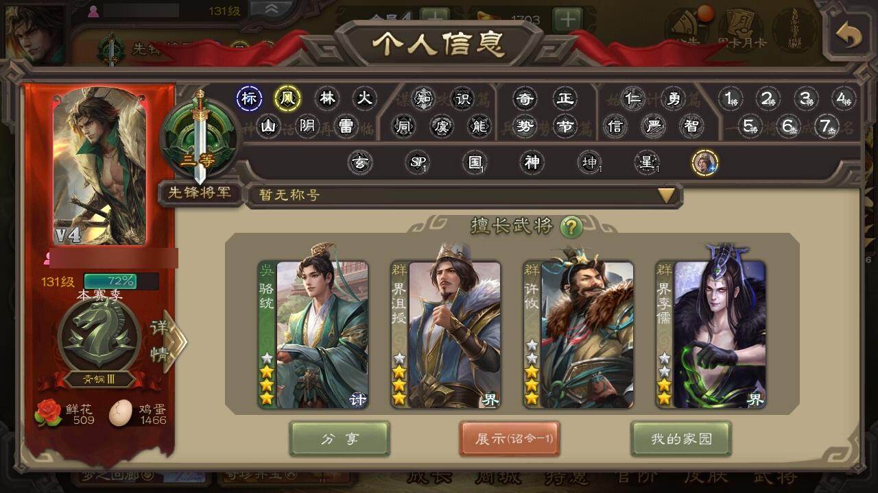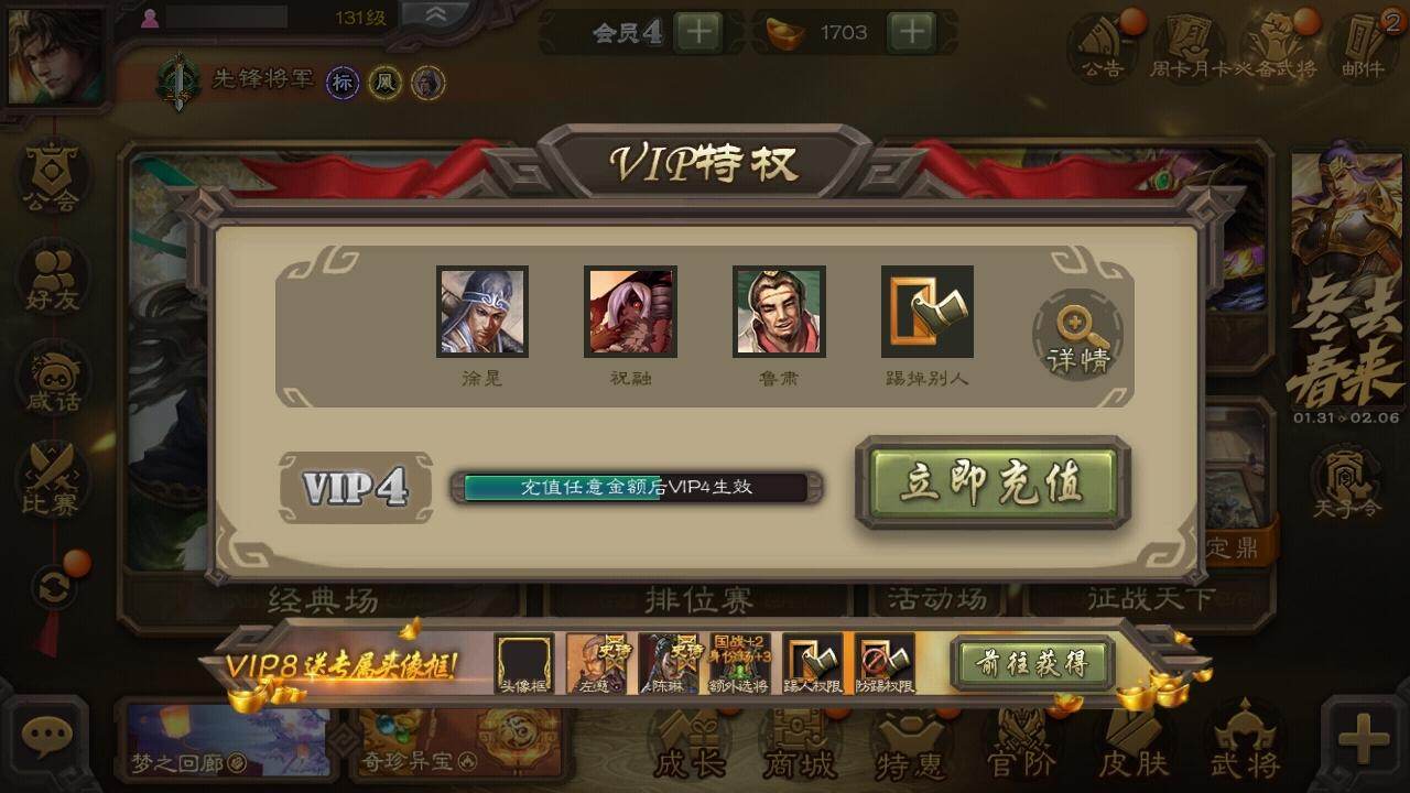 官阶:先锋将军;VIP等级:VIP4;史诗武将数量:5;动态皮肤数量:2;武将