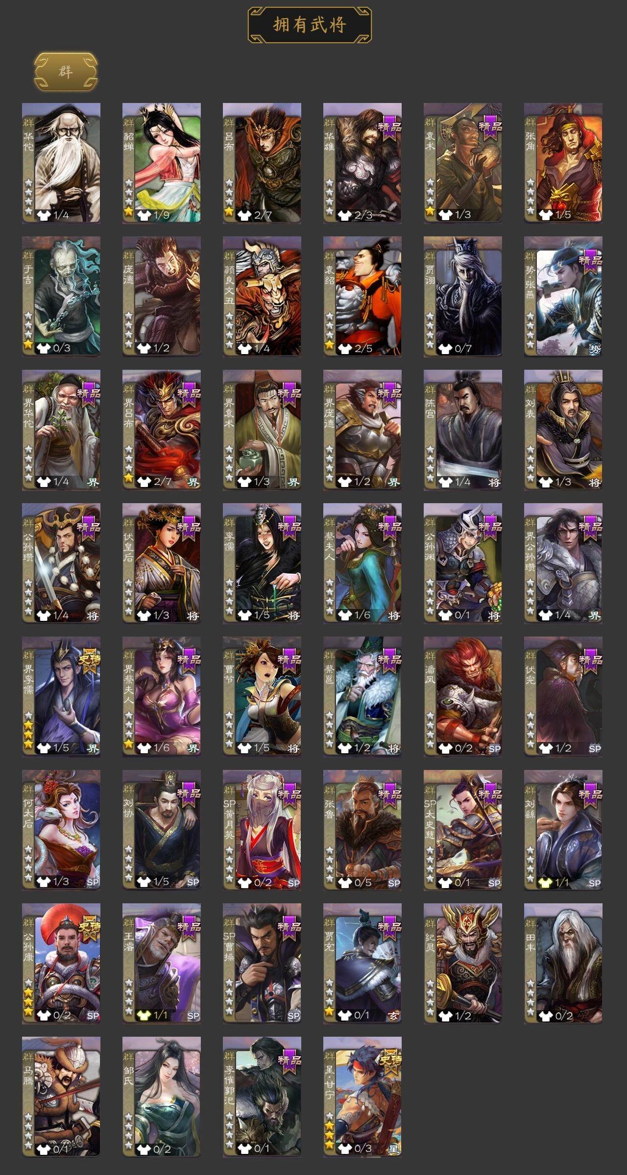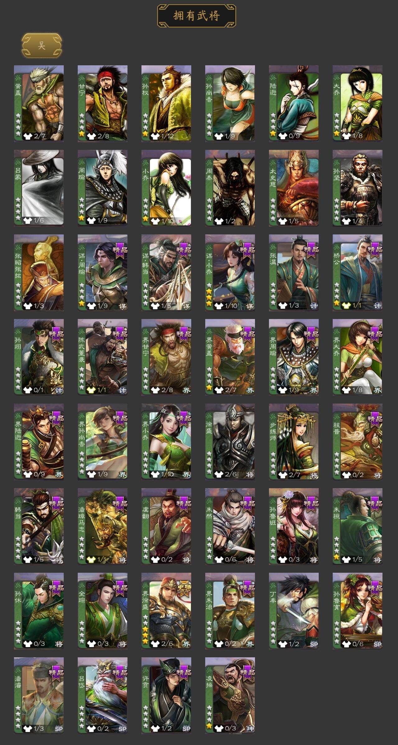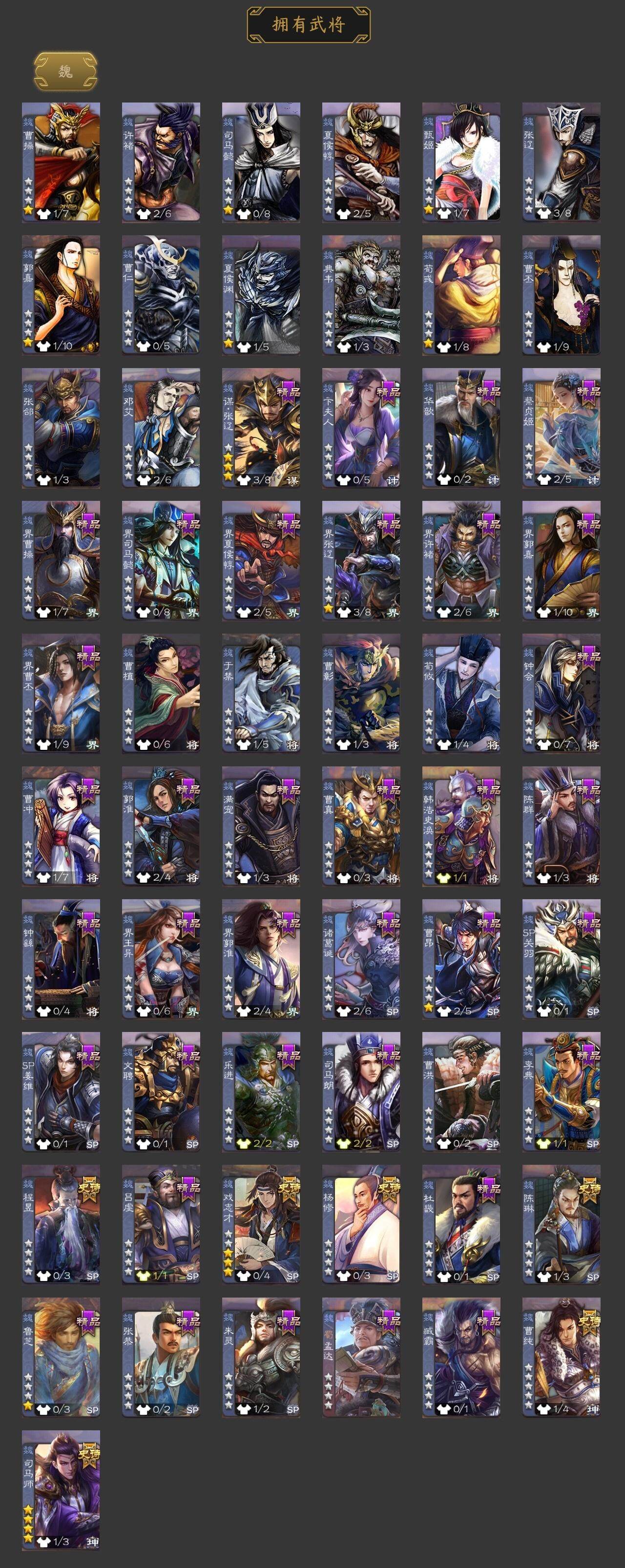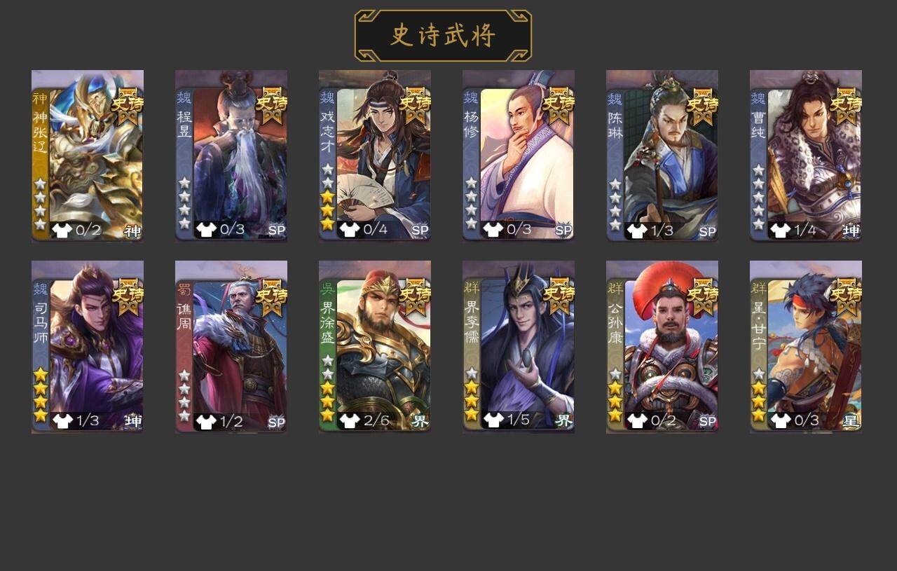 神张辽,杨修,司马师,陈琳,曹纯,戏志才,程昱,谯周,界徐盛,星甘宁,界李儒,公孙康,神周瑜,SP关羽,乐进,曹昂,诸葛诞,朱灵,文聘,SP姜维,钟会,曹冲,郭淮,满宠,界王异,界曹操,界