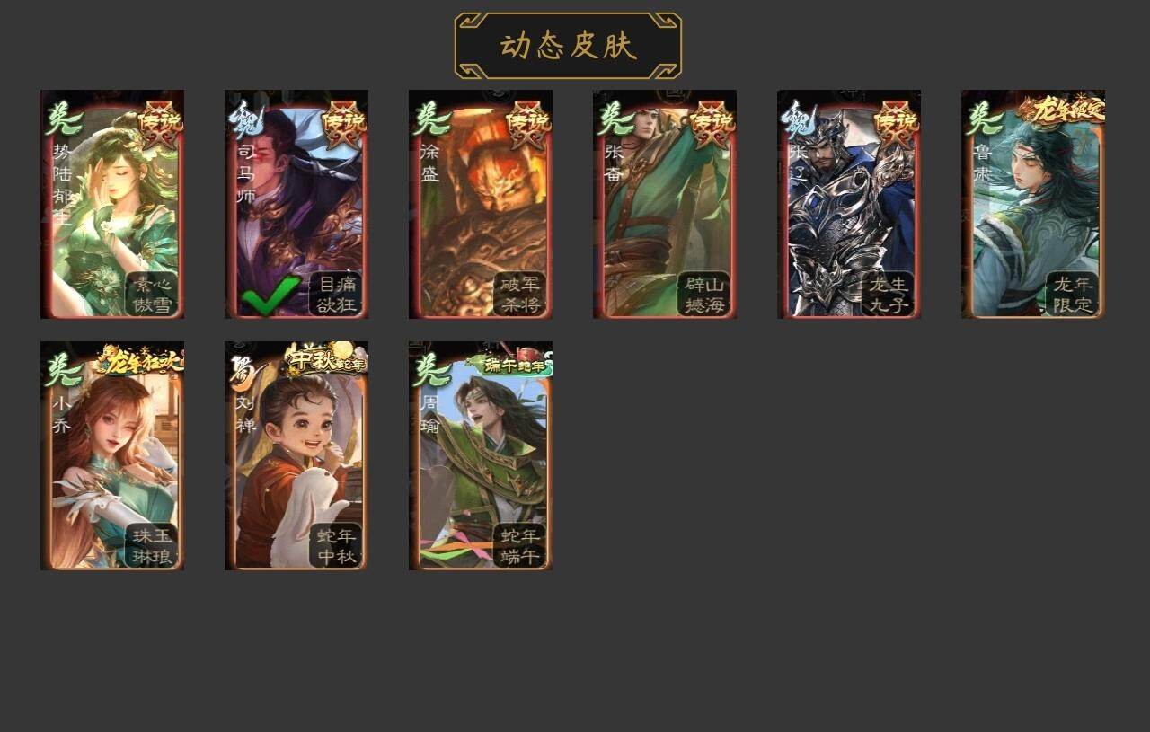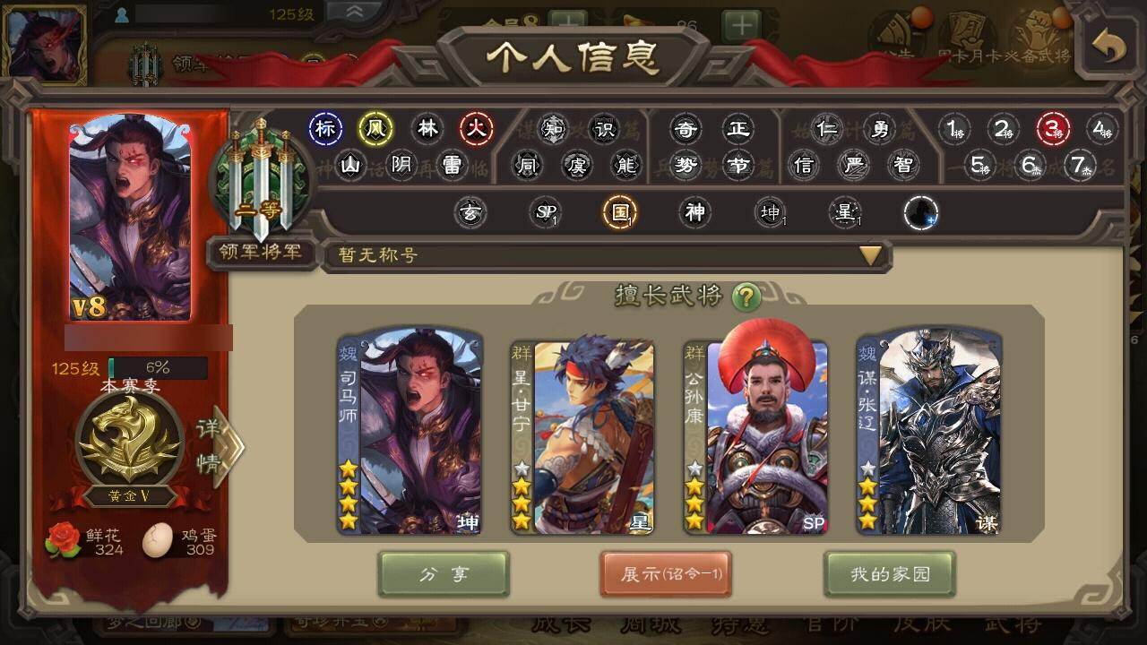 官阶:领军将军;VIP等级:VIP8;史诗武将数量:12;动态皮肤数量:9;武