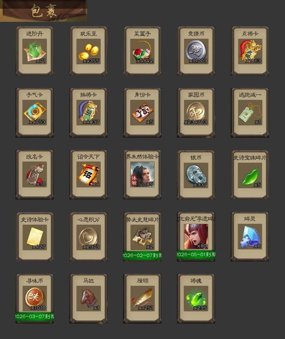 官阶:领军将军;VIP等级:VIP8;史诗武将数量:12;动态皮肤数量:9;武将总数:207;史诗宝珠数量:0;将魂数量:295;神将:1;魏国史诗武将:4;蜀国史诗武将:1;吴国史诗武将:1;群史诗武将:3