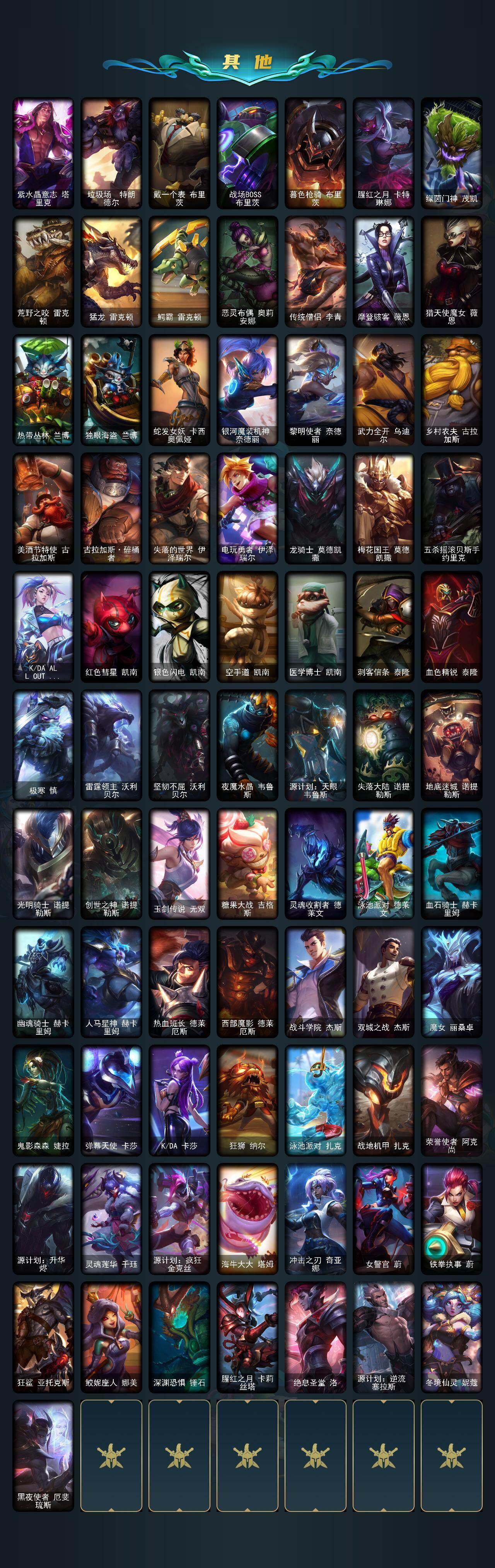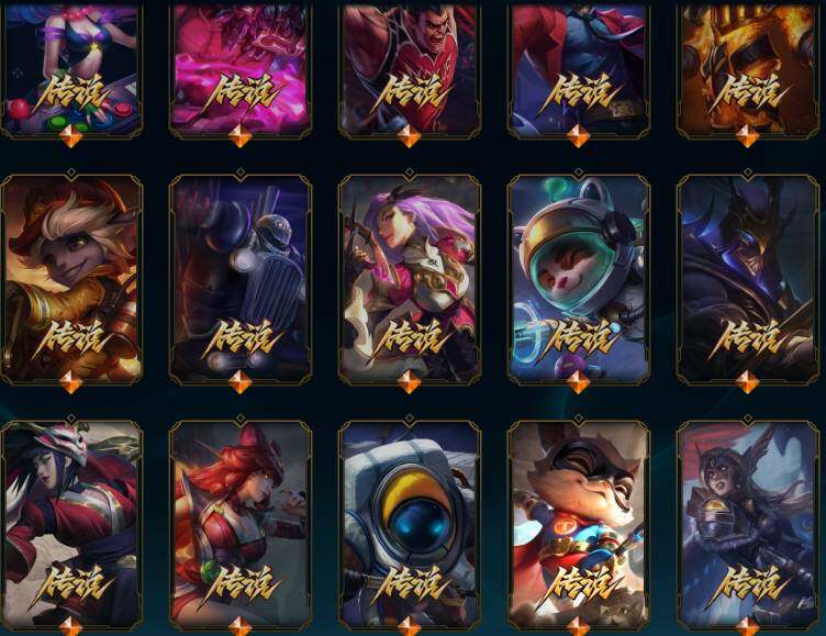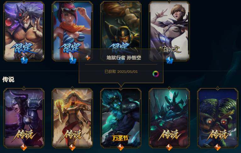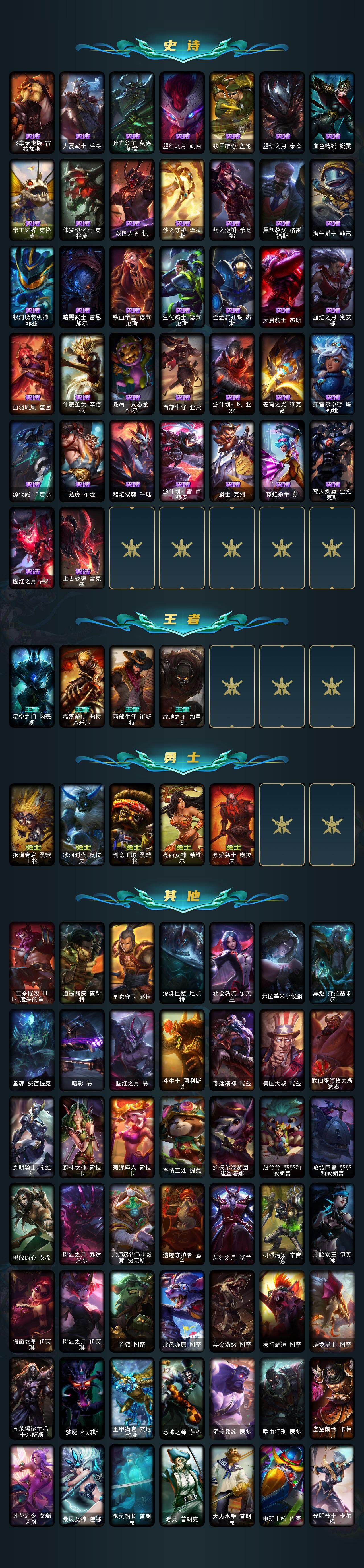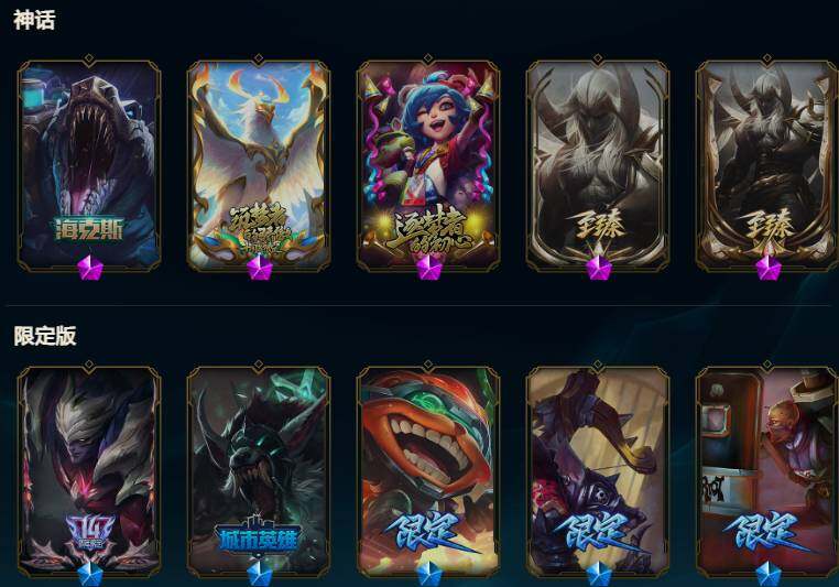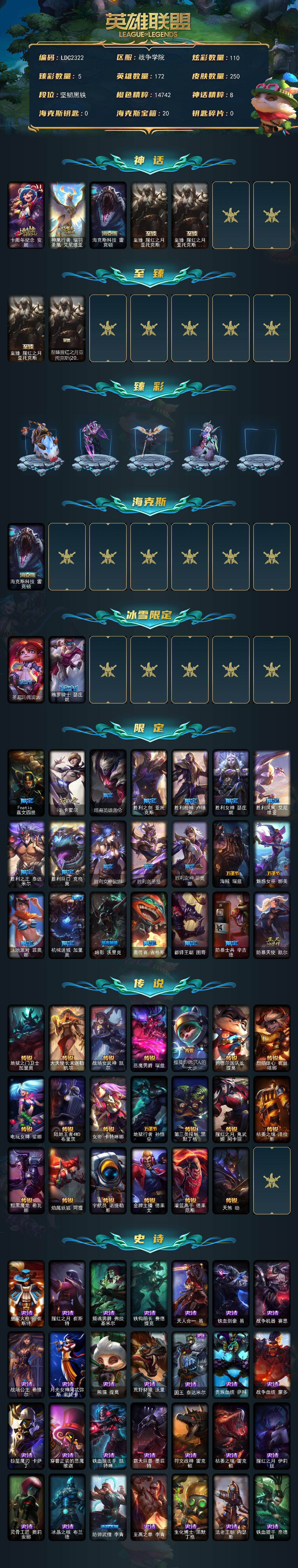 172英雄/250皮肤/5神话/24限定/5臻彩/110炫彩/20传说/65史诗/未定级