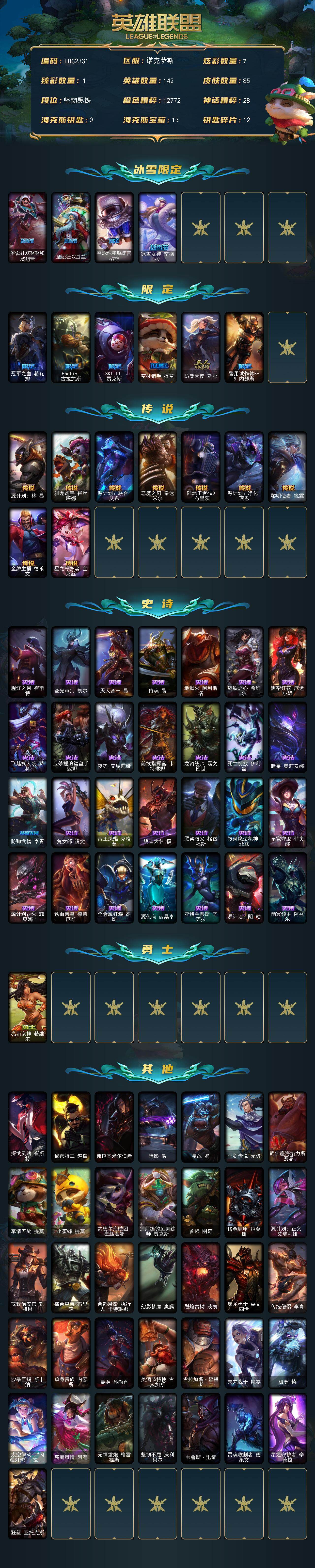 142英雄/85皮肤/10限定/1臻彩/7炫彩/9传说/28史诗/未定级