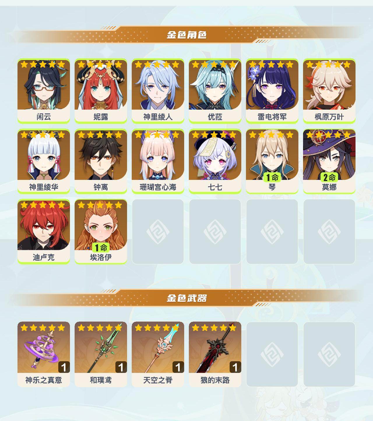 【YSX1620】56级/21黄/女主/14个五星角色/4个五星武器/枫原万叶/钟离/神里绫华/雷电将军/优菈/妮露/神里绫人/迪卢克/珊瑚宫心海/2命莫娜/1命琴/闲云/0命埃洛伊/七七/神乐之真意/和璞鸢/狼的末路/天空之脊