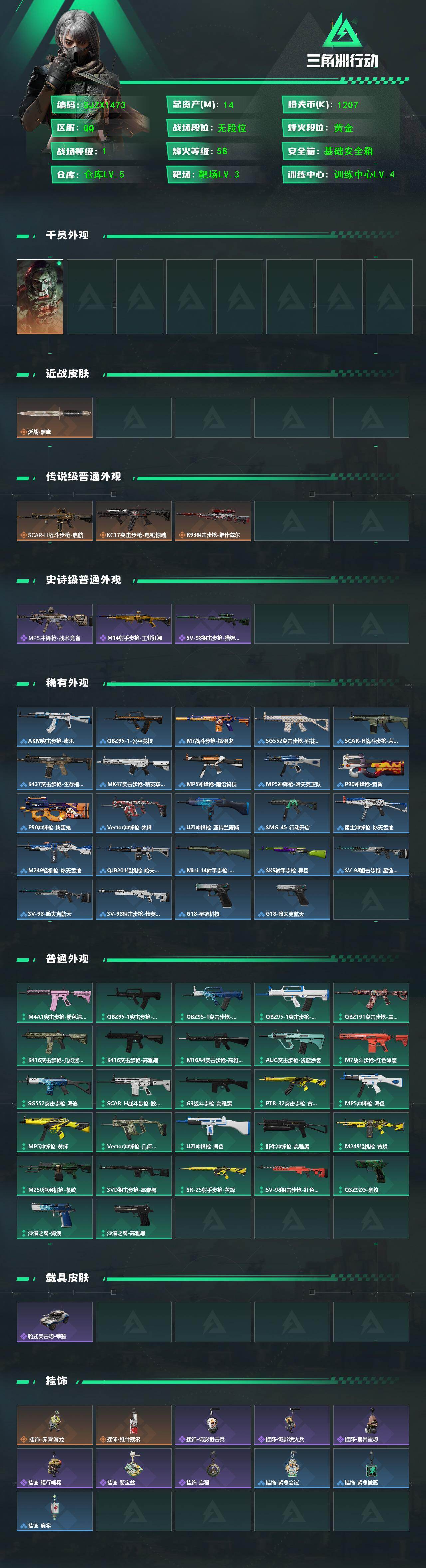 【SJZX1473】总资产(M):14M/哈夫币(K):1207K/哈夫币(K):1207K/传说枪皮数:3/全面战场等级:1_段位:无段位/烽火地带等级:58_段位:黄金/红狼-电锯惊魂/近战-黑鹰/SCAR-H战斗步枪-启航/KC17突击步枪-电锯惊魂/R93狙击步枪-维什戴尔/MP5冲锋枪-战术竞备/M14射手步枪-工业狂潮/SV-98狙击步枪-猎鳄行动/AKM突击步枪-肃杀/QBZ95-1突击步枪-公平竞技/M7战斗步枪-捣蛋鬼/SG552突击步枪-贴花艺术/SCAR-H战斗步枪-荣耀列