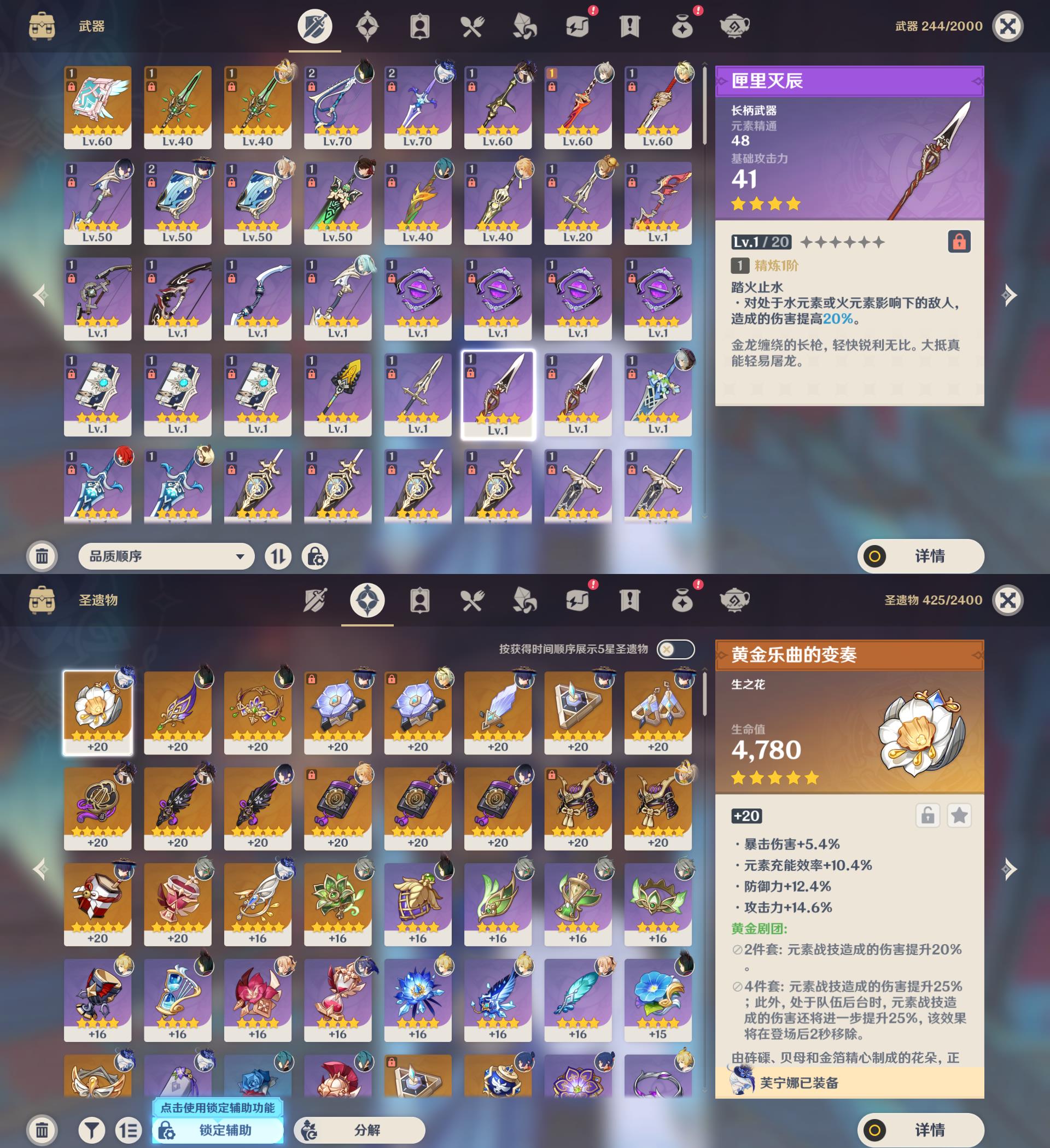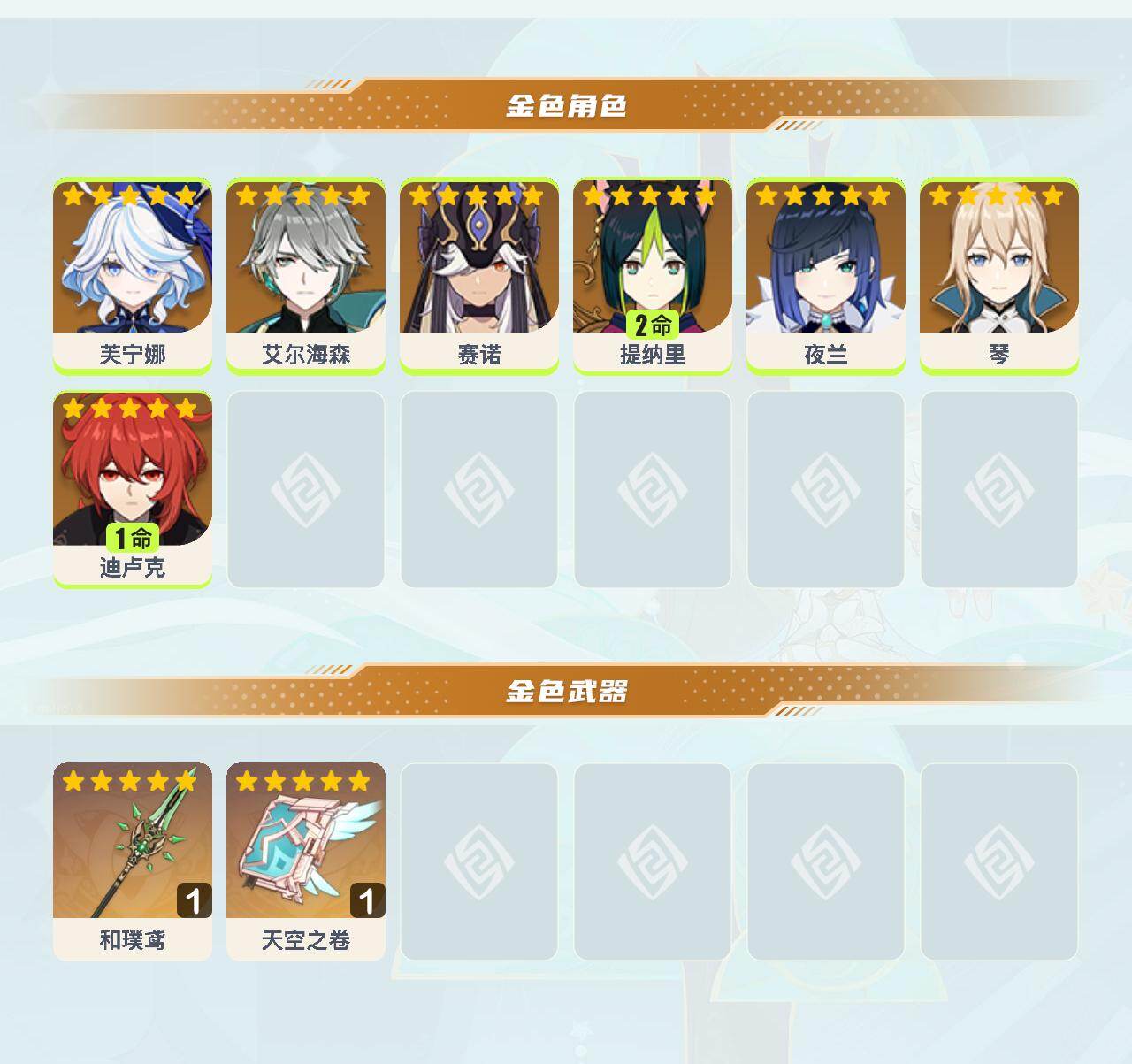 55级/13黄/女主/7个五星角色/3个五星武器/夜兰/芙宁娜/艾尔海森