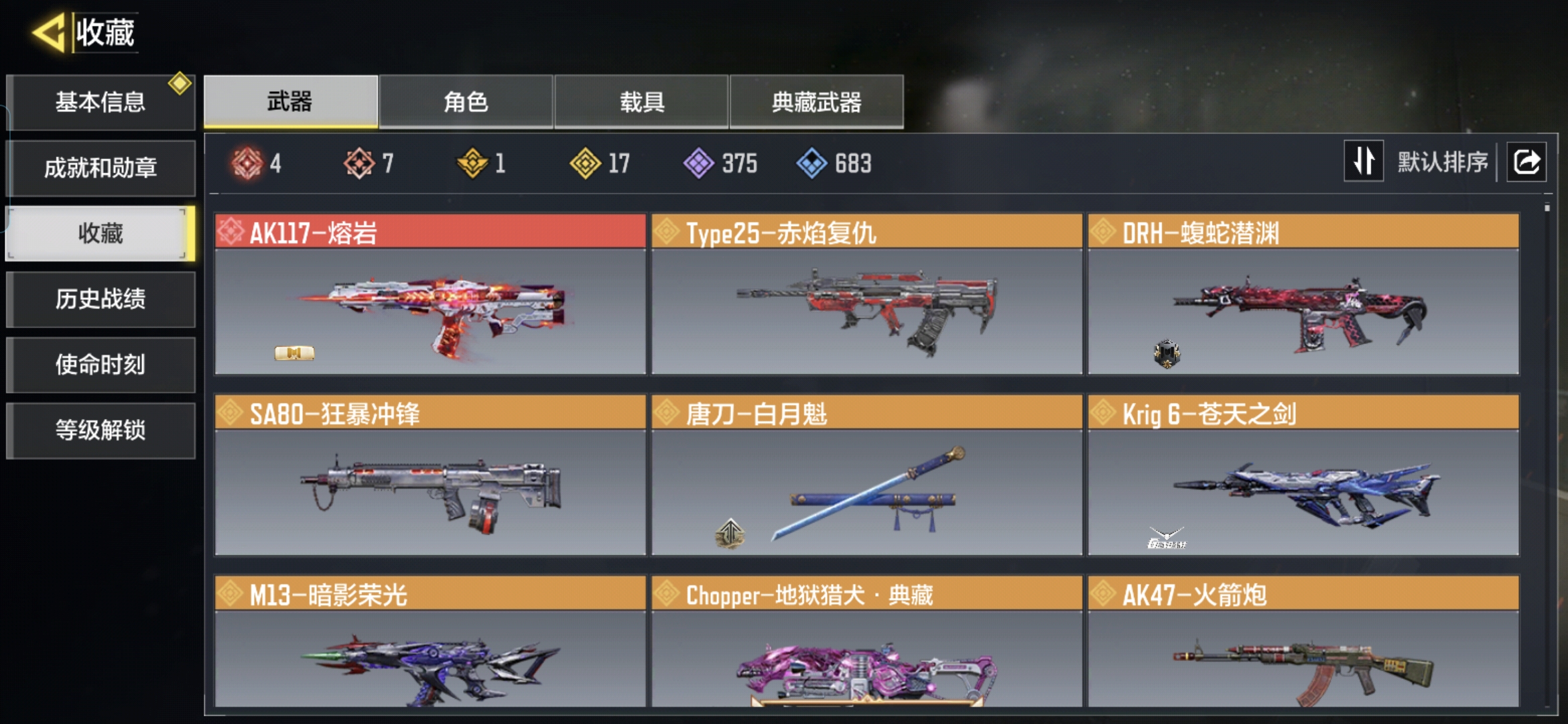 MHZ2551【神话7 满级4 1典藏 17传说】安卓Q-等级400-史诗枪械375【神话】 AK117-终墟(满级) SMG5-潮海汐月(满级) BP50-日蚀(满级) VMP-幽冥花海(满级) Holger26-黑暗曙光 Krig6-冰霜巨龙 AK117-熔岩 【传说】 Type25-赤焰复仇 DRH-蝮蛇潜渊 Krig 6-苍天之剑 SA80-狂暴冲锋 M13-暗影荣光 AK47-火箭炮 唐刀-白月魁 CR56-回音律动 RPD-一路悠扬 M4-皇家黑魂 电棍-永恒炽热 DLQ33-狂热祈