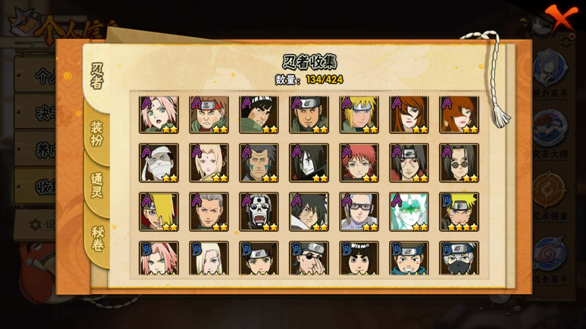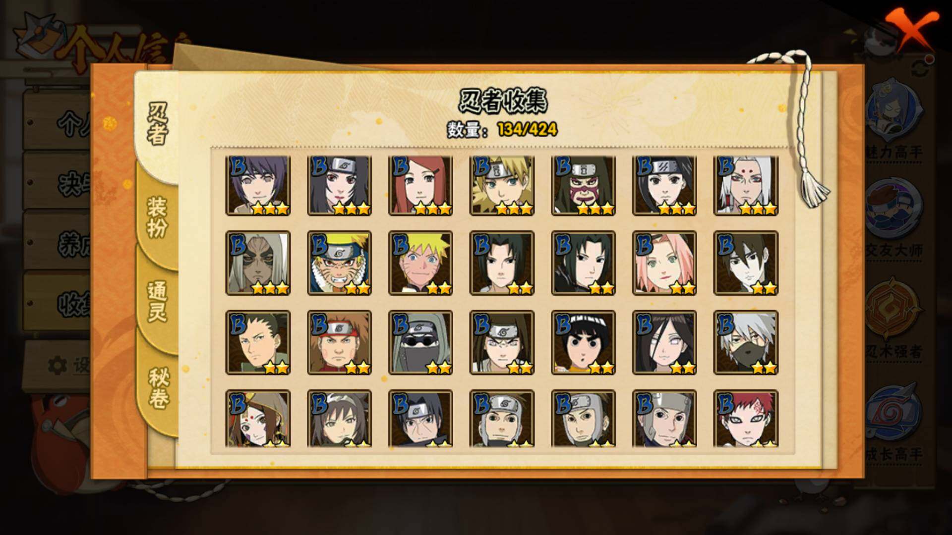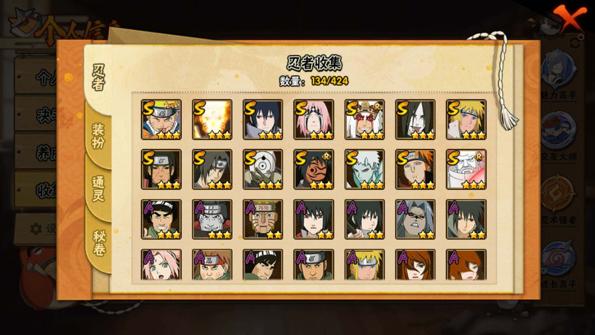 【S级忍者】:千手柱间「秽土转生」(3星),春野樱「忍界大战」(3星),宇智波鼬「须佐能乎」(3星),自来也「舞之豪杰」(3星),大蛇丸(3星),波风水门(3星),神秘面具男「红夜之刃」(3星),漩涡鸣人「九喇嘛连结」(3星),佩恩「天道」(3星),宇智波佐助「永恒万花筒」(3星),宇智波斑 「白面具」(3星宇智波斑「白面