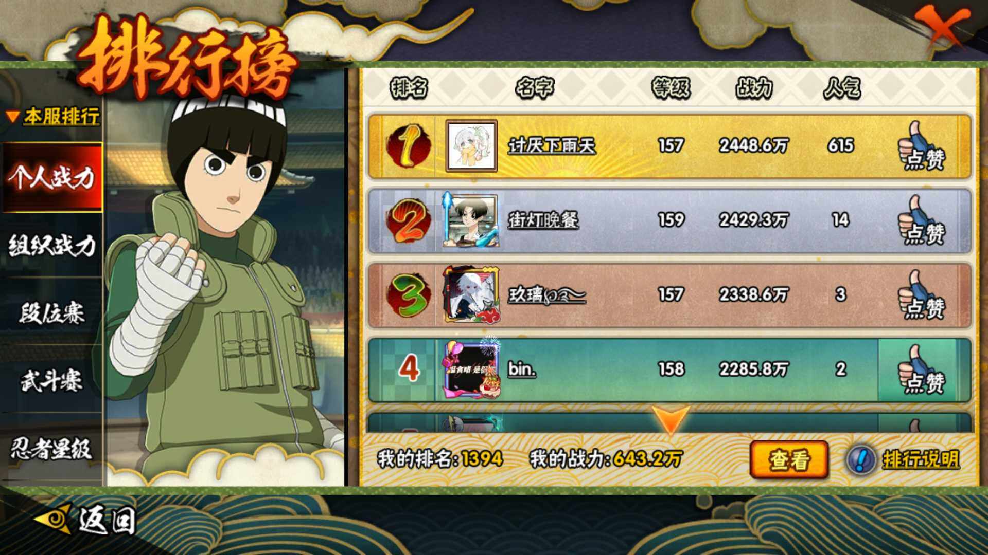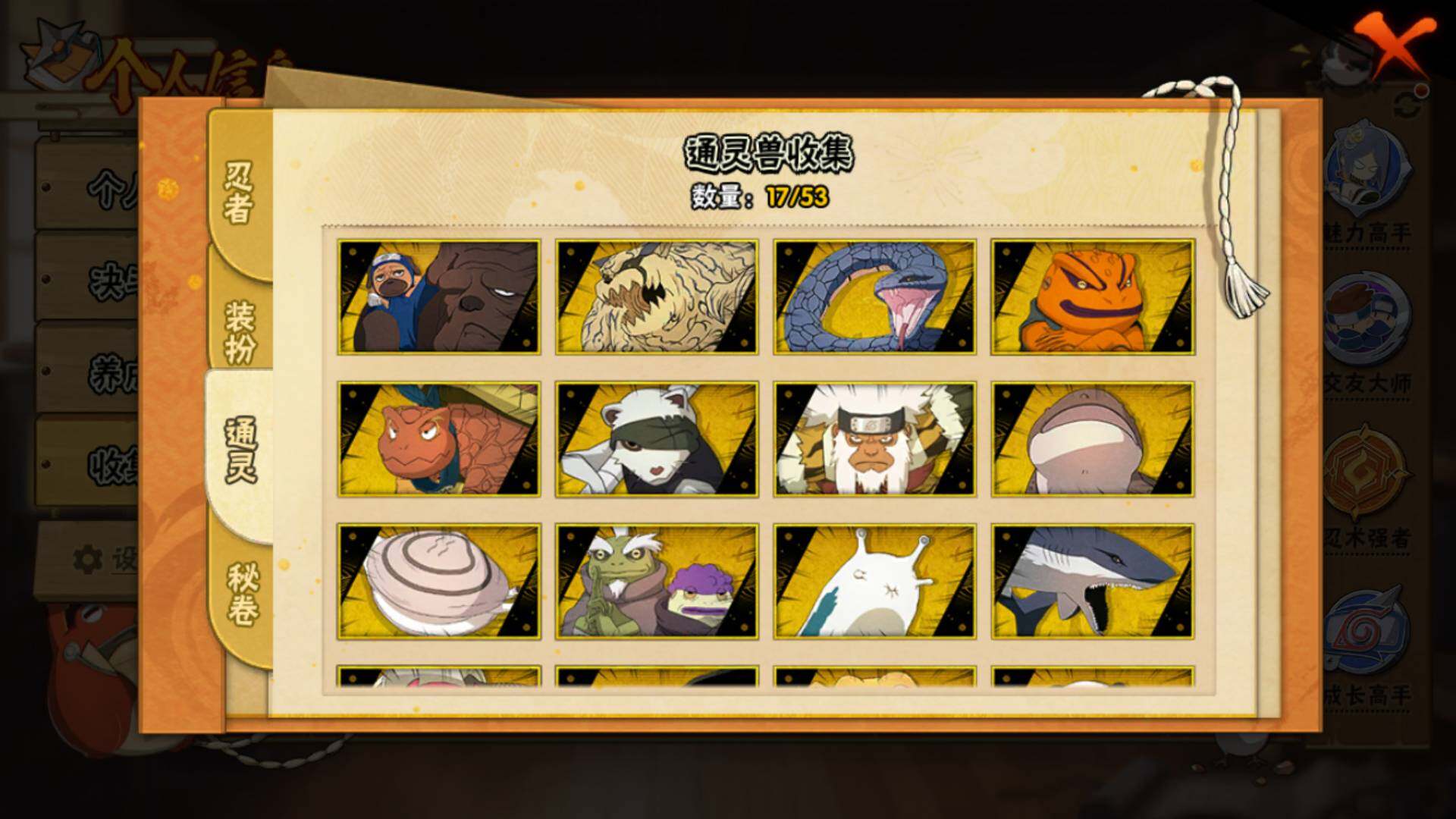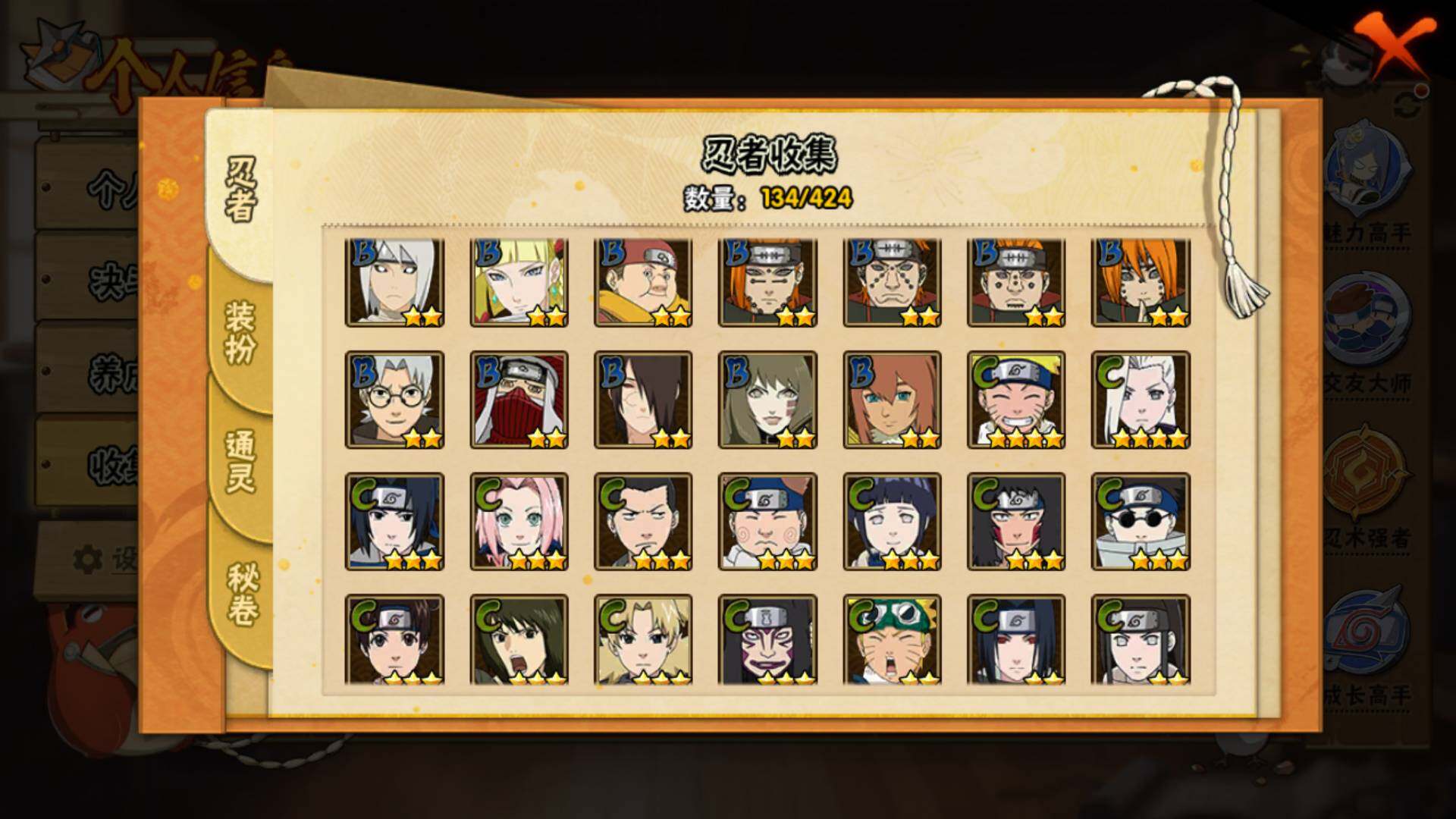 【S级忍者】:千手柱间「秽土转生」(3星),春野樱「忍界大战」(3星),宇智波鼬「须佐能乎」(3星),自来也「舞之豪杰」(3星),大蛇丸(3星),波风水门(3星),神秘面具男「红夜之刃」(3星),漩涡鸣人「九喇嘛连结」(3星),佩恩「天道」(3星),宇智波佐助「永恒万花筒」(3星),宇智波斑 「白面具」(3星宇智波斑「白面