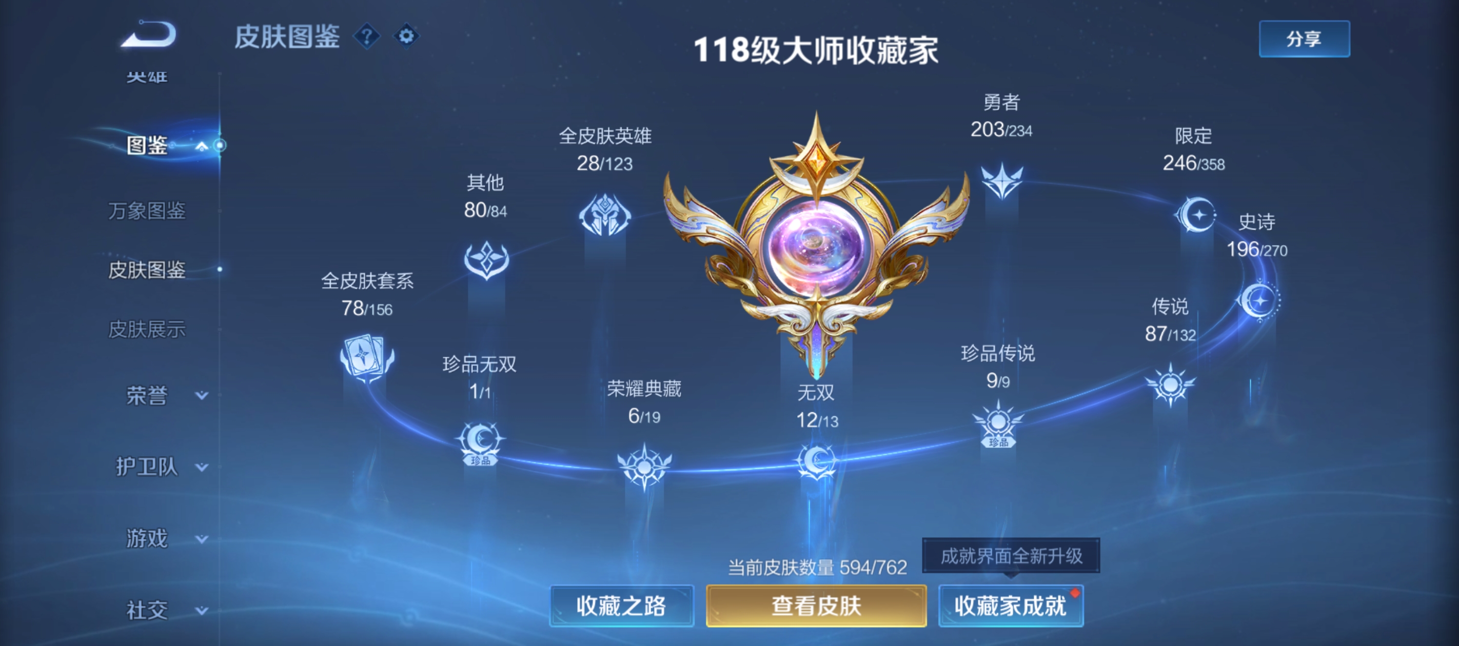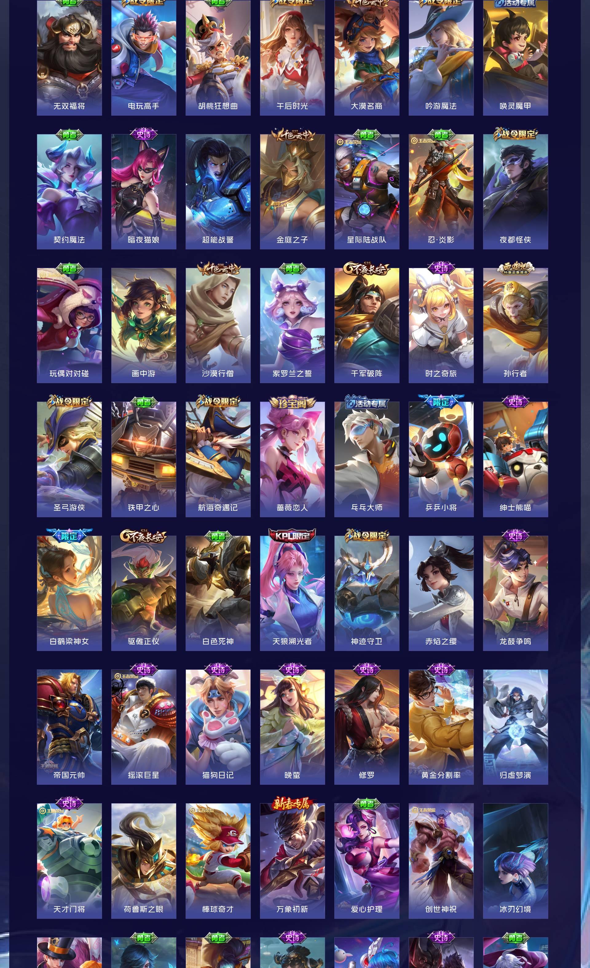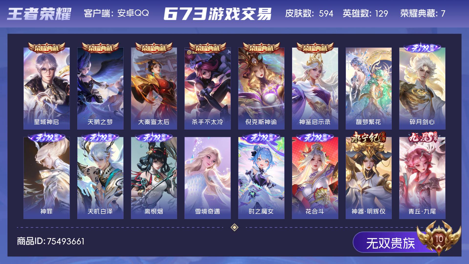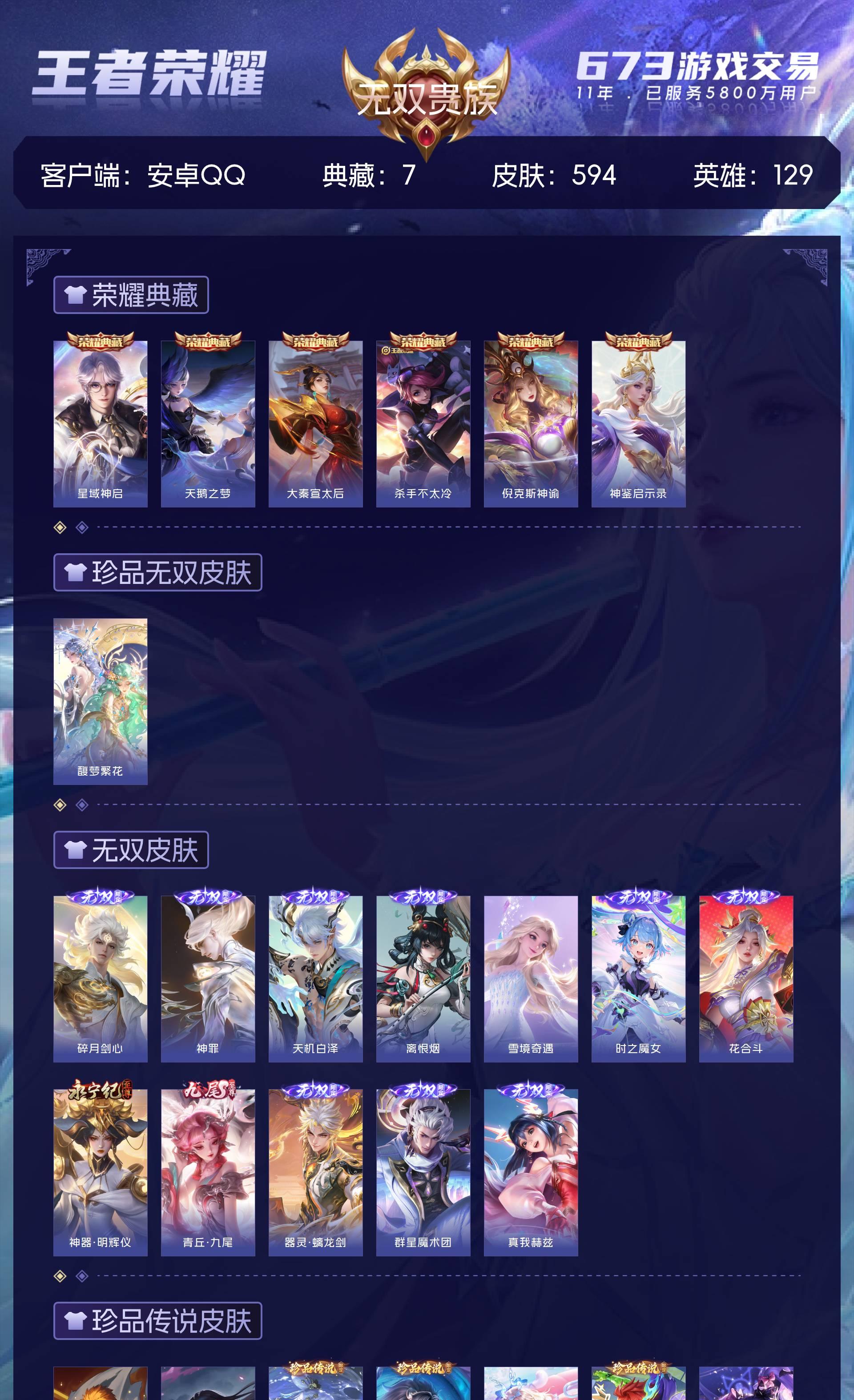 无双贵族 皮肤594 英雄129 传奇王者 荣耀典藏7 珍品无双1 无双皮肤12 珍品传说9 传说87 其他皮肤484