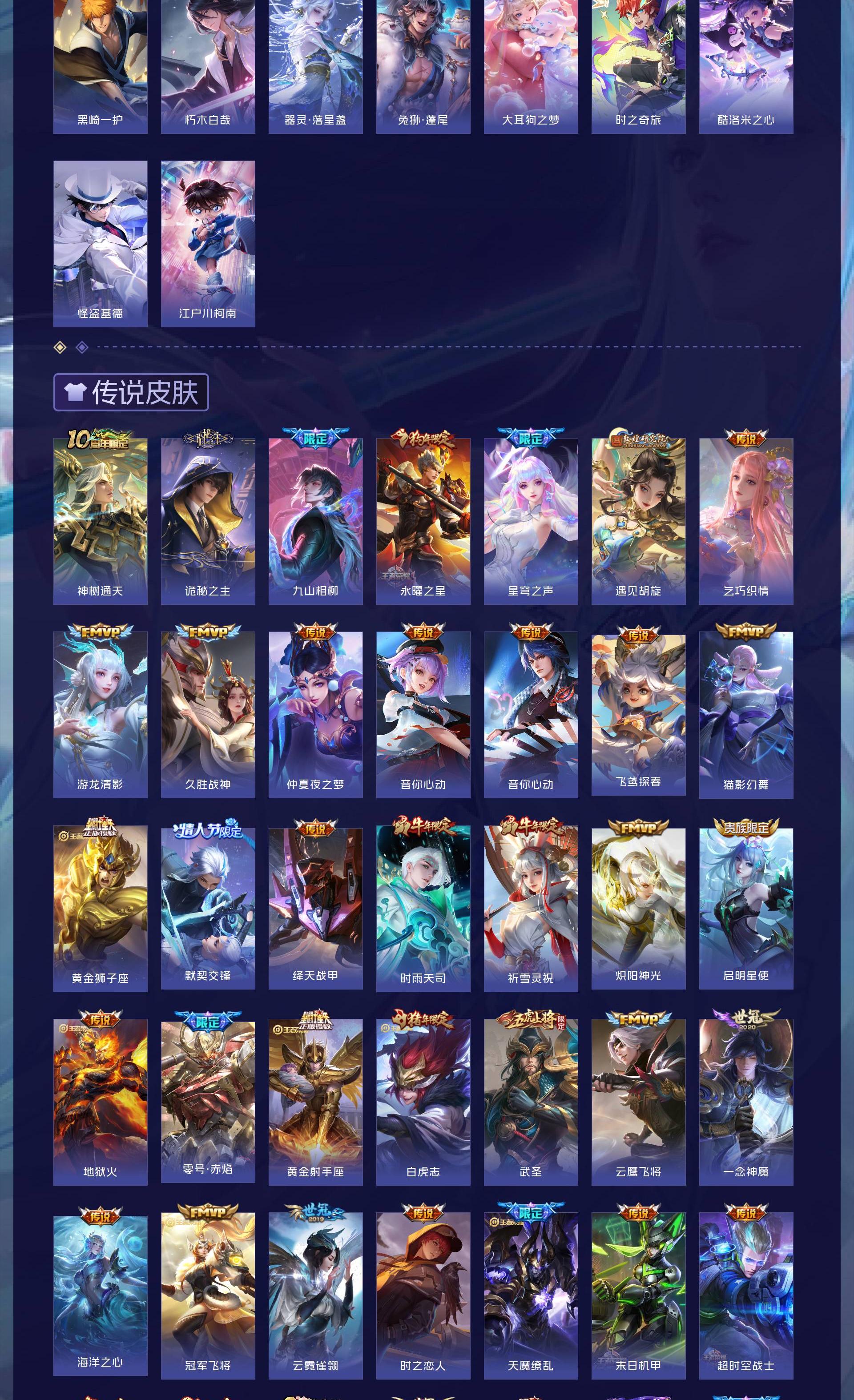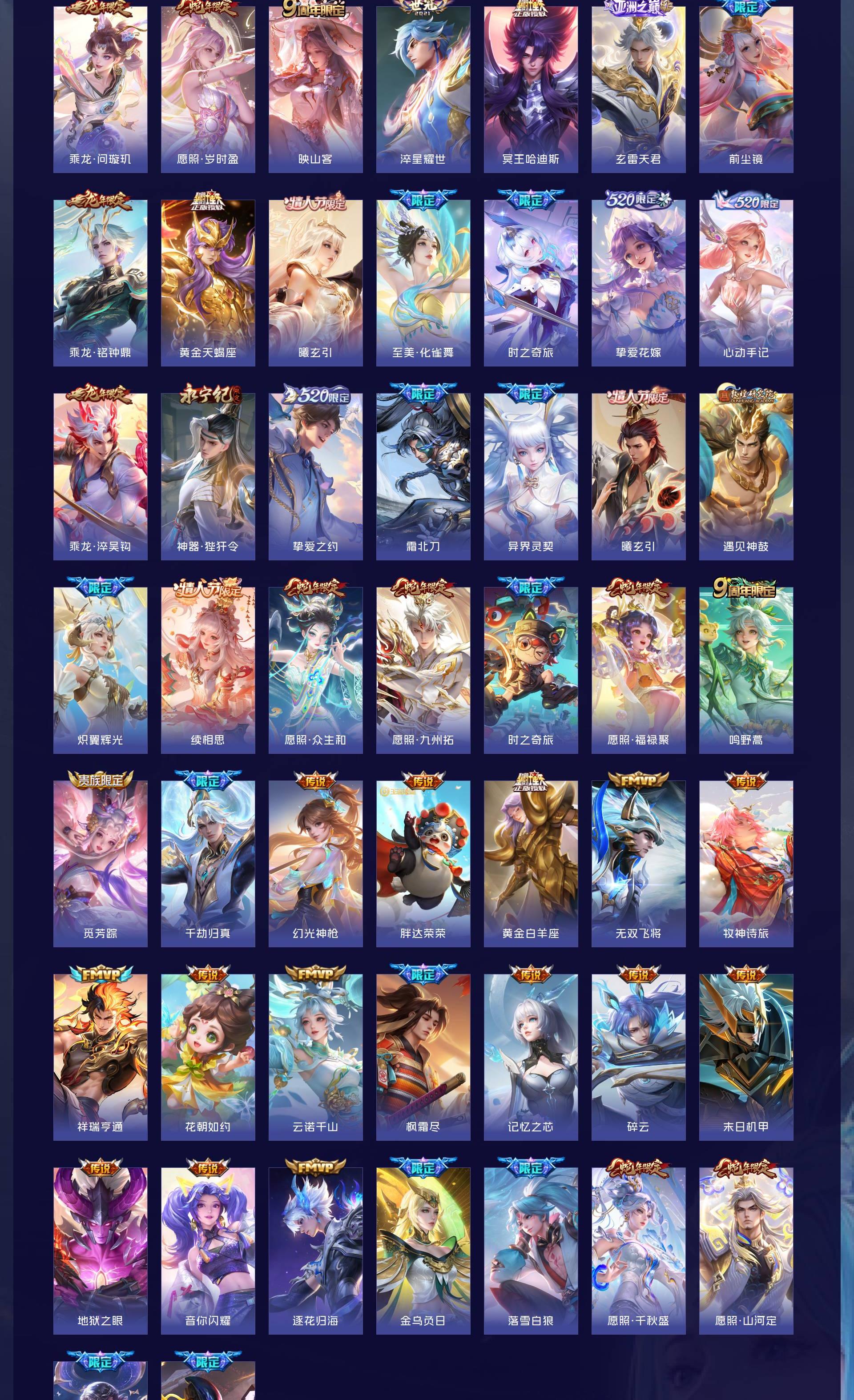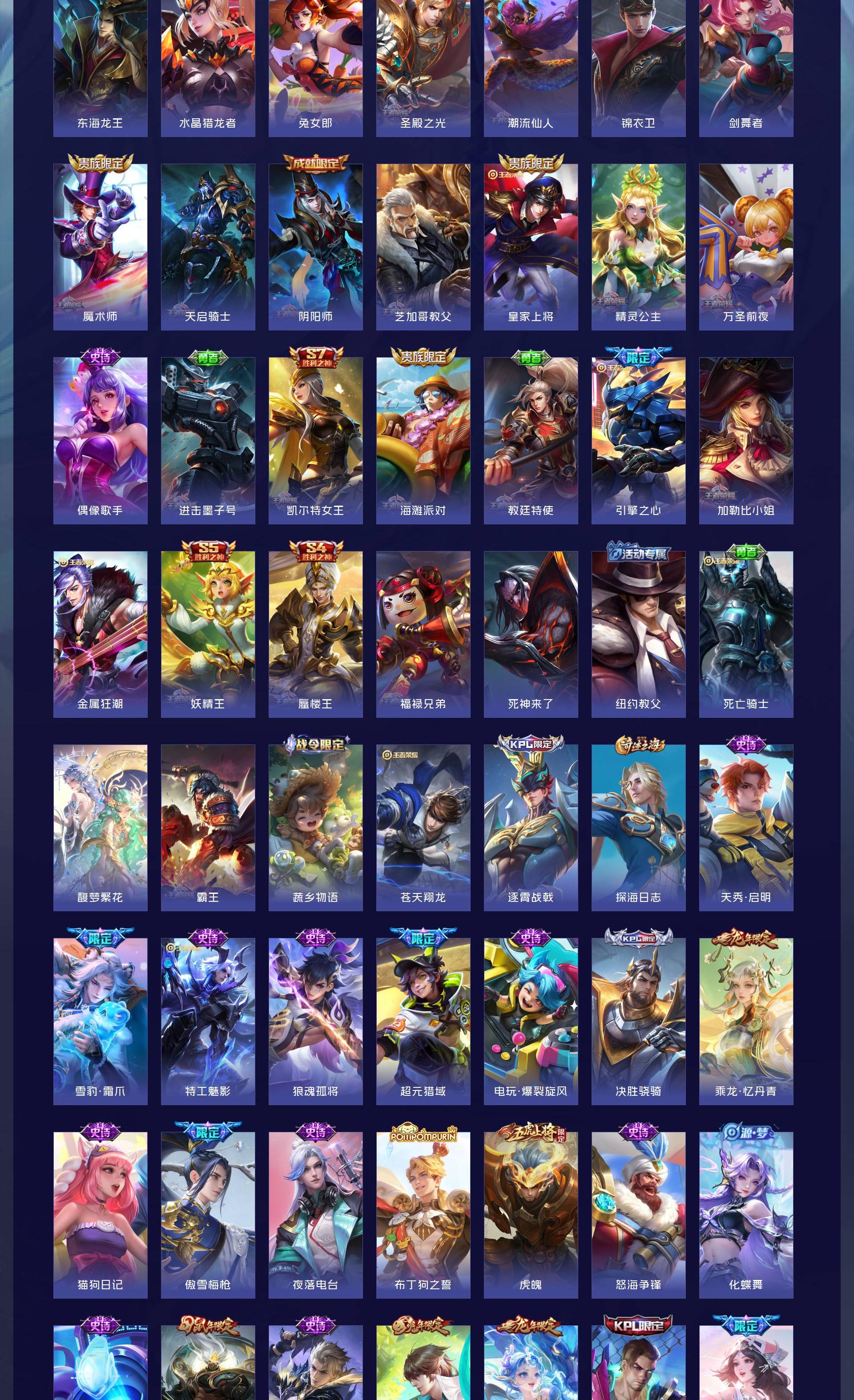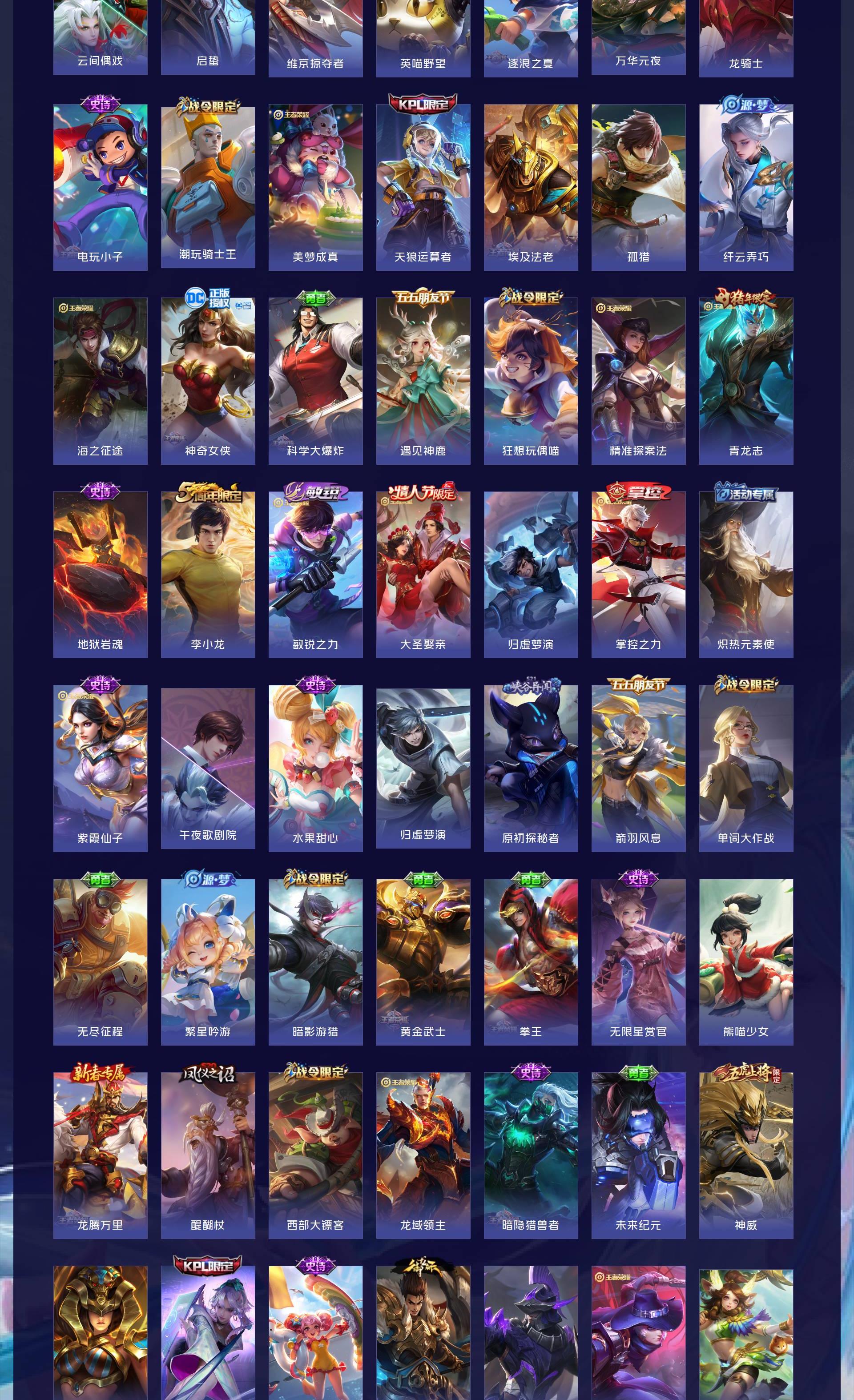 无双贵族 皮肤594 英雄129 传奇王者 荣耀典藏7 珍品无双1 无双皮肤12 珍品传说9 传说87 其他皮肤484
