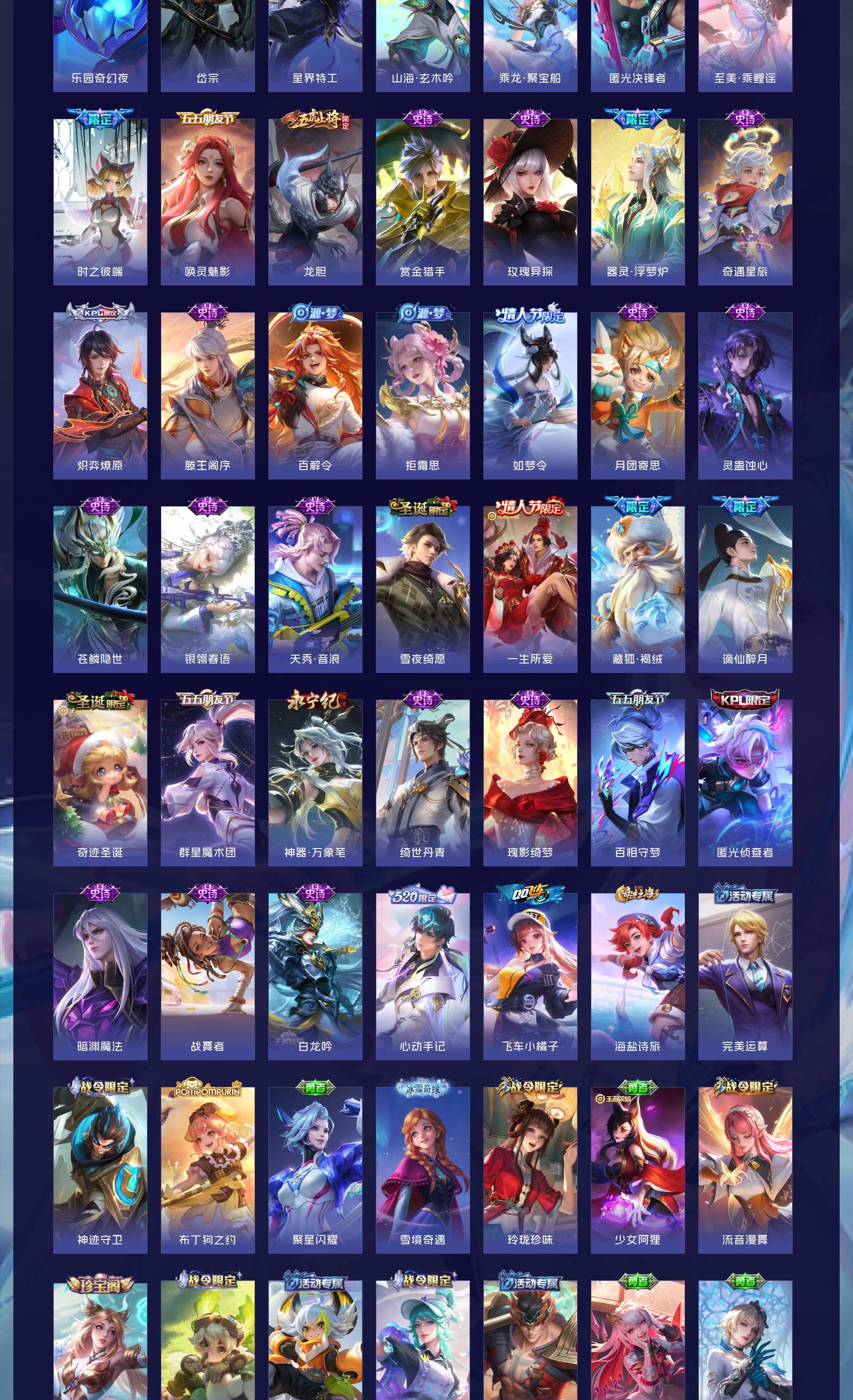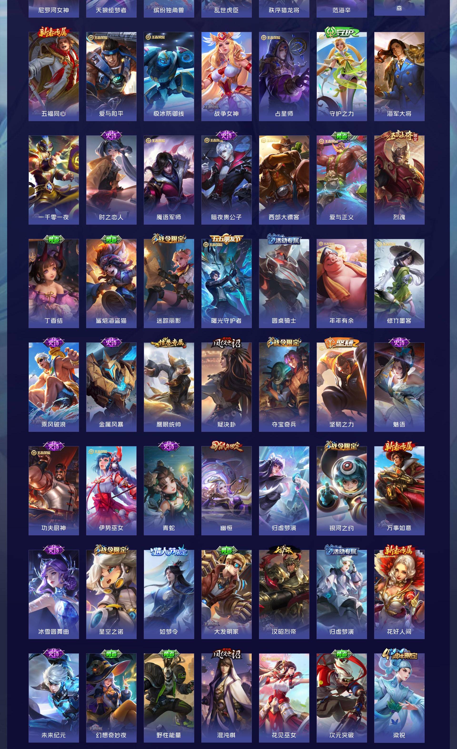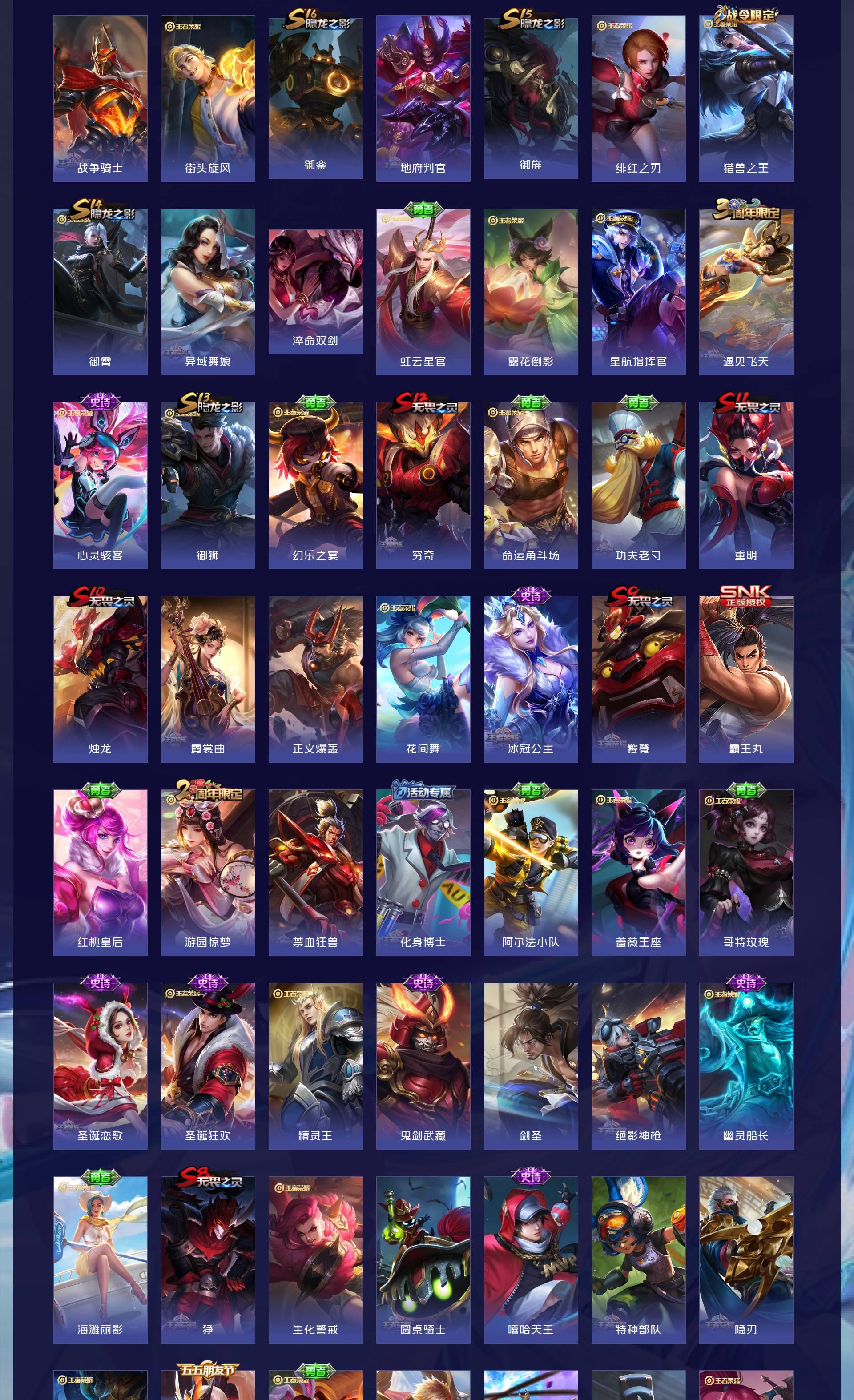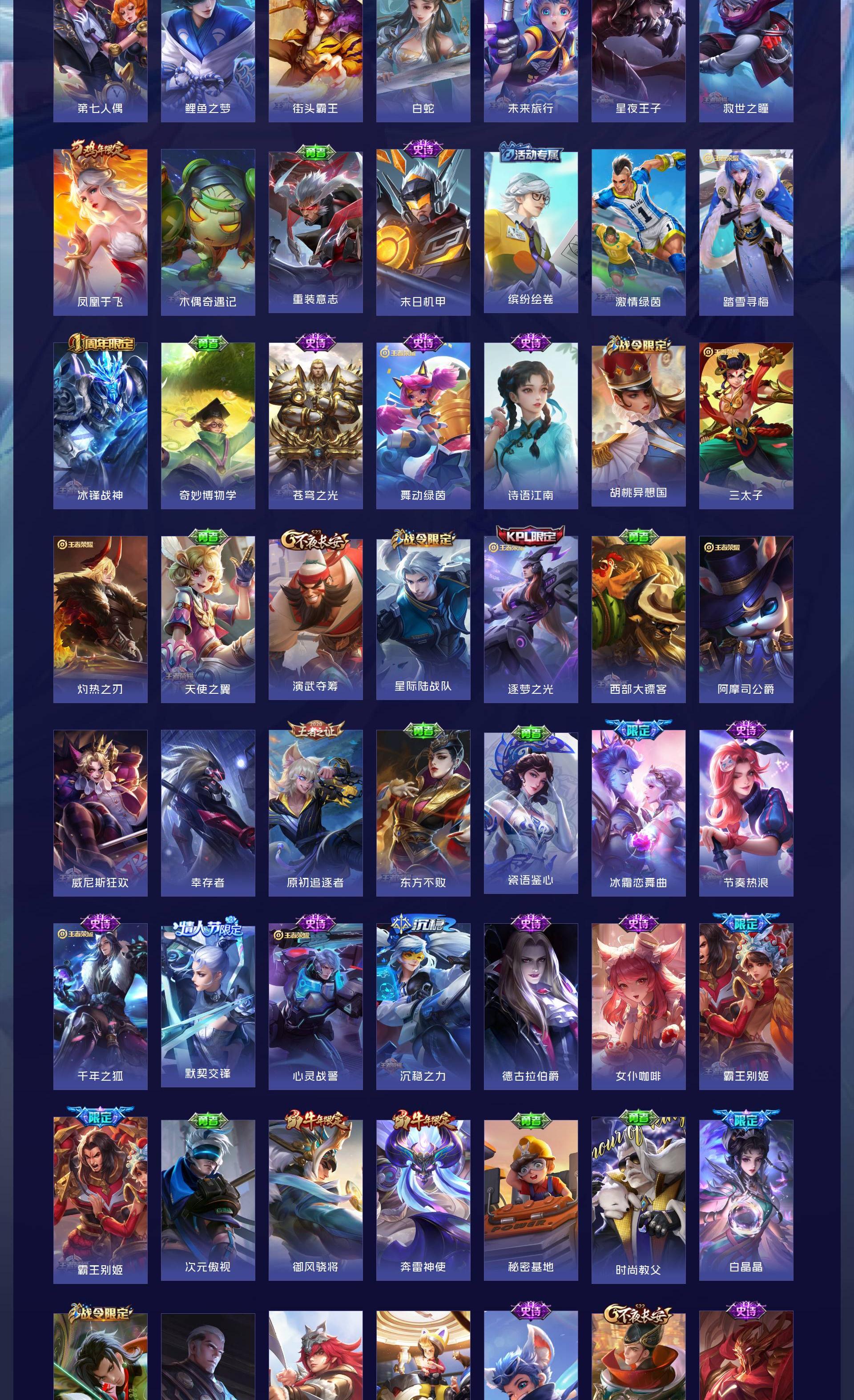 无双贵族 皮肤594 英雄129 传奇王者 荣耀典藏7 珍品无双1 无双皮肤12 珍品传说9 传说87 其他皮肤484