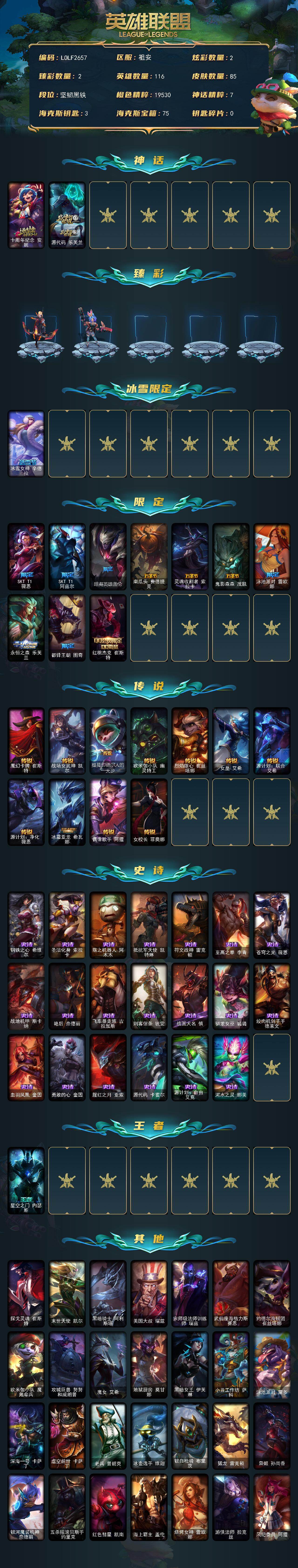 【LOLF2657】116英雄/85皮肤/2神话/11限定/2臻彩/2炫彩/11传说/20史诗/未定级/十周年纪念安妮/源代码乐芙兰/源计划联合艾希红莲之弓/幻灵战斗队长厄运小姐勇气赞歌/冰雪女神辛德拉/SKTT1薇恩/SKTT1阿兹尔/暗裔英雄盖伦/南瓜头费德提克/灵魂收割者索拉卡/鬼影森森茂凯/泳池派对蕾欧娜/永恒之森乐芙兰/都铎王朝图奇/红桃杰克崔斯特/魔幻卡牌崔斯特/战场女武神凯尔/提莫约德尔人的一大步/欧米伽小队幽灵特工/烈焰雄心崔丝塔娜/女皇艾希/源计划联合艾希/源计划净化薇恩/冰霜