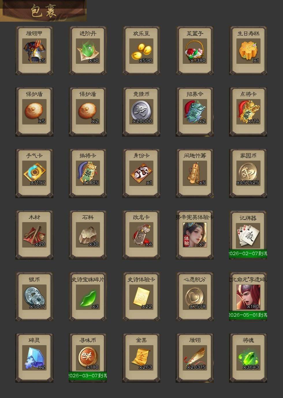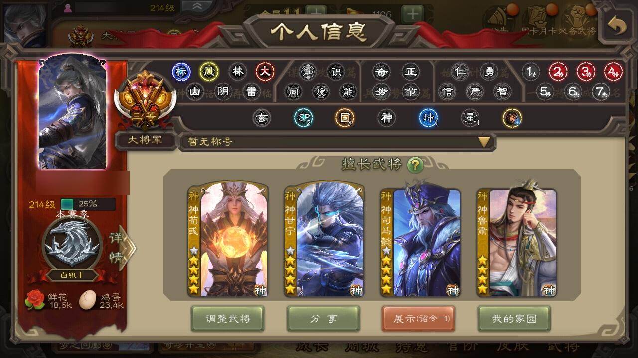 【1335】官阶:大将军;VIP等级:VIP11;史诗武将数量:36;动态皮肤数量:28;武将总数:344;史诗宝珠数量:0;将魂数量:3643;神将:6;魏国史诗武将:12;蜀国史诗武将:7;吴国史诗武将:4;群史诗武将:10