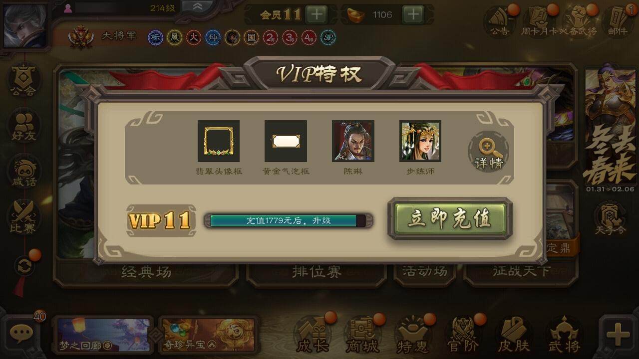 【1335】官阶:大将军;VIP等级:VIP11;史诗武将数量:36;动态皮肤