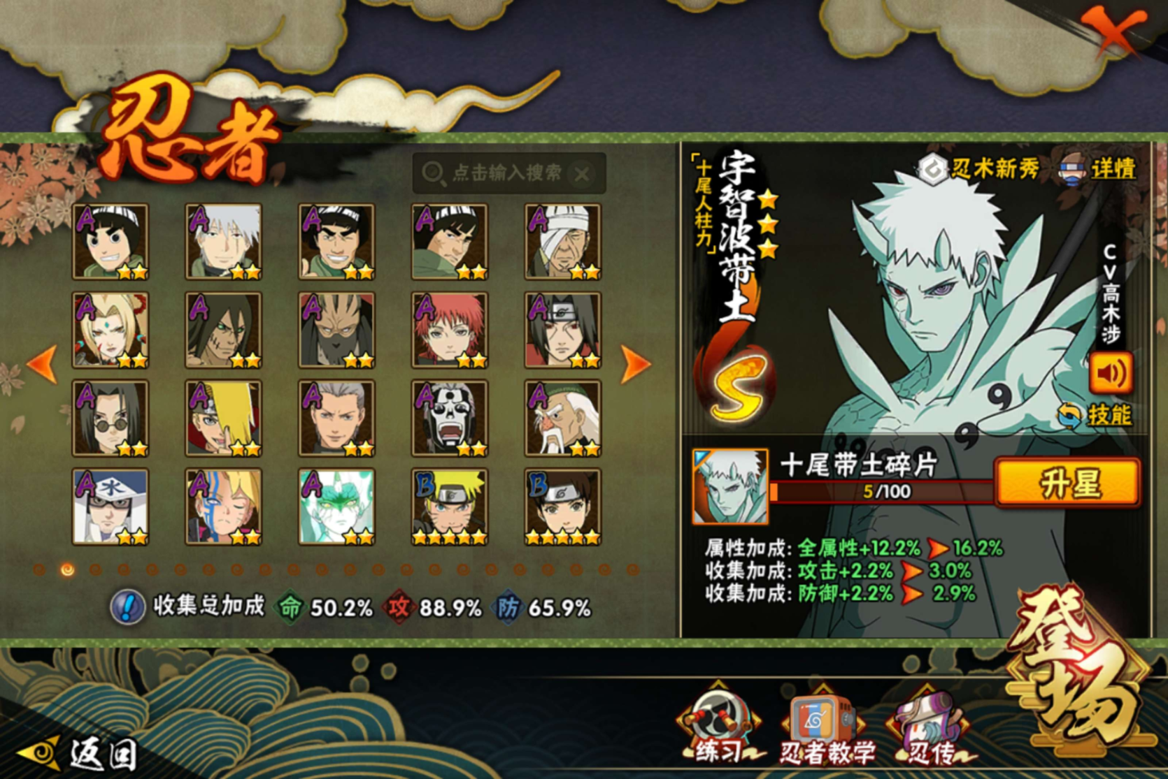 【S级忍者】旗木卡卡西「须佐能乎」(3星),自来也「传说中的三忍」(3星),大筒木舍人「最终章」(3星),宇智波斑「秽土转生·解」(3星),宇智波佐助「永恒万花筒」(3星),大筒木桃式(3星),宇智波斑「白面具」(3星),自来也「舞之豪杰」(3星),宇智波带土「十尾人柱力」