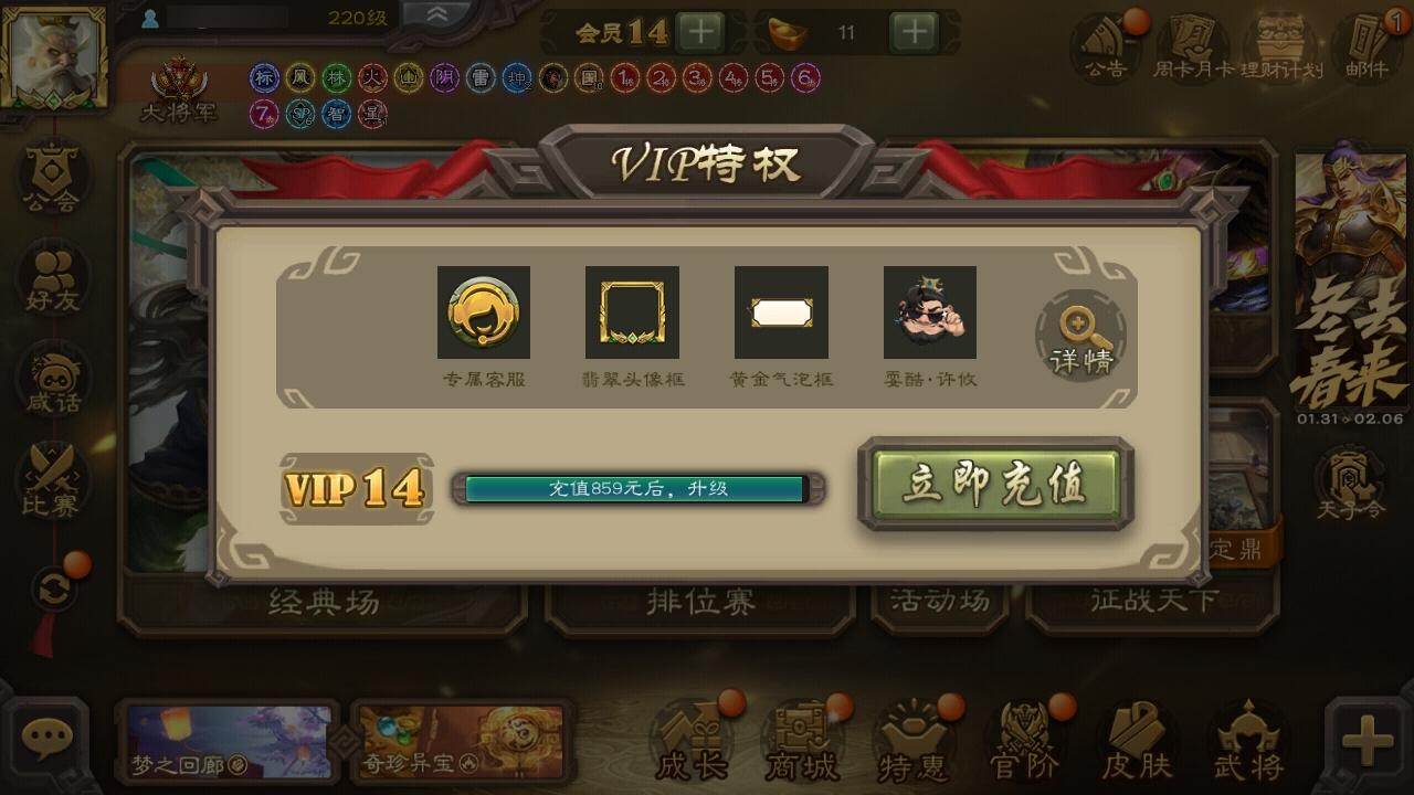 【1346】官阶:大将军;VIP等级:VIP14;史诗武将数量:66;动态皮肤