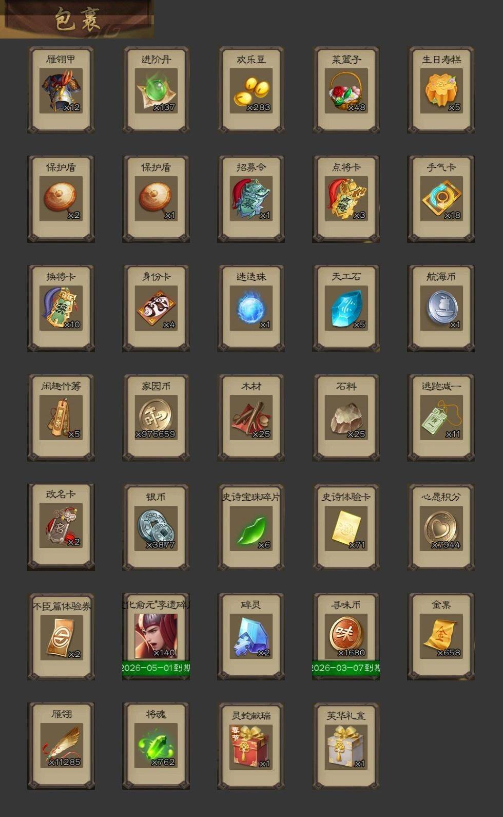 【1346】官阶:大将军;VIP等级:VIP14;史诗武将数量:66;动态皮肤数量:59;武将总数:427;史诗宝珠数量:0;将魂数量:762;神将:9;魏国史诗武将:38;蜀国史诗武将:9;吴国史诗武将:8;群史诗武将:23