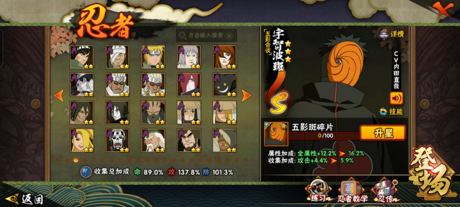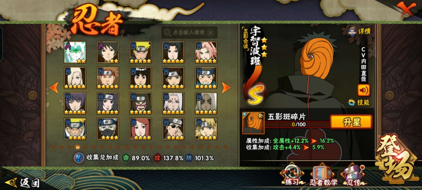 【S级忍者】宇智波带土「忍界大战」(3星),迈特凯「死门」(3星),自来也「传说中的三忍」(3星),大筒木舍人「最终章」(3星),漩涡鸣人「暴怒·第六尾」(3星),宇智波斑「秽土转生·解」(3星),宇智波佐助「永恒万花筒」(3星),春野樱「忍界大战」(3星),千手柱间「秽土转生」(3星),漩涡鸣人「九喇嘛连结」(