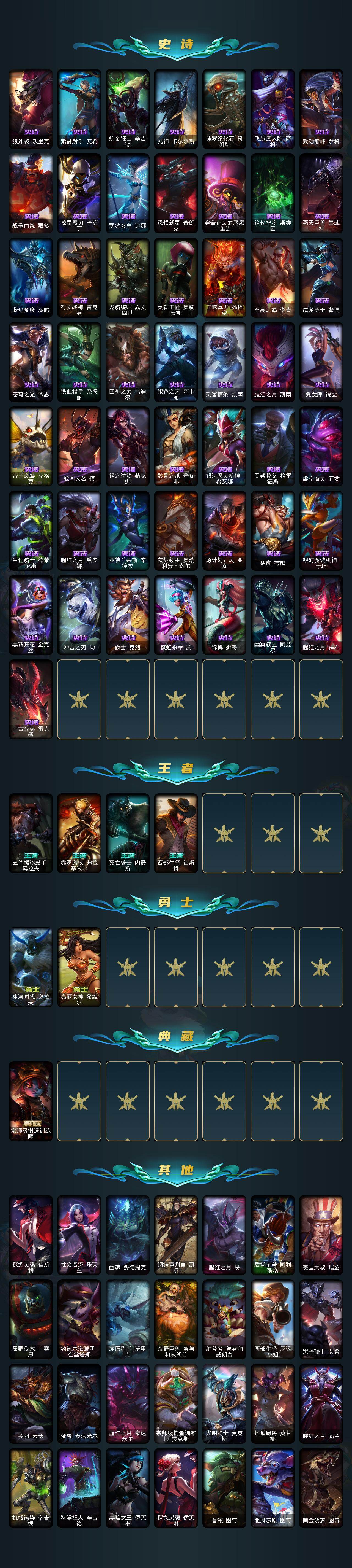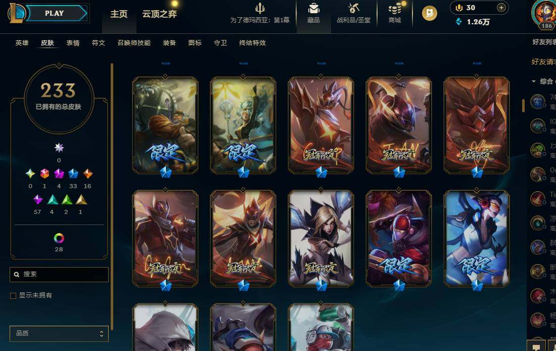 172英雄/233皮肤/1终极/4神话/33限定/8臻彩/33炫彩/16传说/57史诗/未定级账号等级:186/