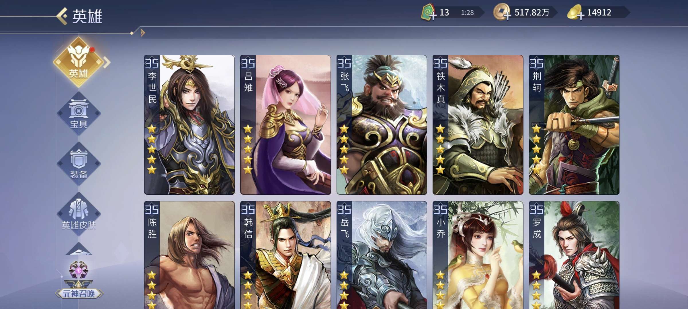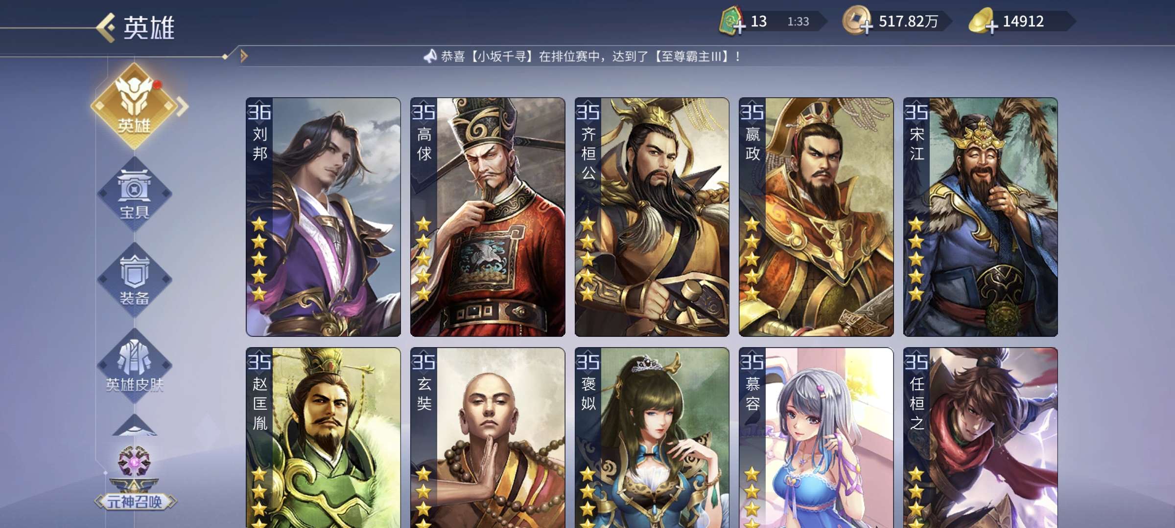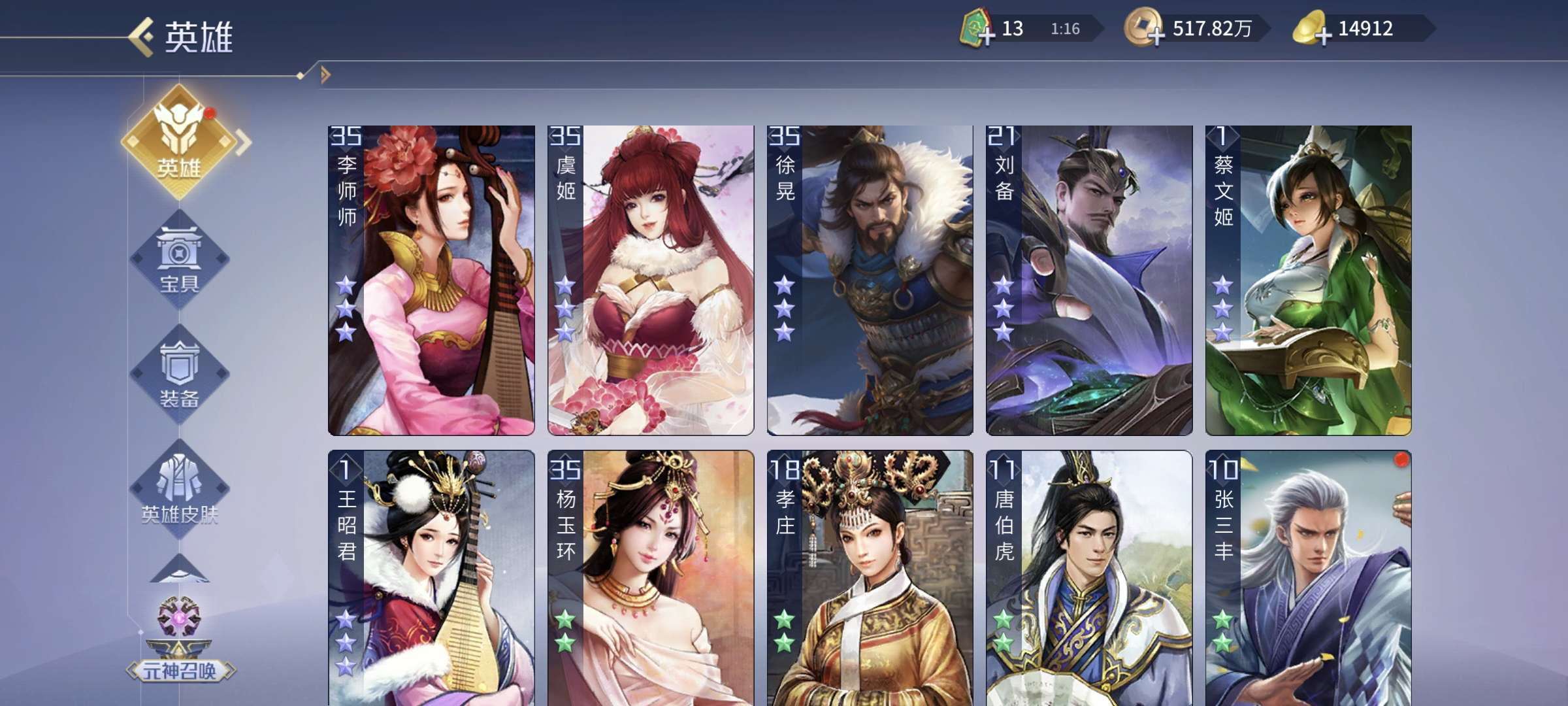 4侠2傲3控3御1蝶1火神,4贪2强化5吸血,其他英雄基本全部5星。