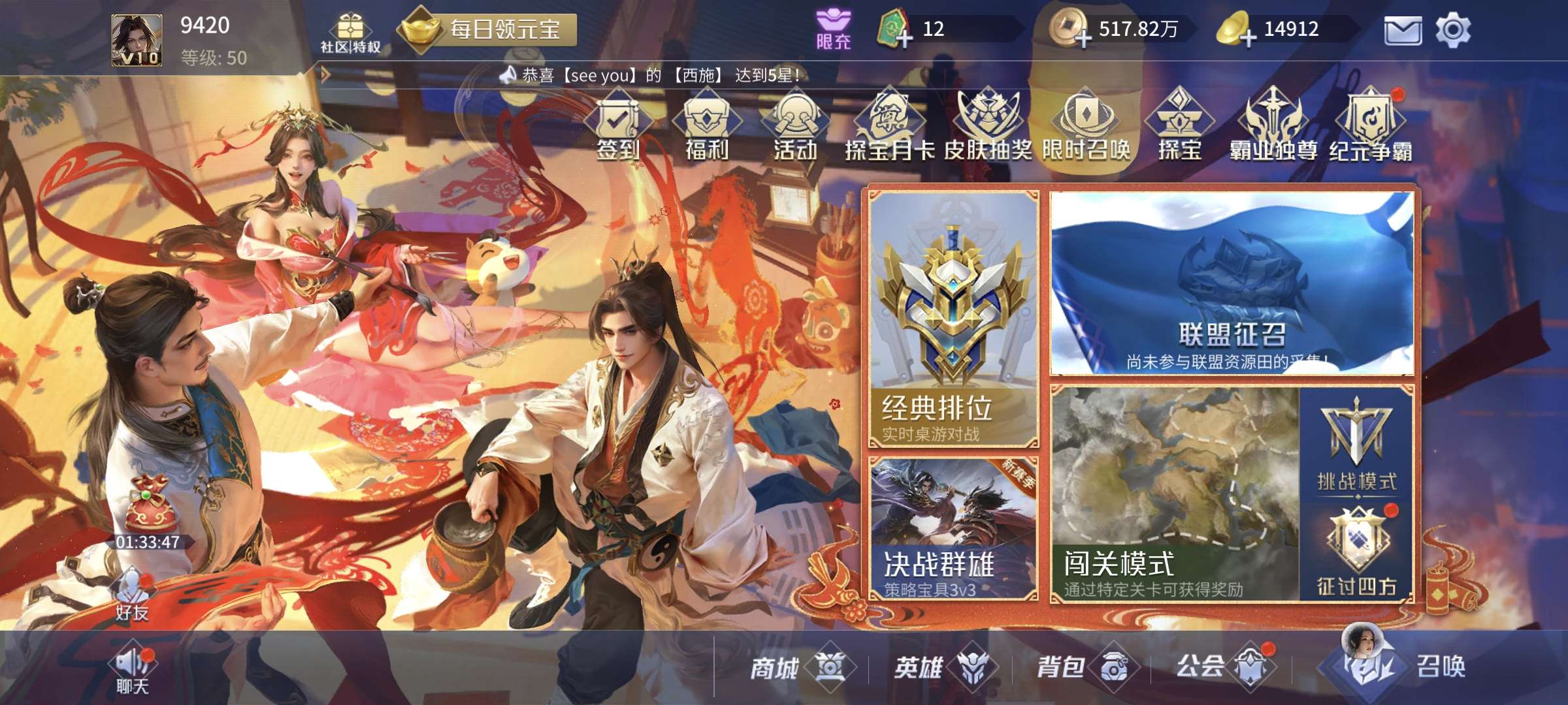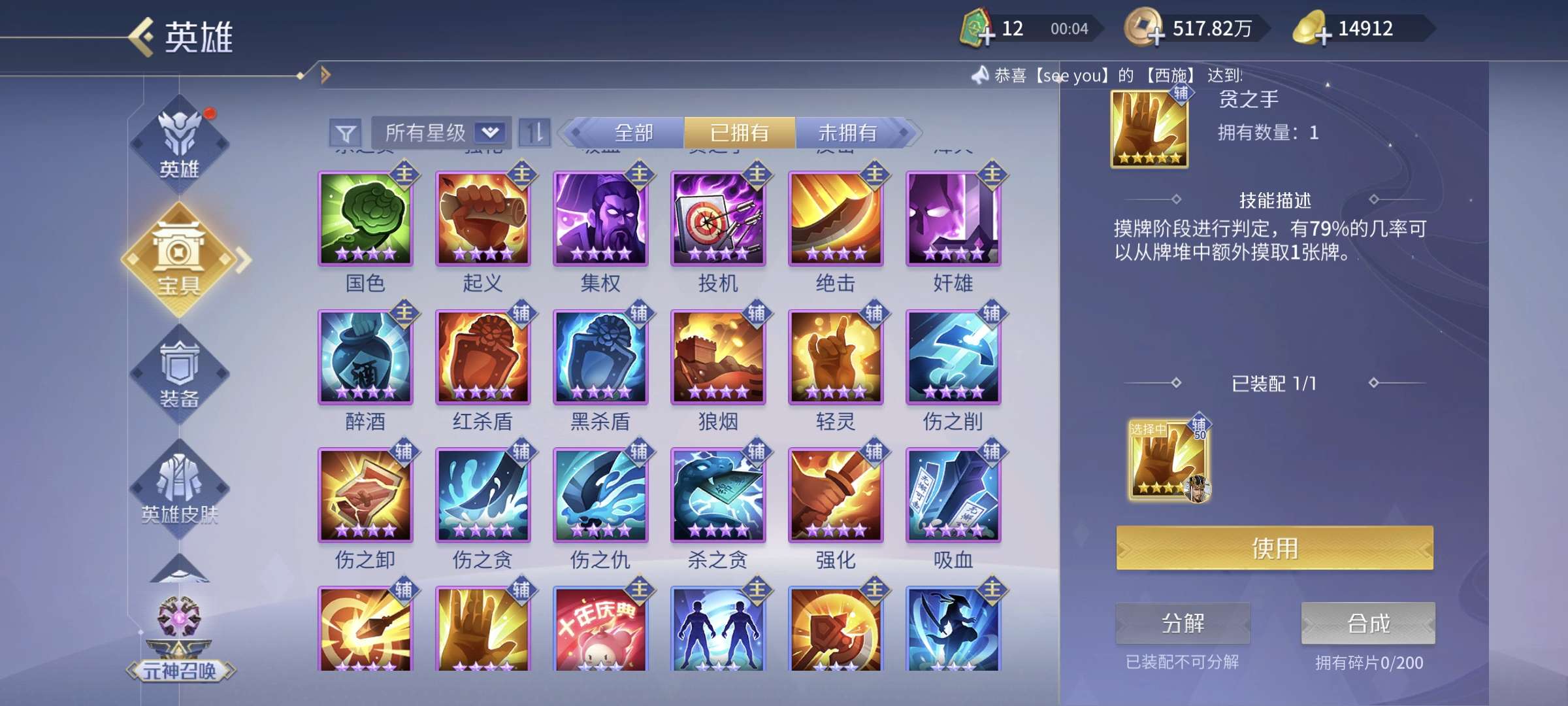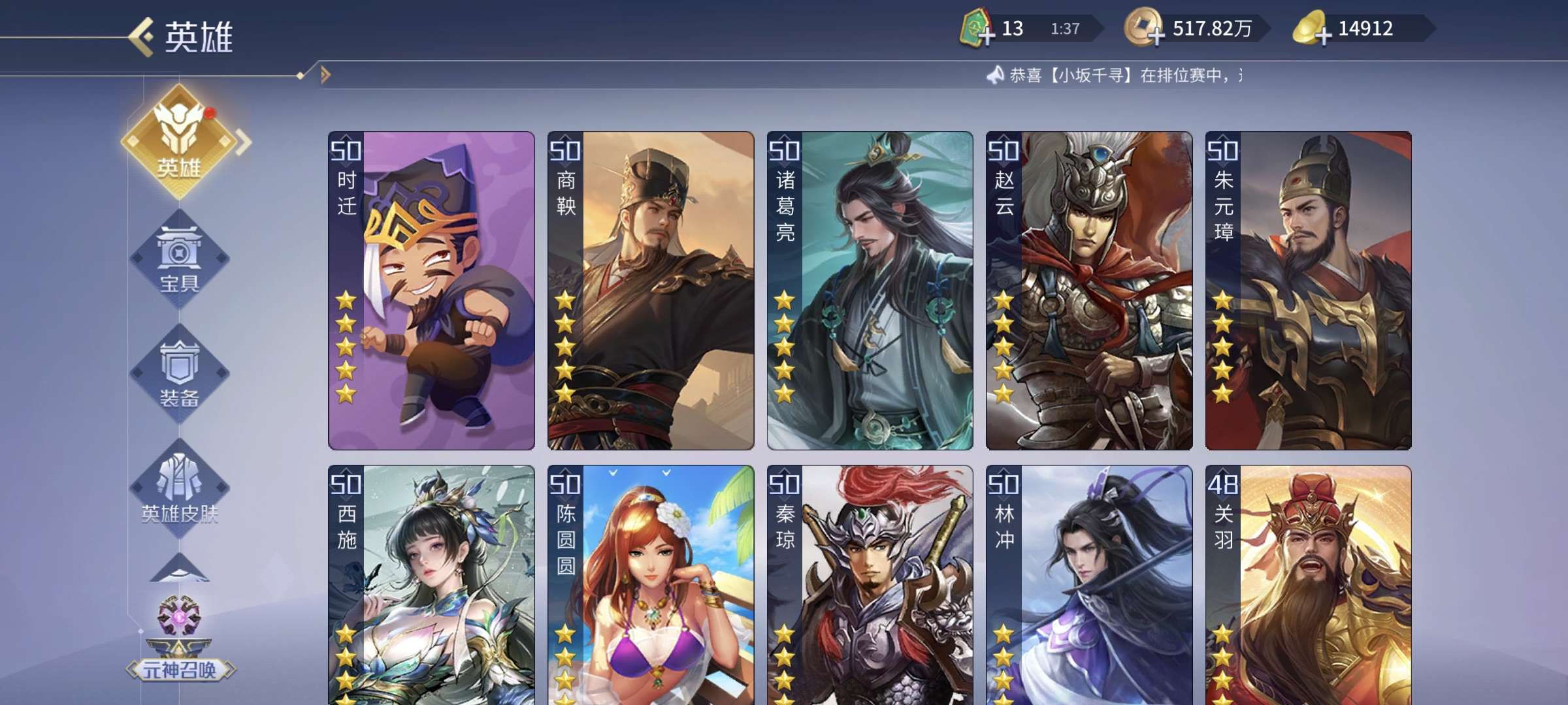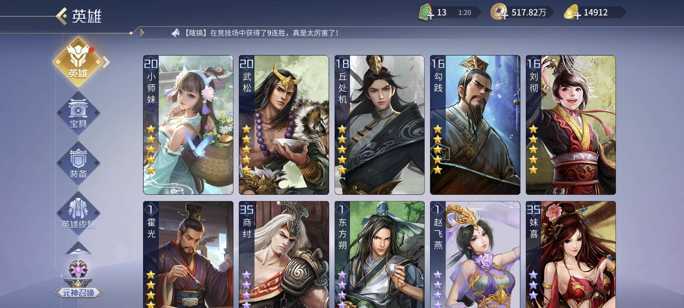 4侠2傲3控3御1蝶1火神,4贪2强化5吸血,其他英雄基本全部5星。