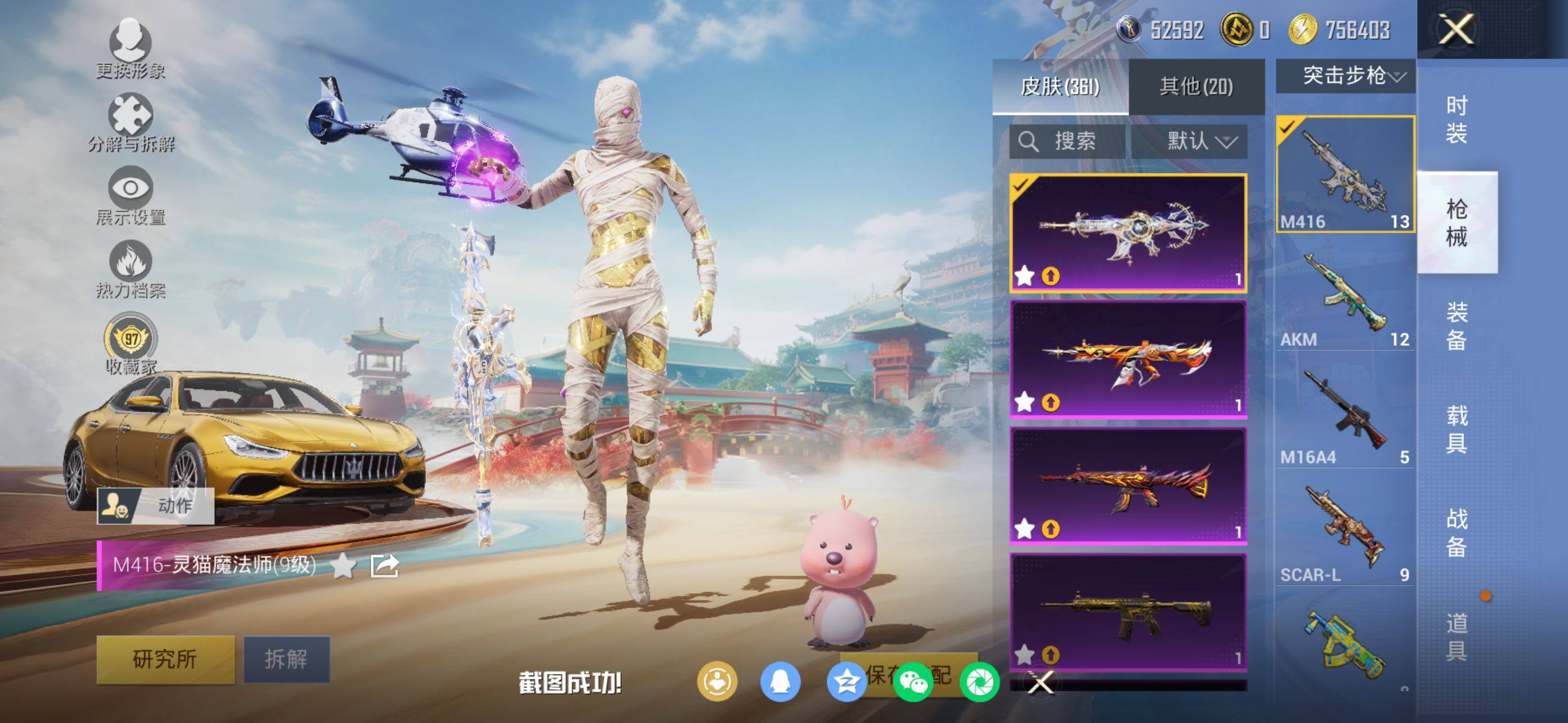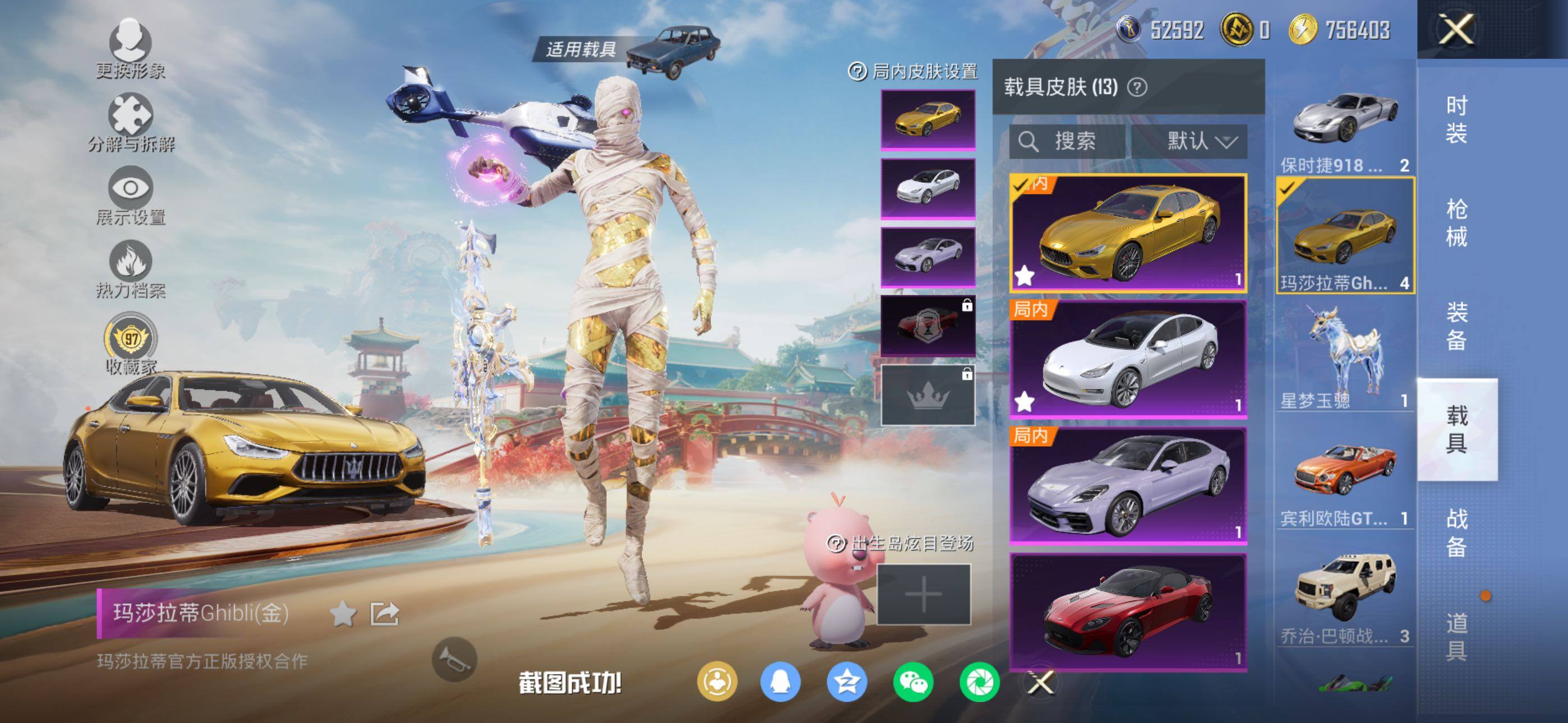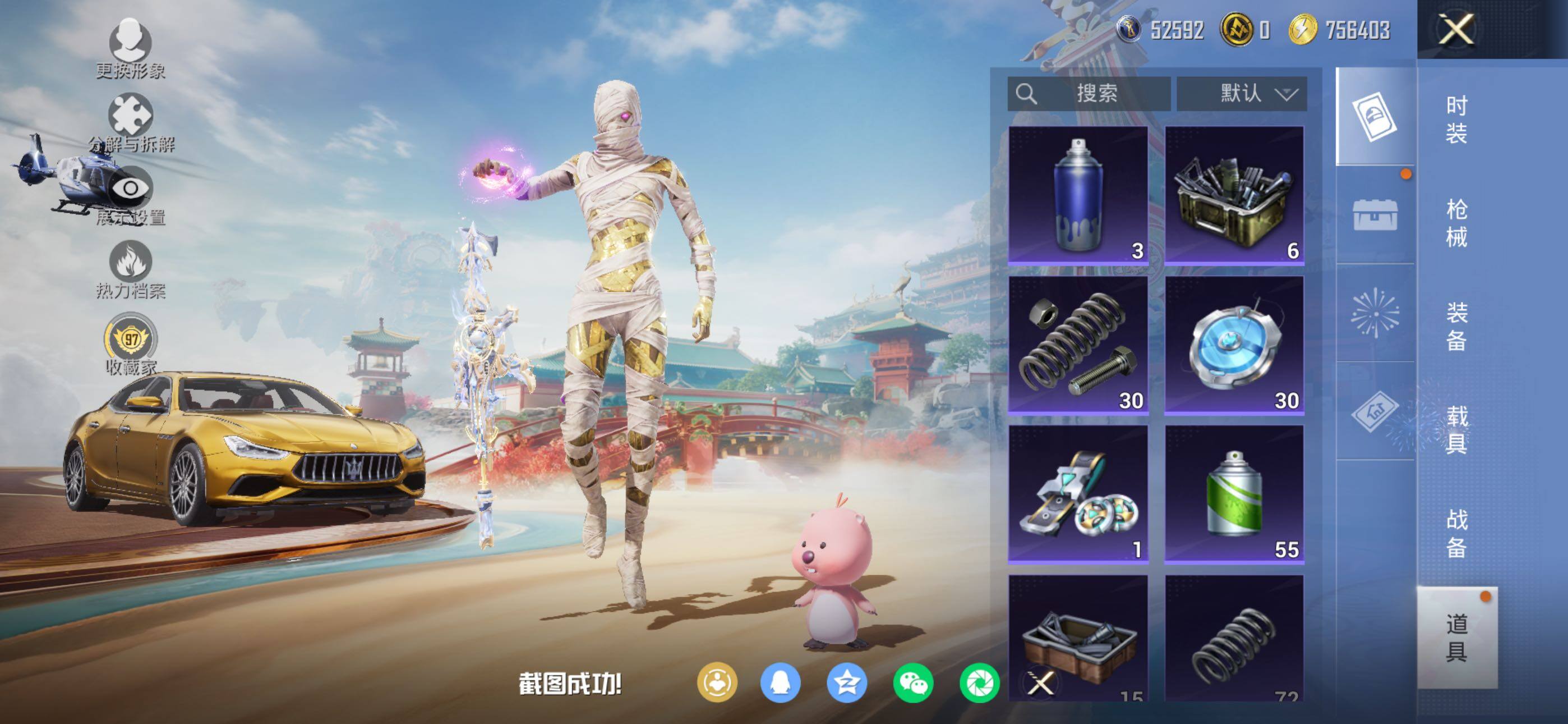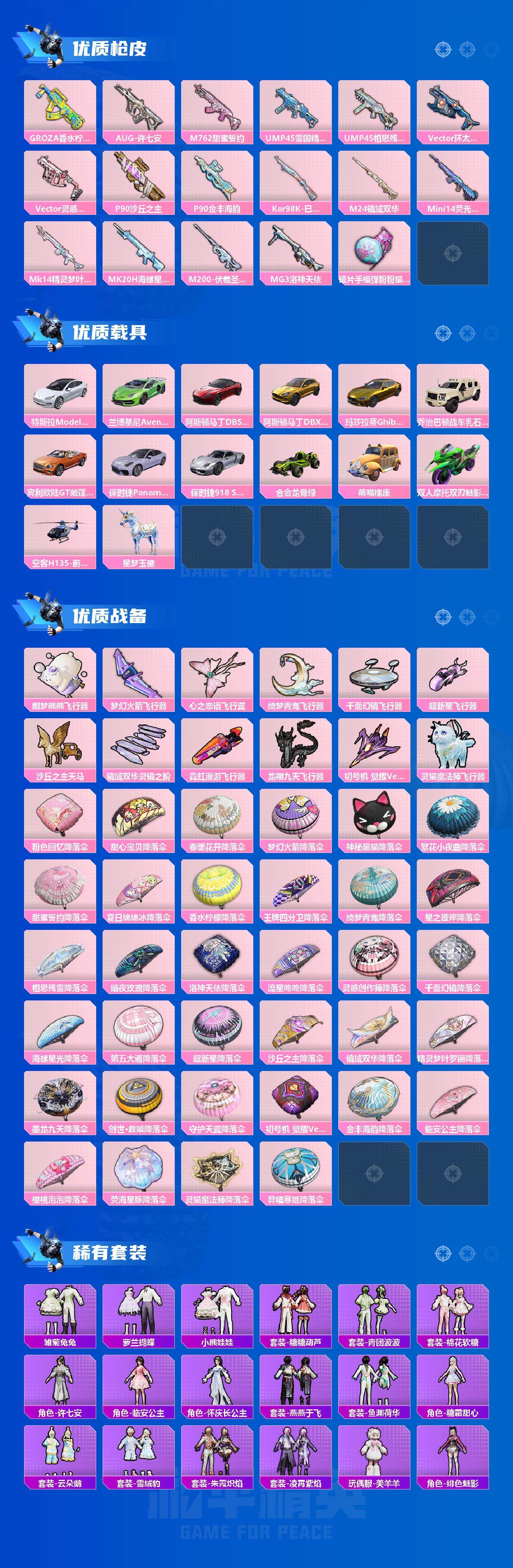 苹果 微信-无敌战神框-3神装-32粉装-30特效枪-14载具-13粉色飞行器-168128热力值-22王牌印记-252套装-361枪皮